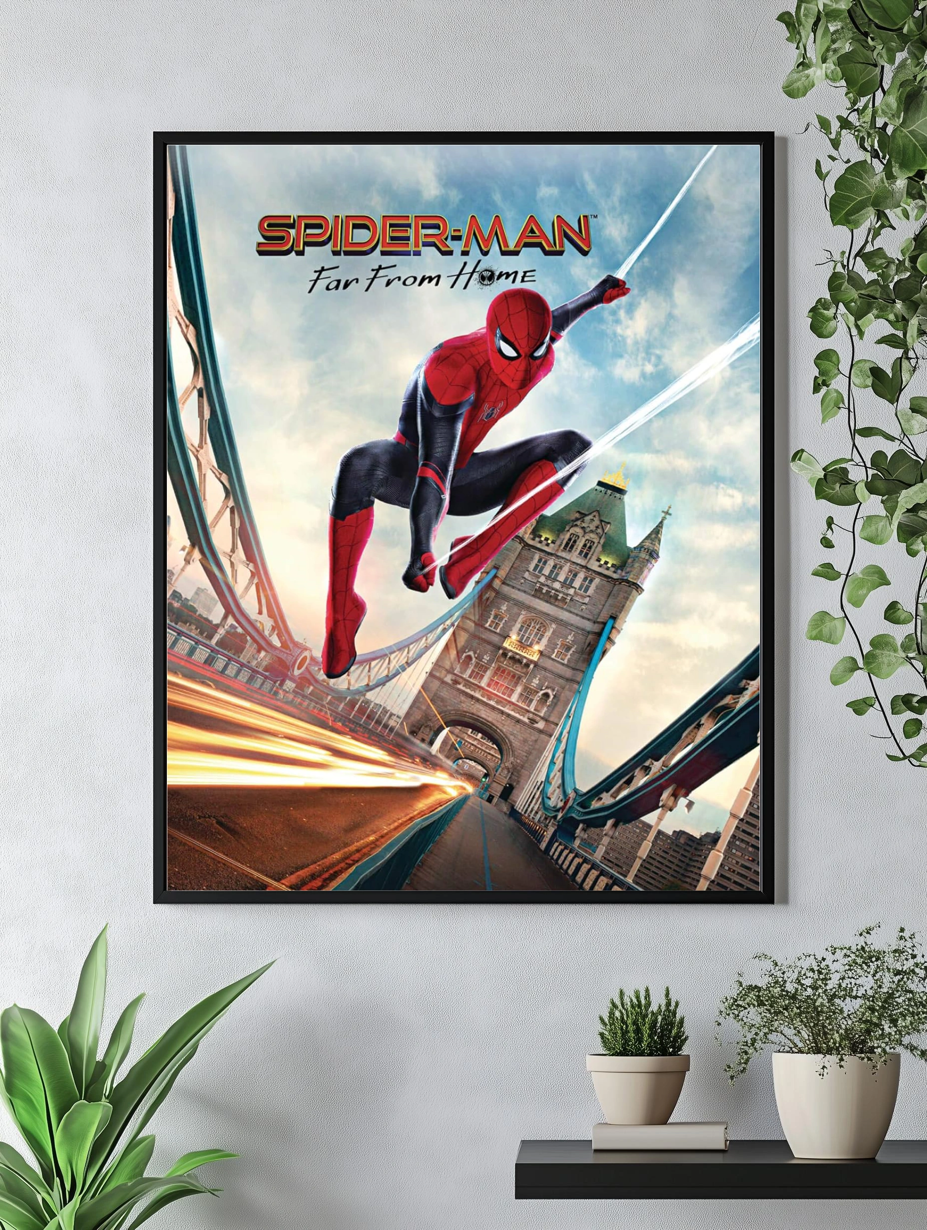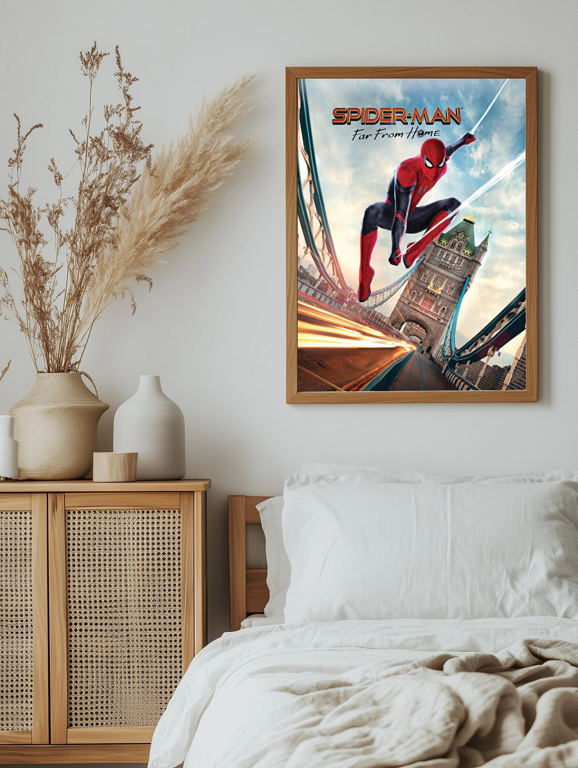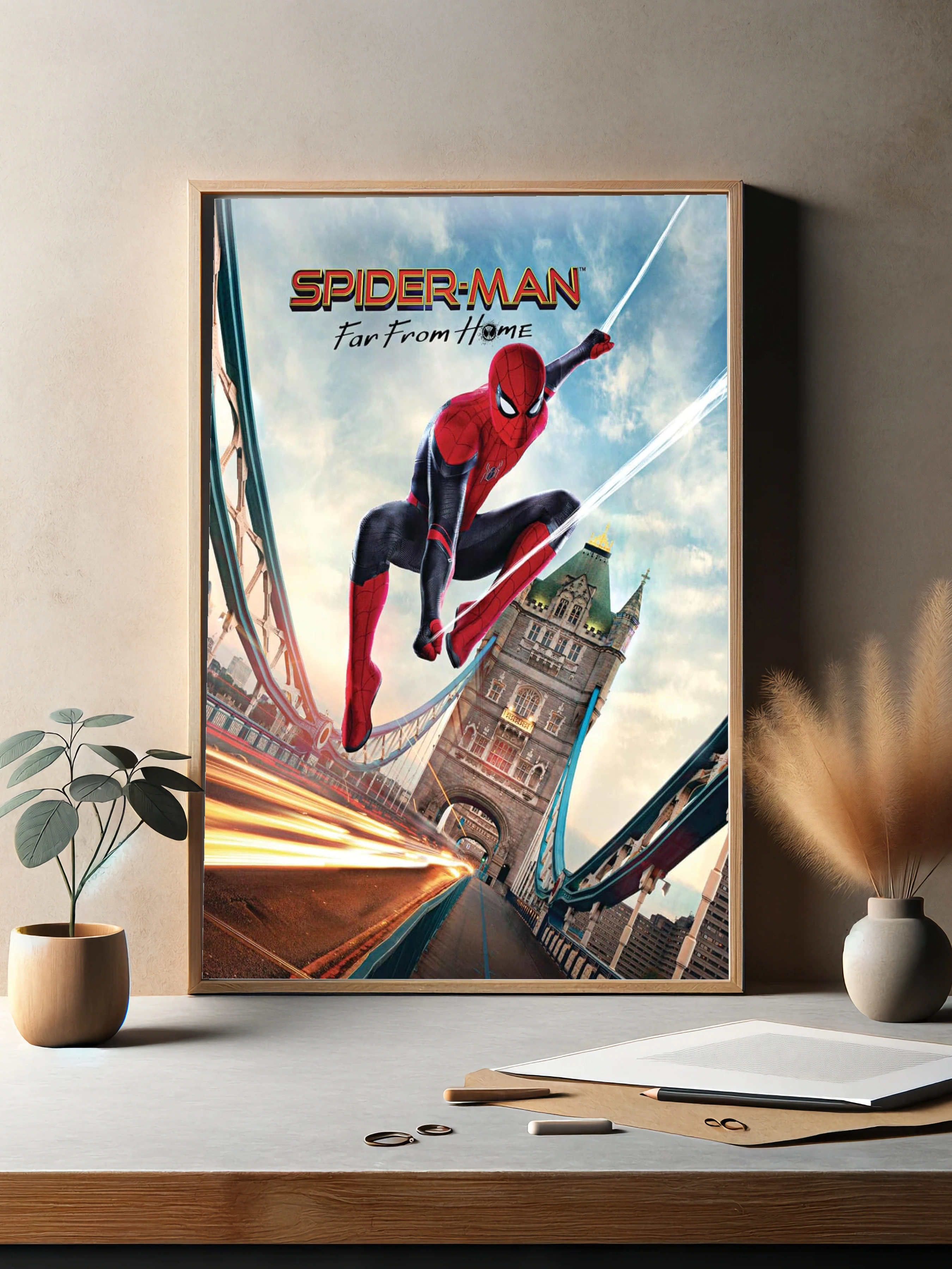 Этот интерьерный постер представляет Человека-паука в красно-синем костюме, который летит на паутине над Тауэрским мостом в Лондоне. Движение, динамика и городская архитектура создают напряжённое и захватывающее настроение. Картина для гостиной или офиса, красочная и стильная, подойдёт как уникальный декор стен.