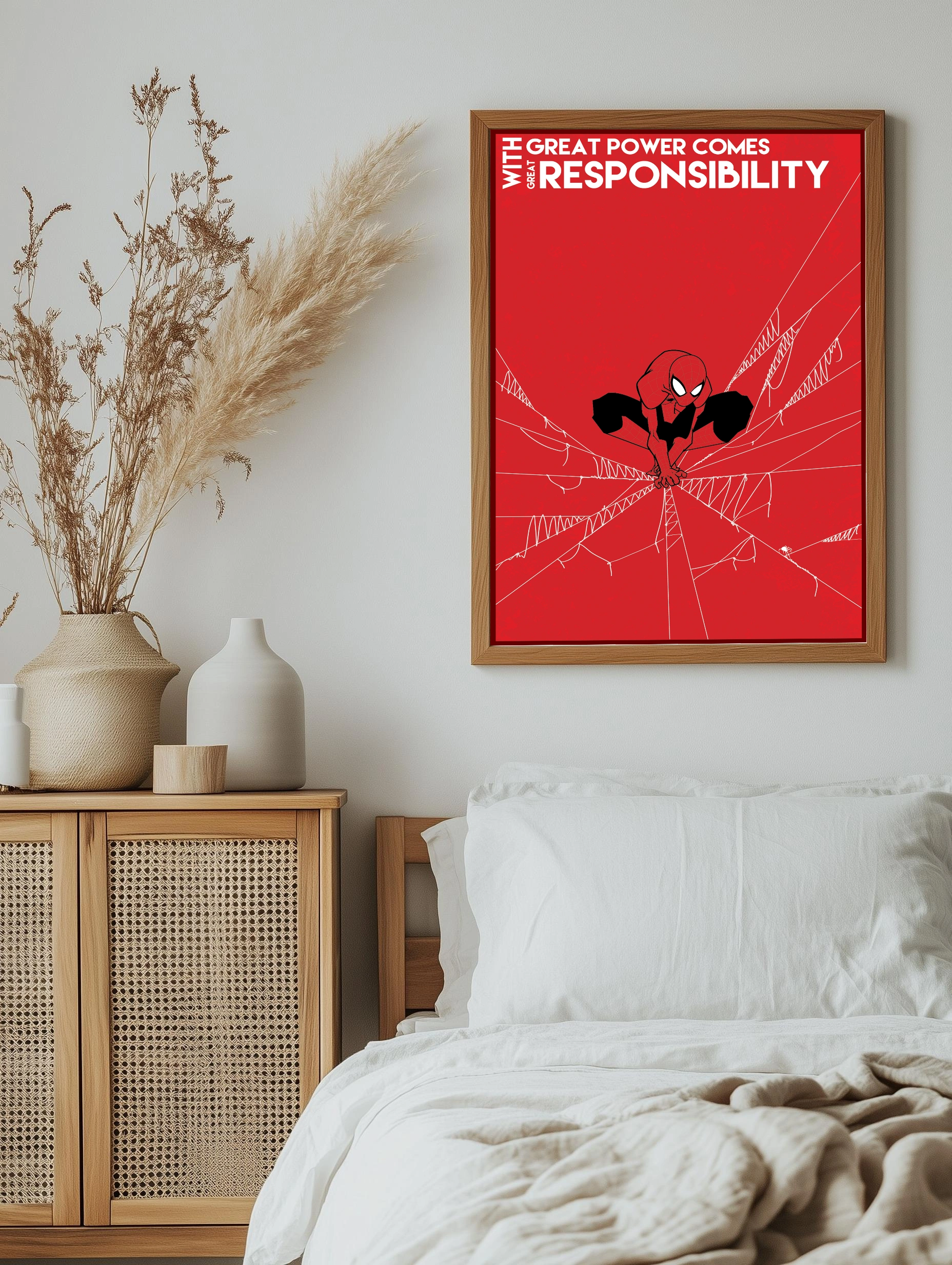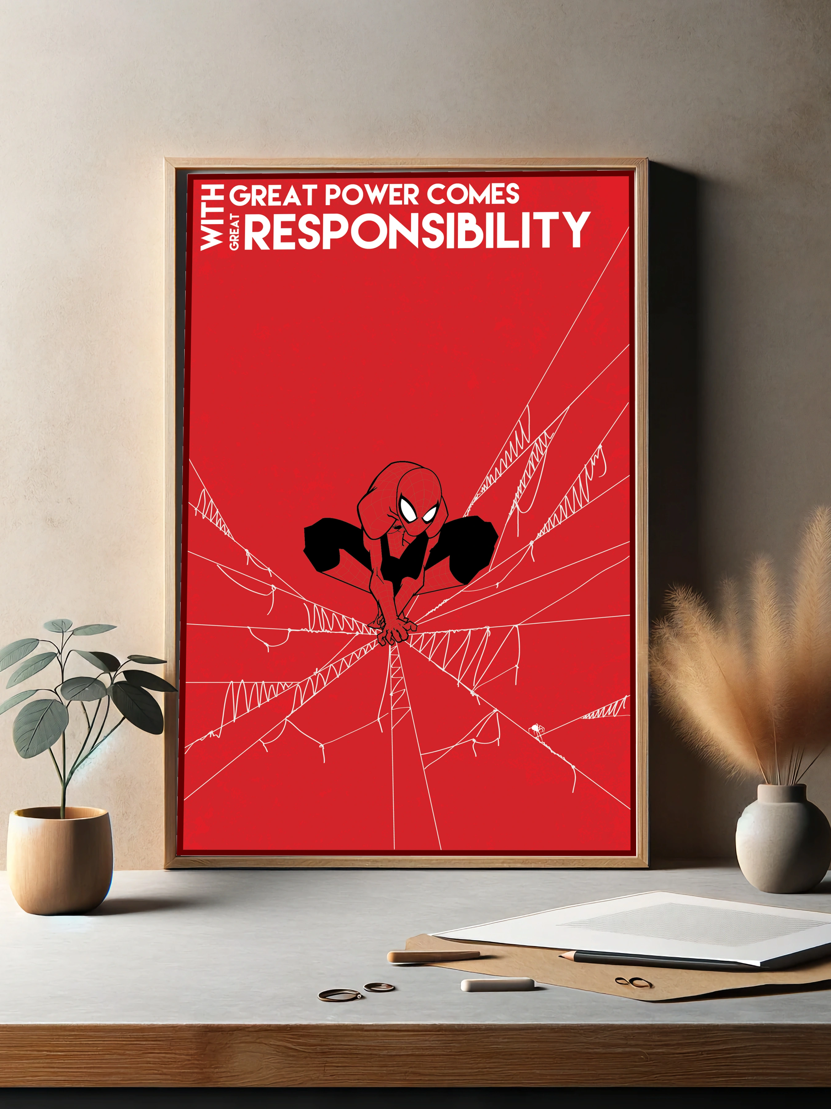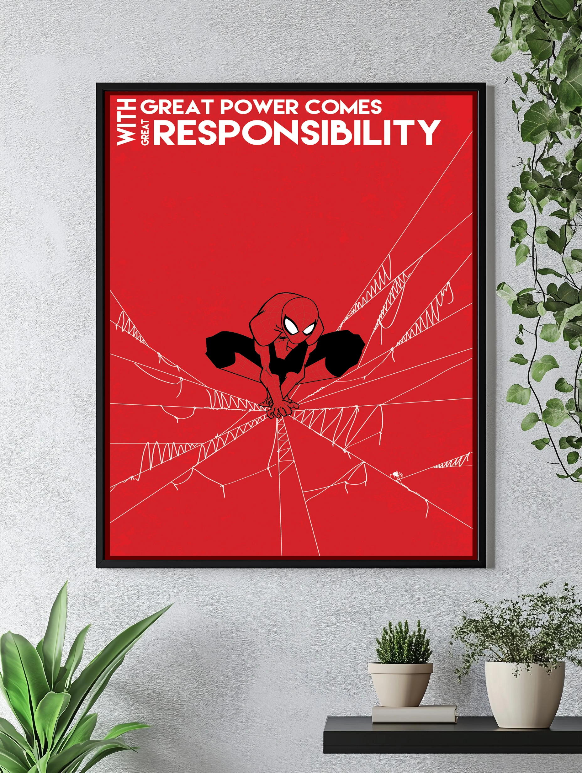 Этот художественный постер на стену с изображением Человека-Паука демонстрирует его фирменный красно-чёрный костюм в динамической позе среди паутины на ярко-красном фоне. Надпись «With great power comes great responsibility» подчёркивает философию героя. Идеальный современный интерьерный постер для гостиной или офиса.