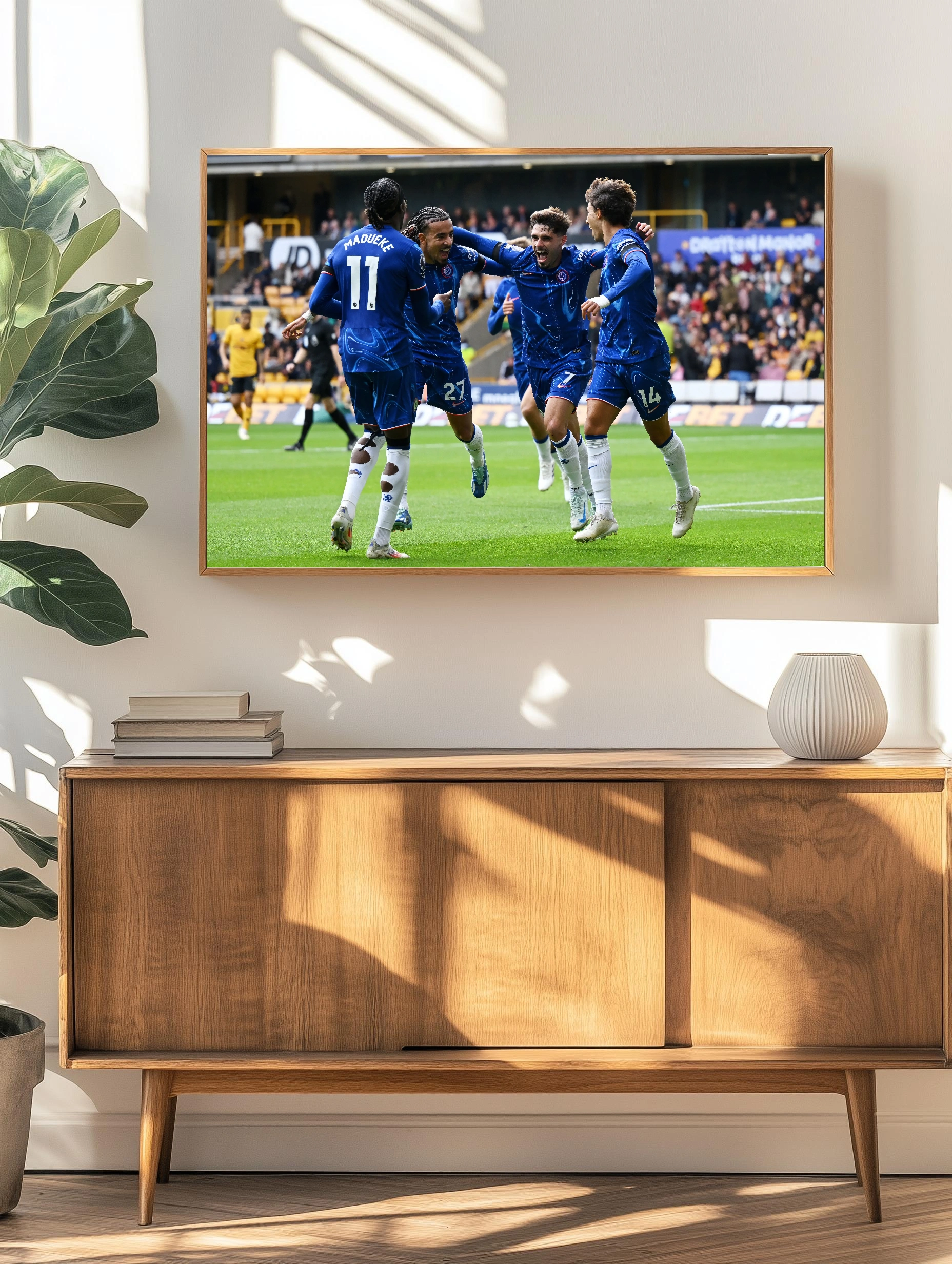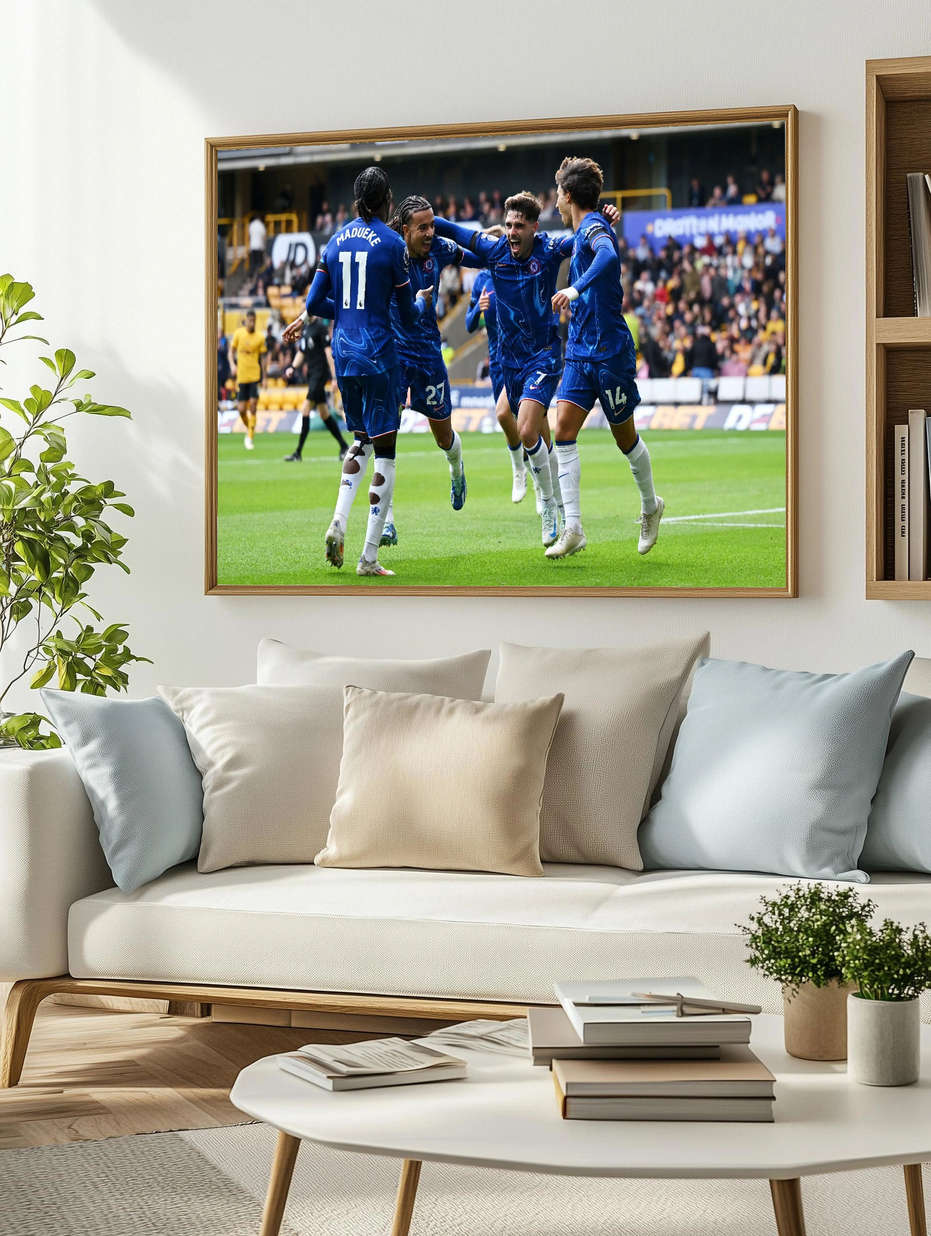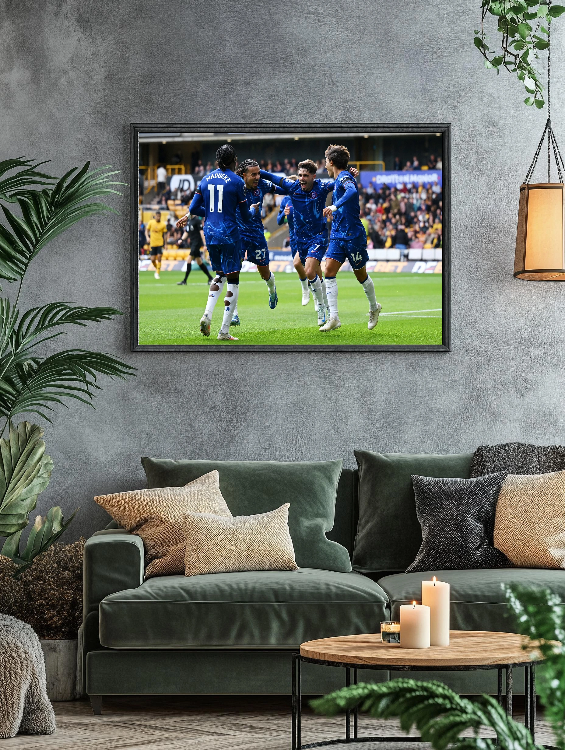 На изображении команда футбольного клуба Челси в ярко-синих формах празднует гол на зелёном поле в крупном спортивном стадионе с трибунами, заполненными зрителями. Фото передаёт эмоциональный момент радости и командного единства во время матча, подчёркивая динамику и атмосферу спортивного события. Это отличный интерьерный плакат для любителей футбола, праздничный и энергичный декоративный плакат с реалистичным снимком.