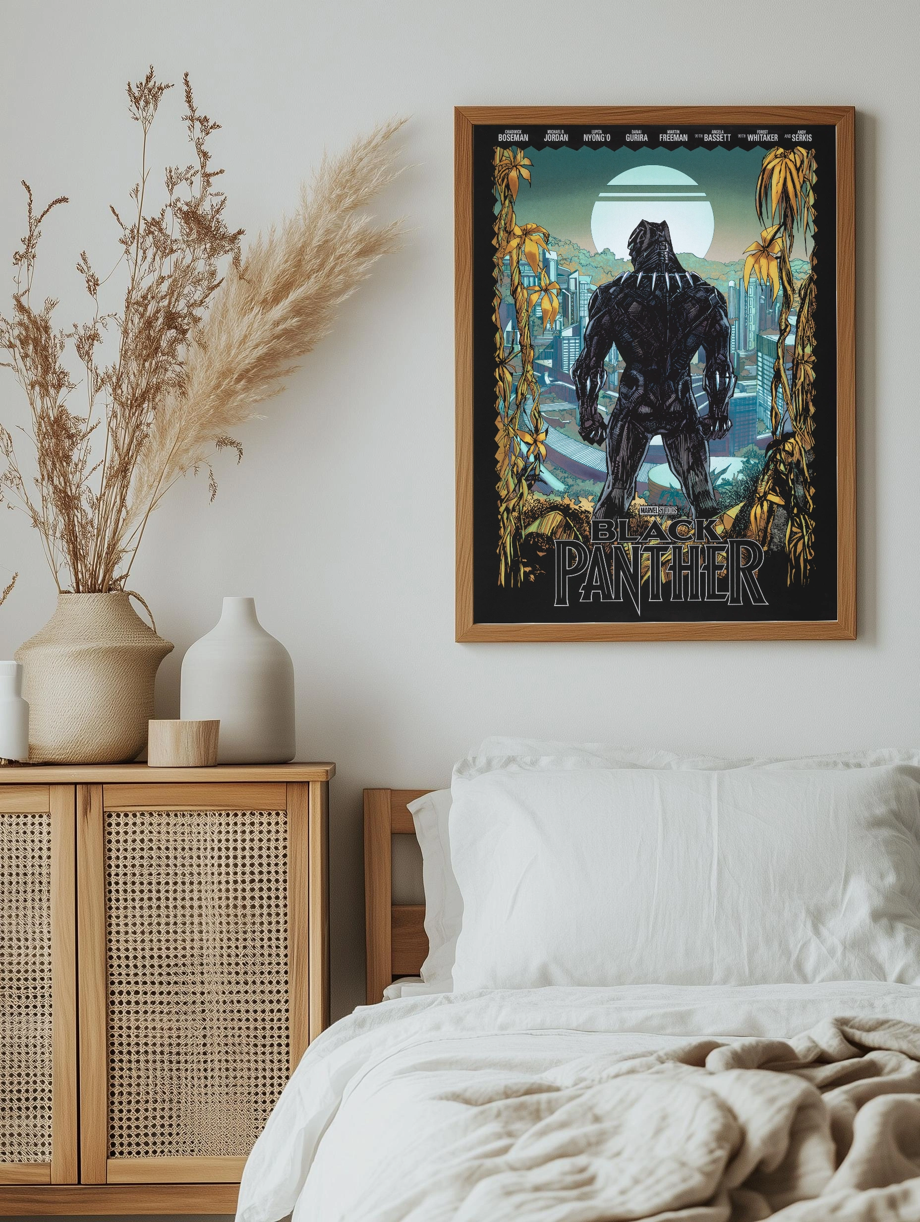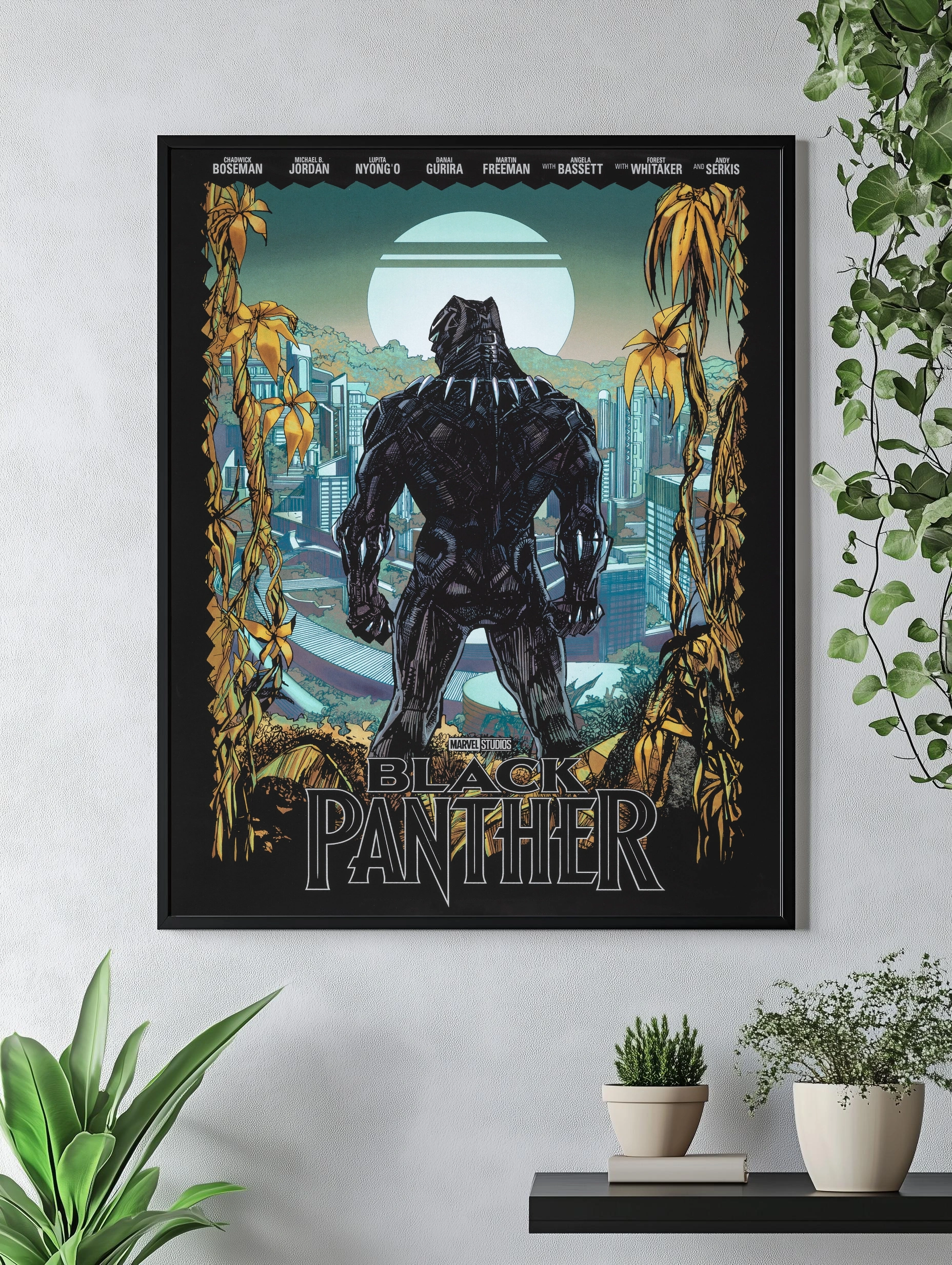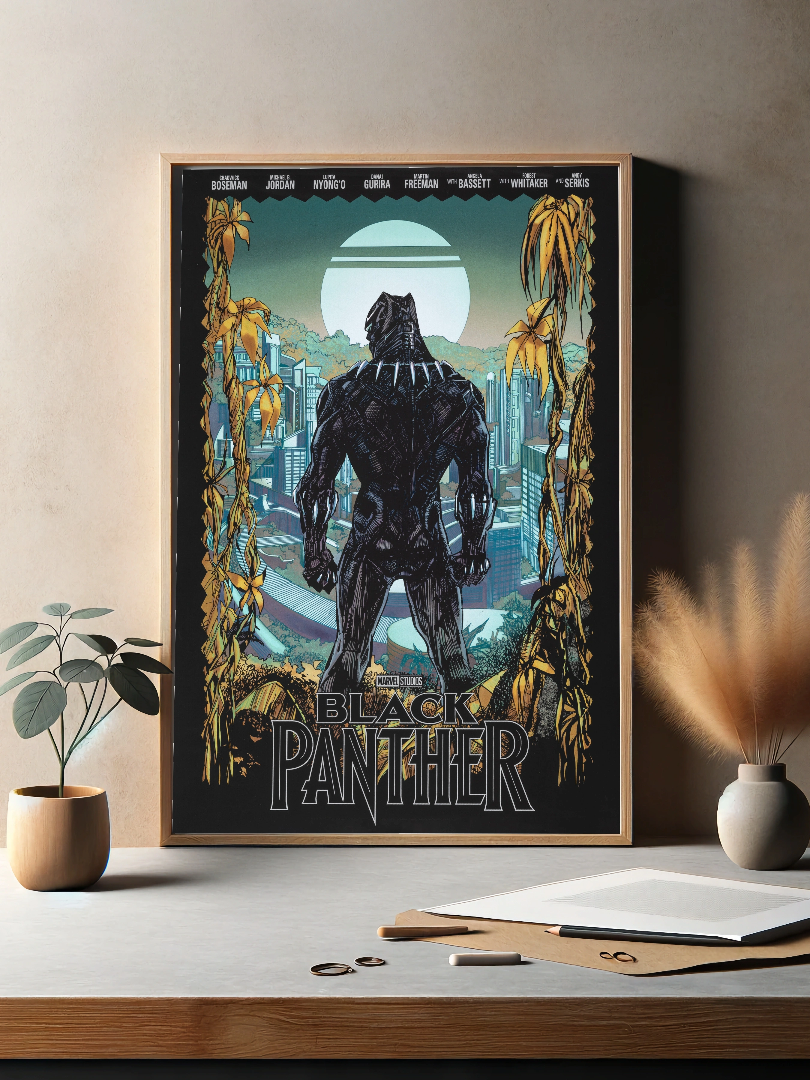 Изображение легендарного супергероя Черная Пантера из студии Marvel, смотрящего на ночной городской пейзаж. Стиль арт с яркими контурами и детализацией, оттенки черного и синего контрастируют с желтыми листьями на переднем плане. Идеально для интерьерного декора и стильного оформления стен.
