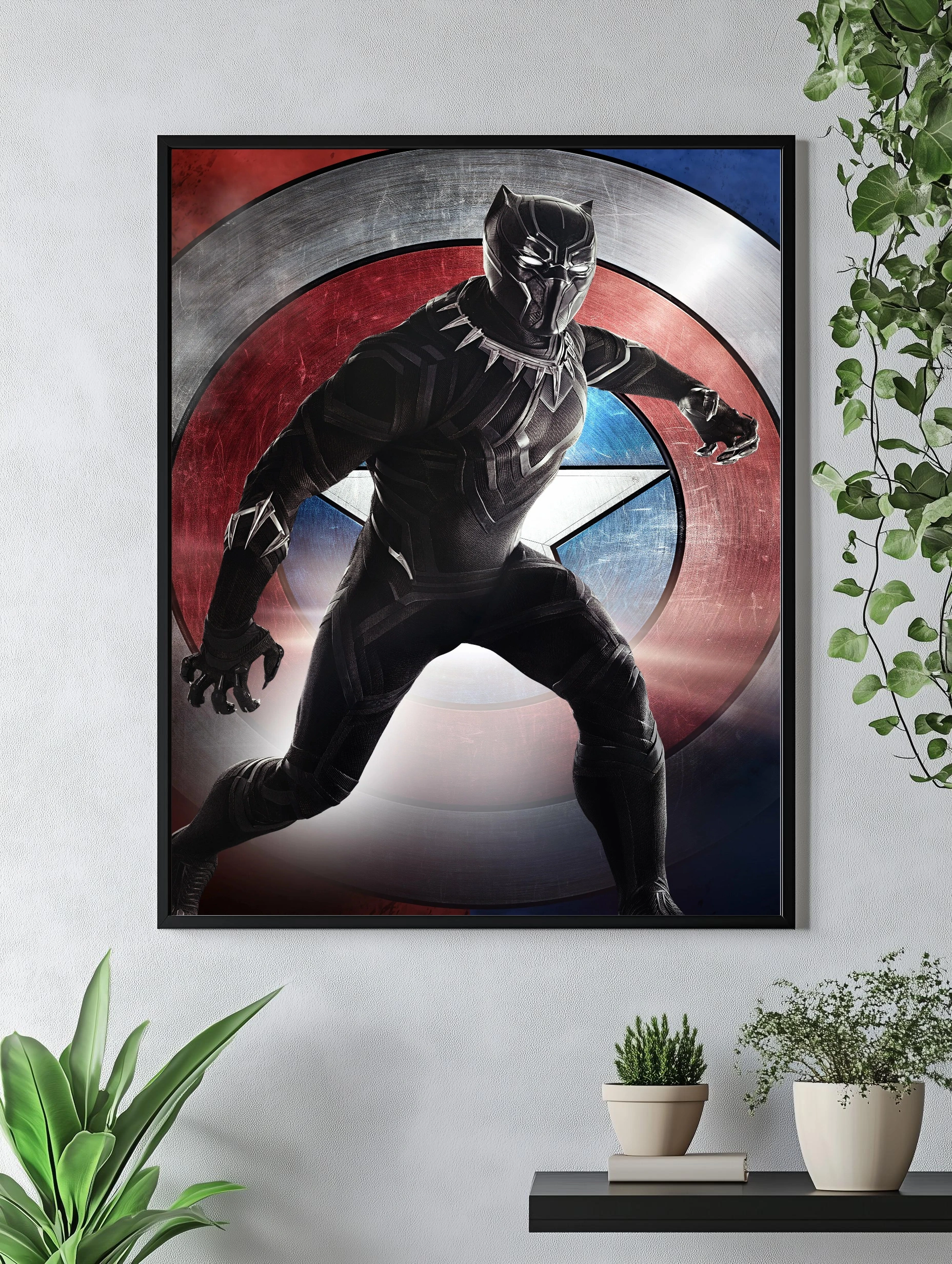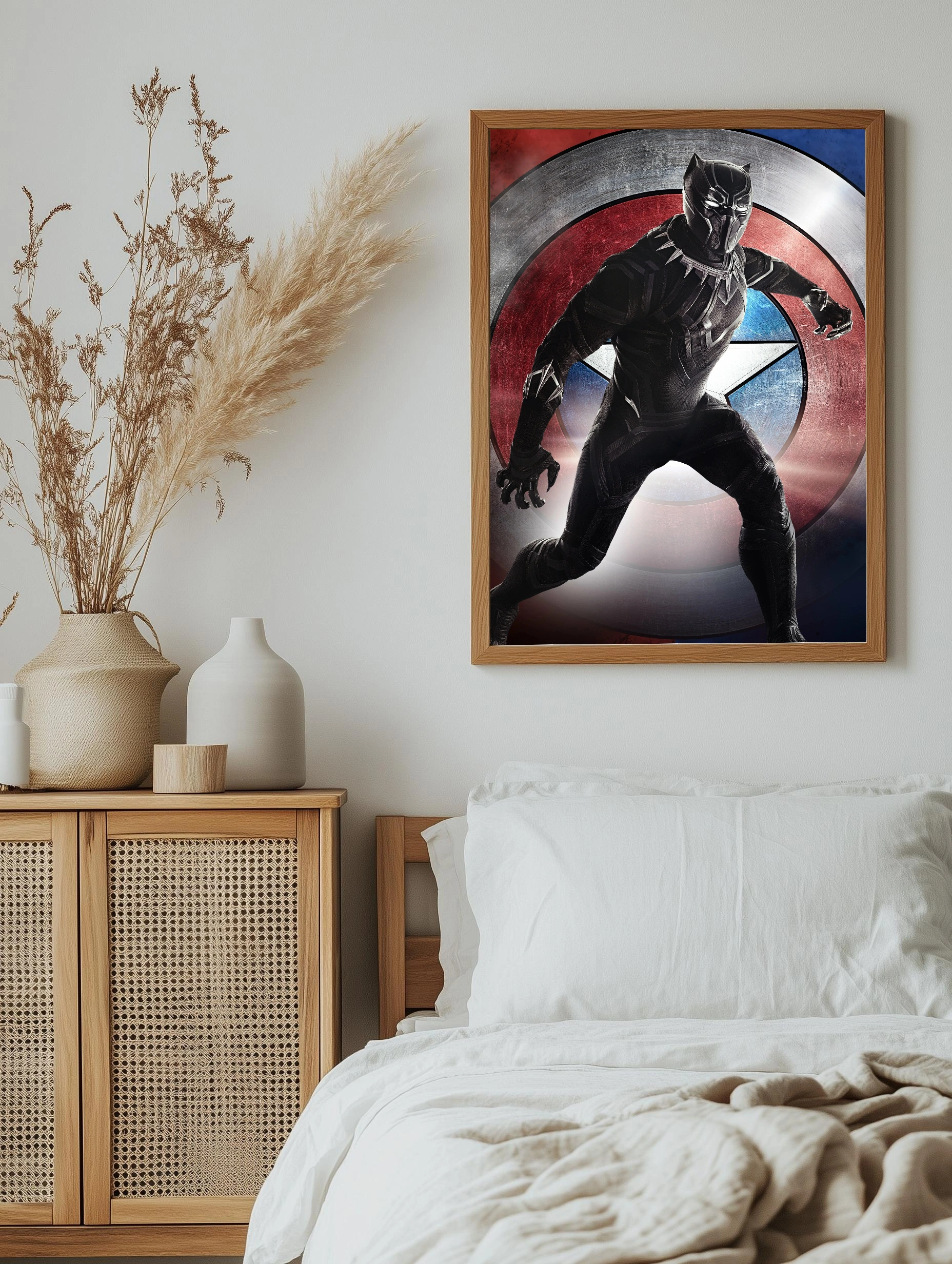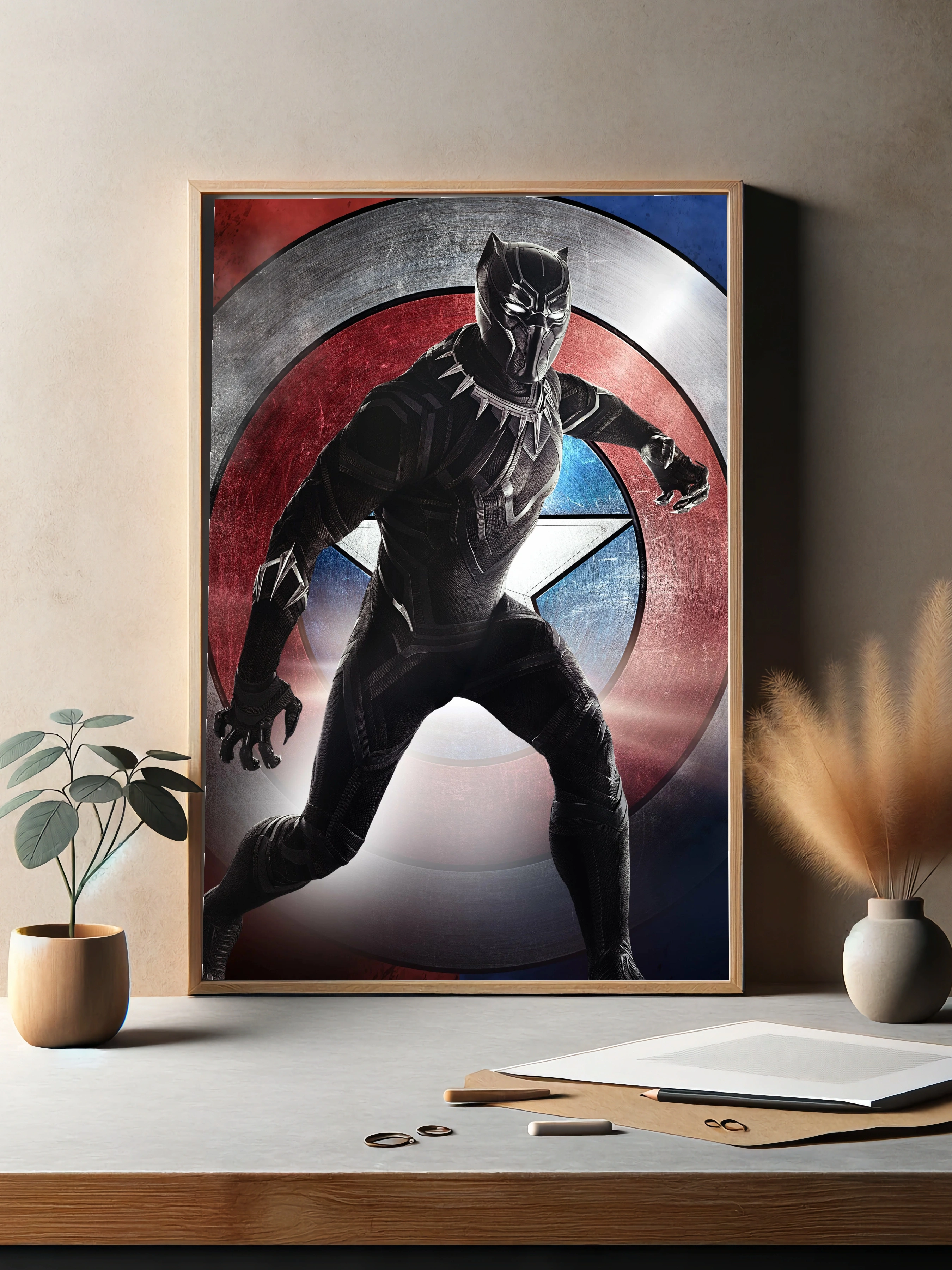 Картина на холсте с изображением Черной Пантеры из вселенной Marvel в динамичной позе на фоне щита Капитана Америки. Стиль выполнен в реалистичной манере с акцентом на детали костюма и текстуры металла. Интерьерный постер, идеально подходящий для гостиной или офиса, добавит современное искусство и уникальные картины для дома.