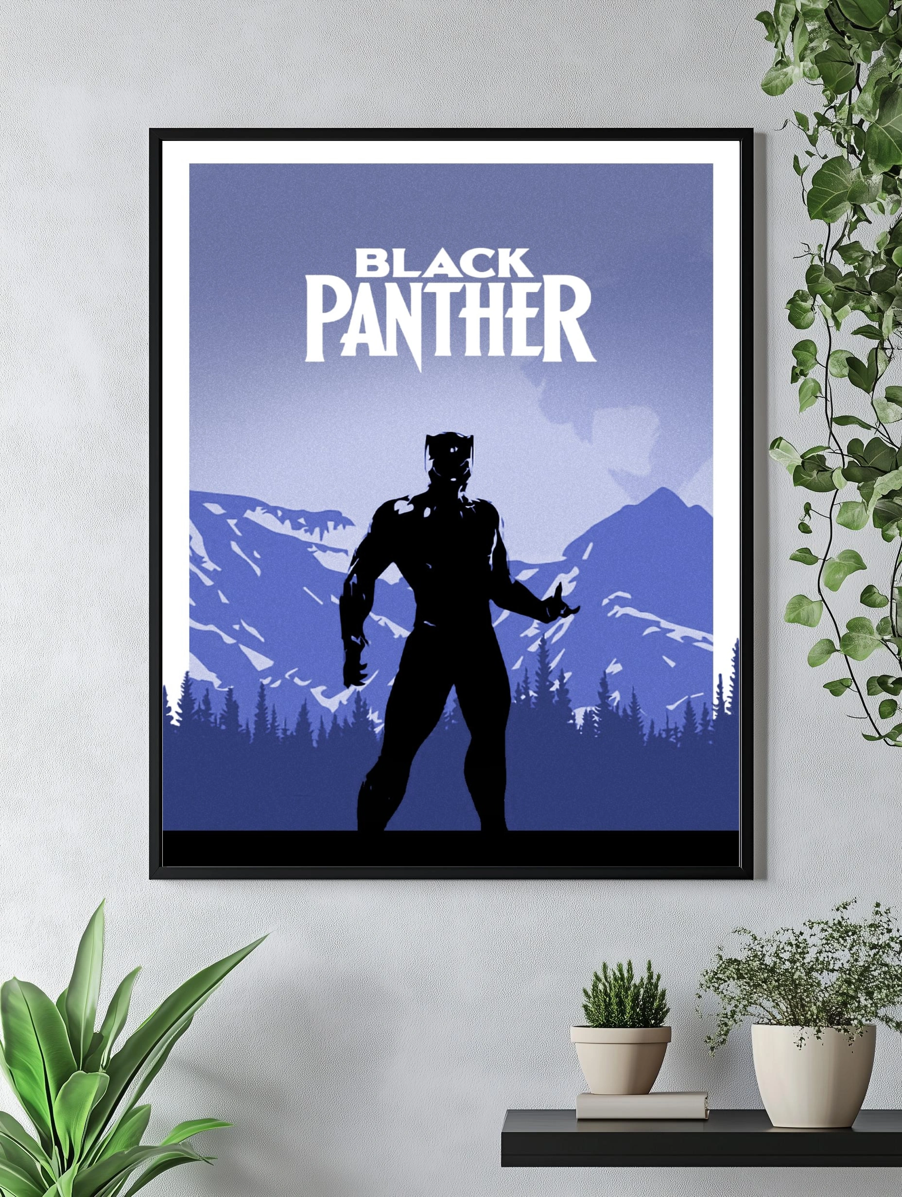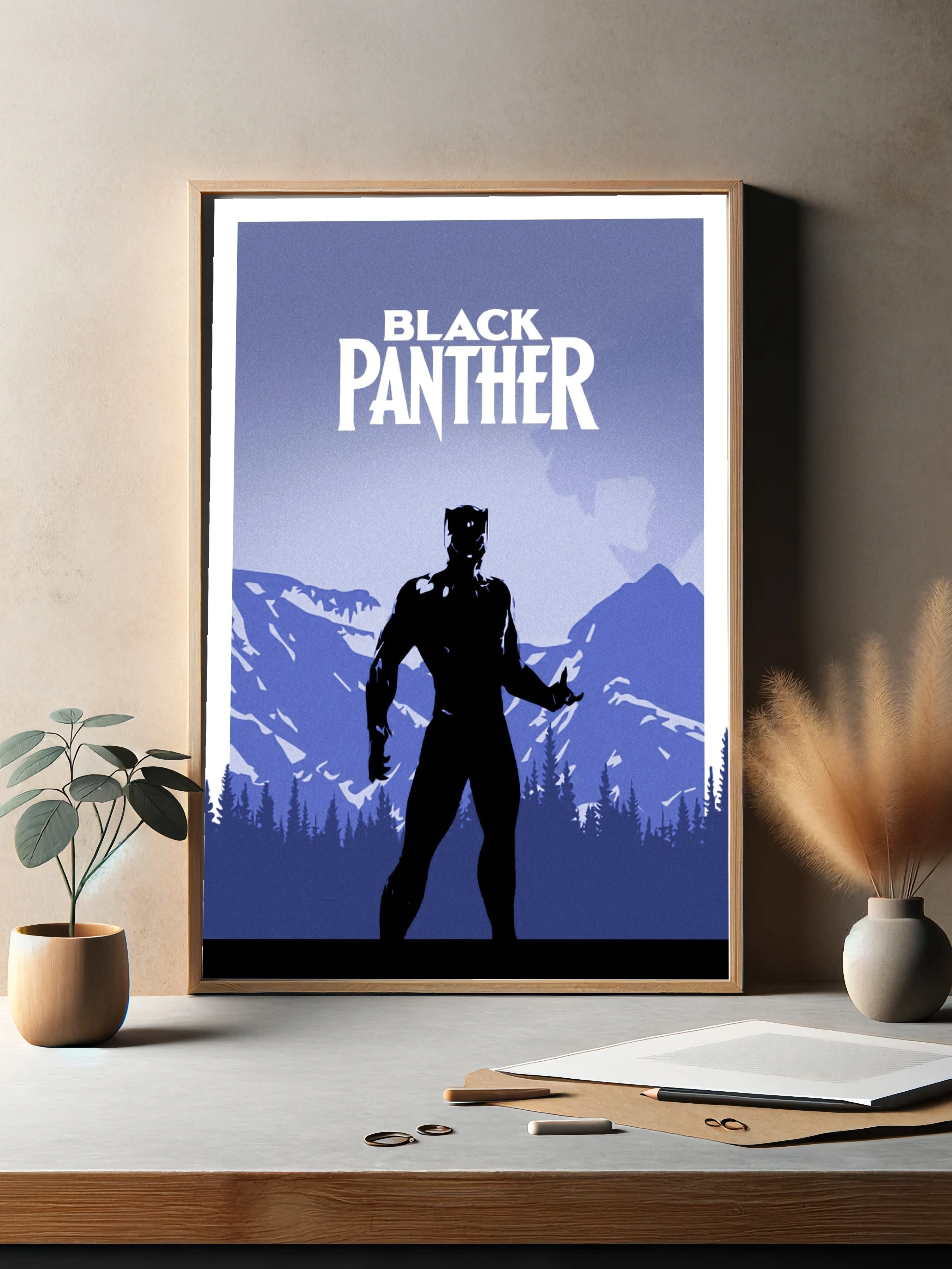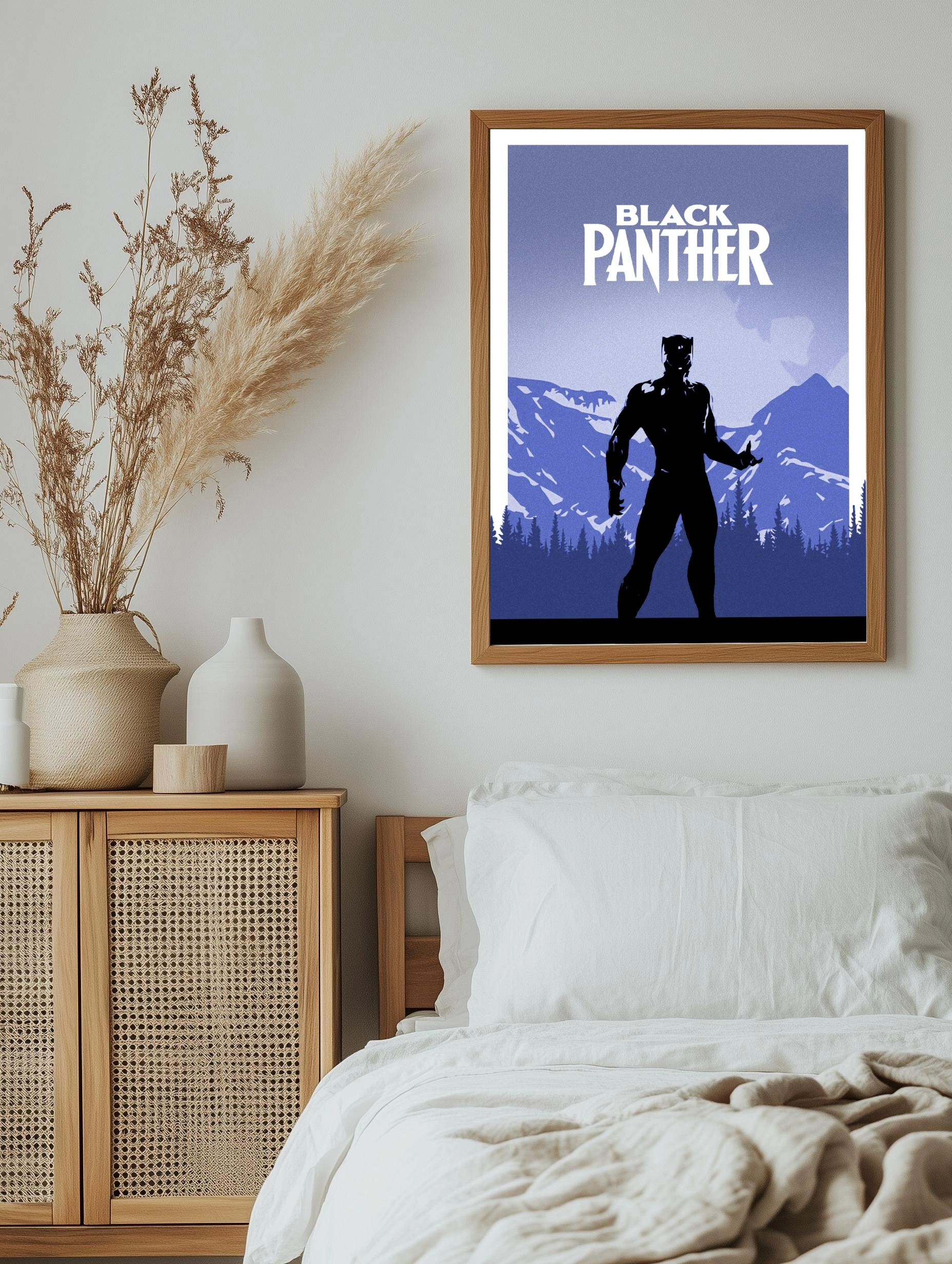 Изображение представляет собой интерьерное искусство с силуэтом Черной Пантеры на фоне горного ландшафта с хвойными деревьями. Плакат выполнен в стилистике минимализма с акцентом на контраст между тёмной фигурой и светло-голубым фоном, что создаёт атмосферу загадочности и силы. Идеально для современного оформления гостиной или офиса.