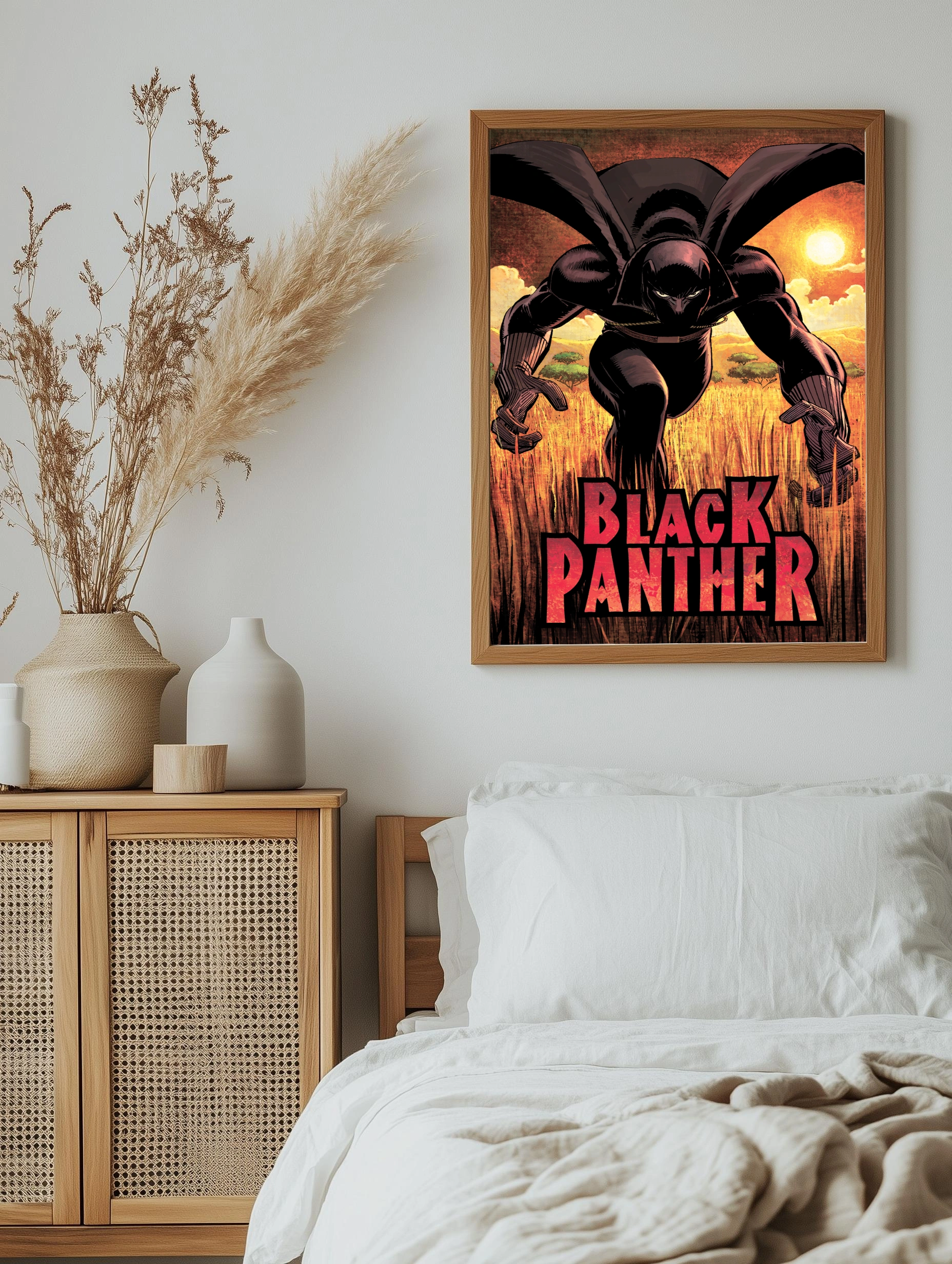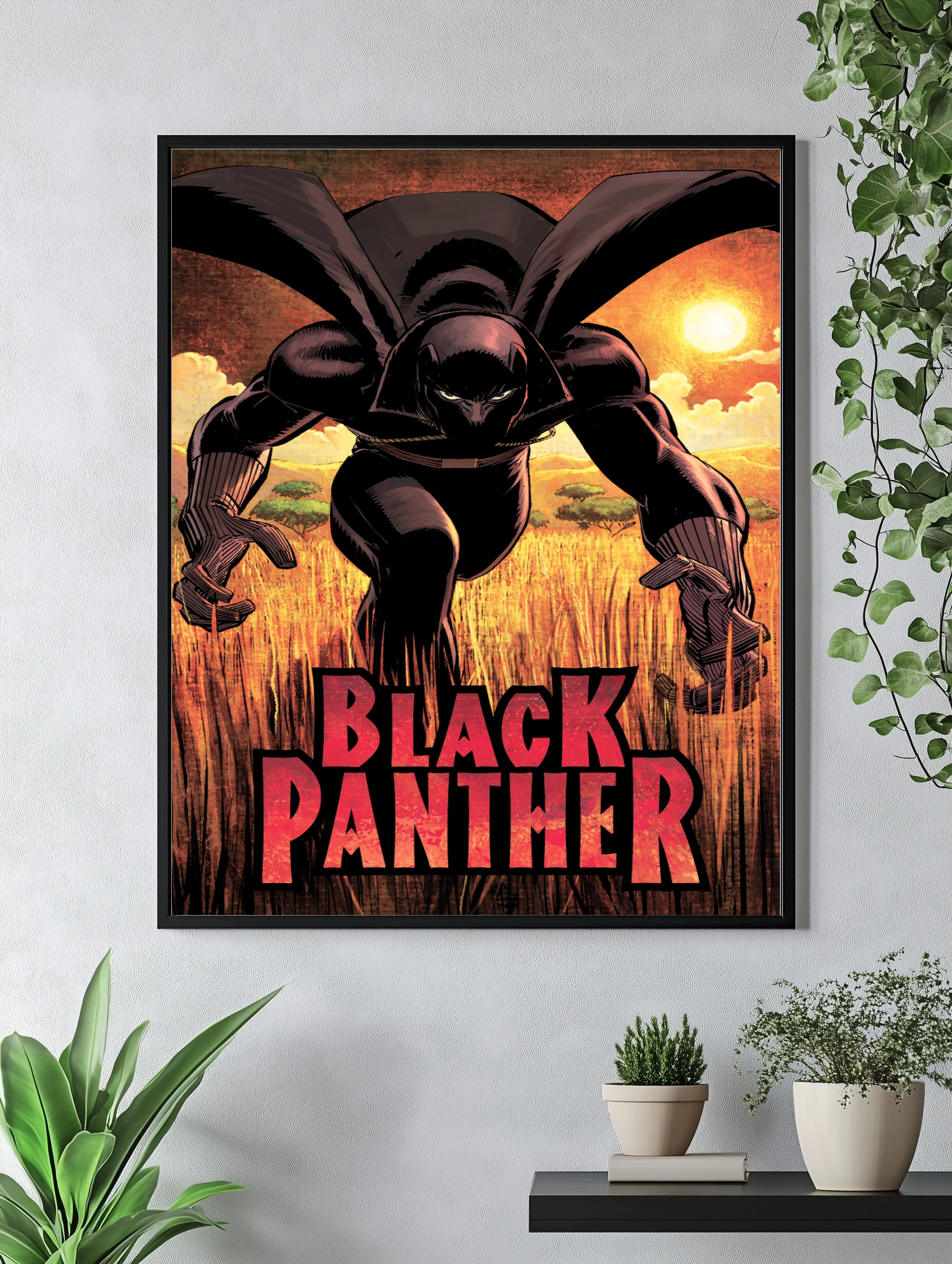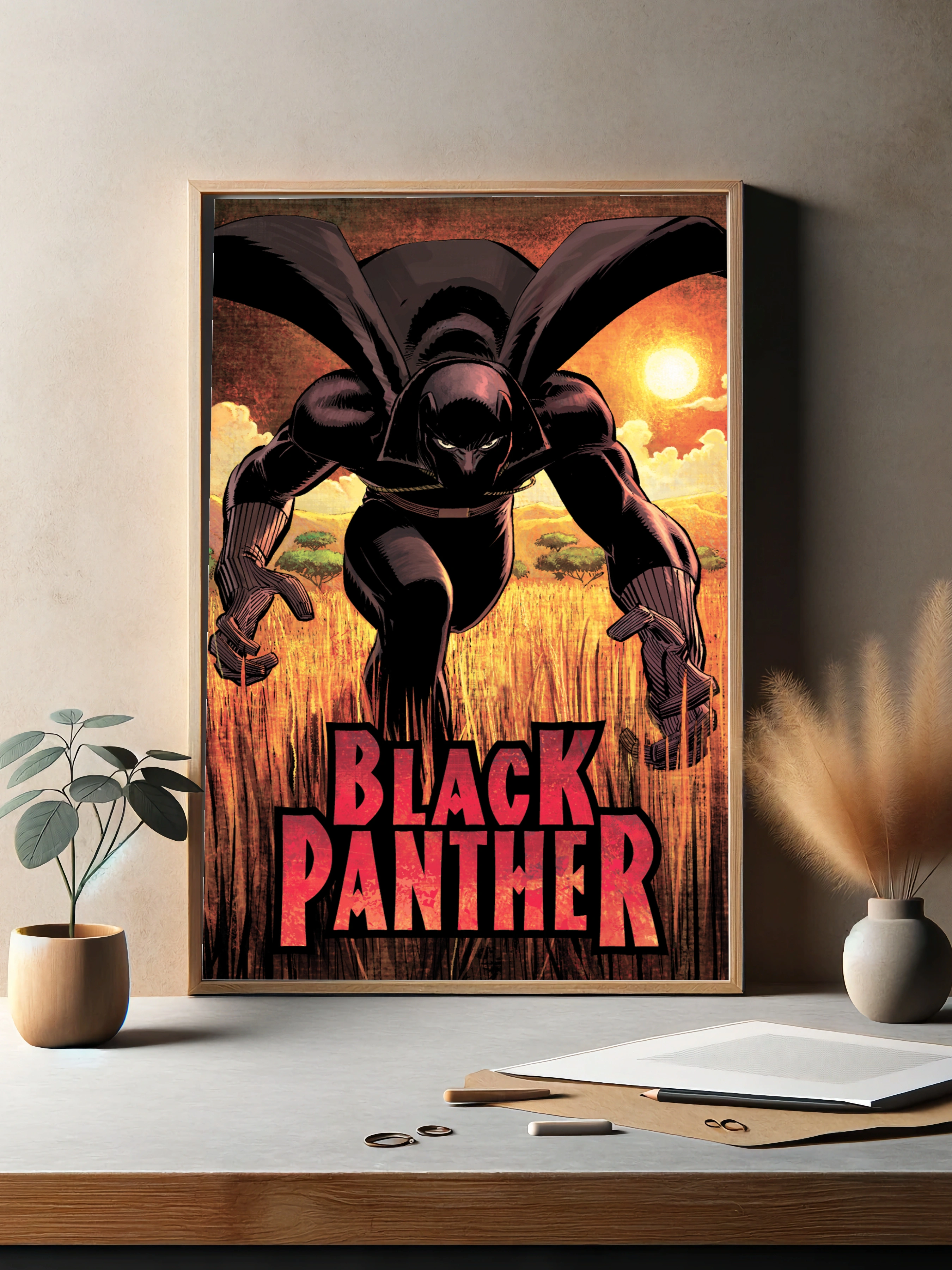 Яркий интерьерный арт с Чёрной Пантерой в динамичной позе на фоне закатного африканского саванна. Картина для гостиной или офиса, выполненная в стилизованной комиксной манере, создаёт атмосферу силы и решимости. Декоративный плакат с сильным контрастом и насыщенными цветами для стильного декора стен.