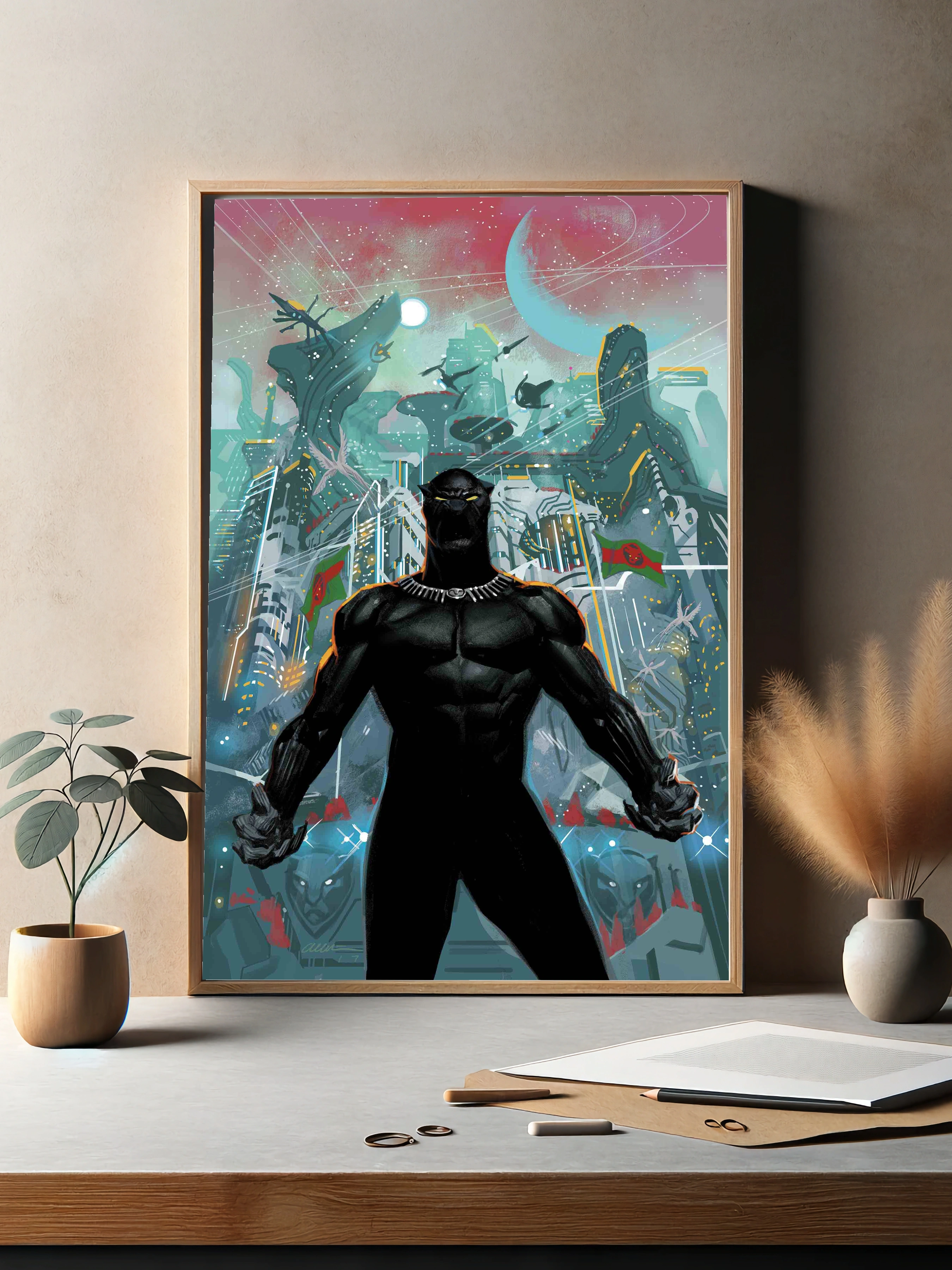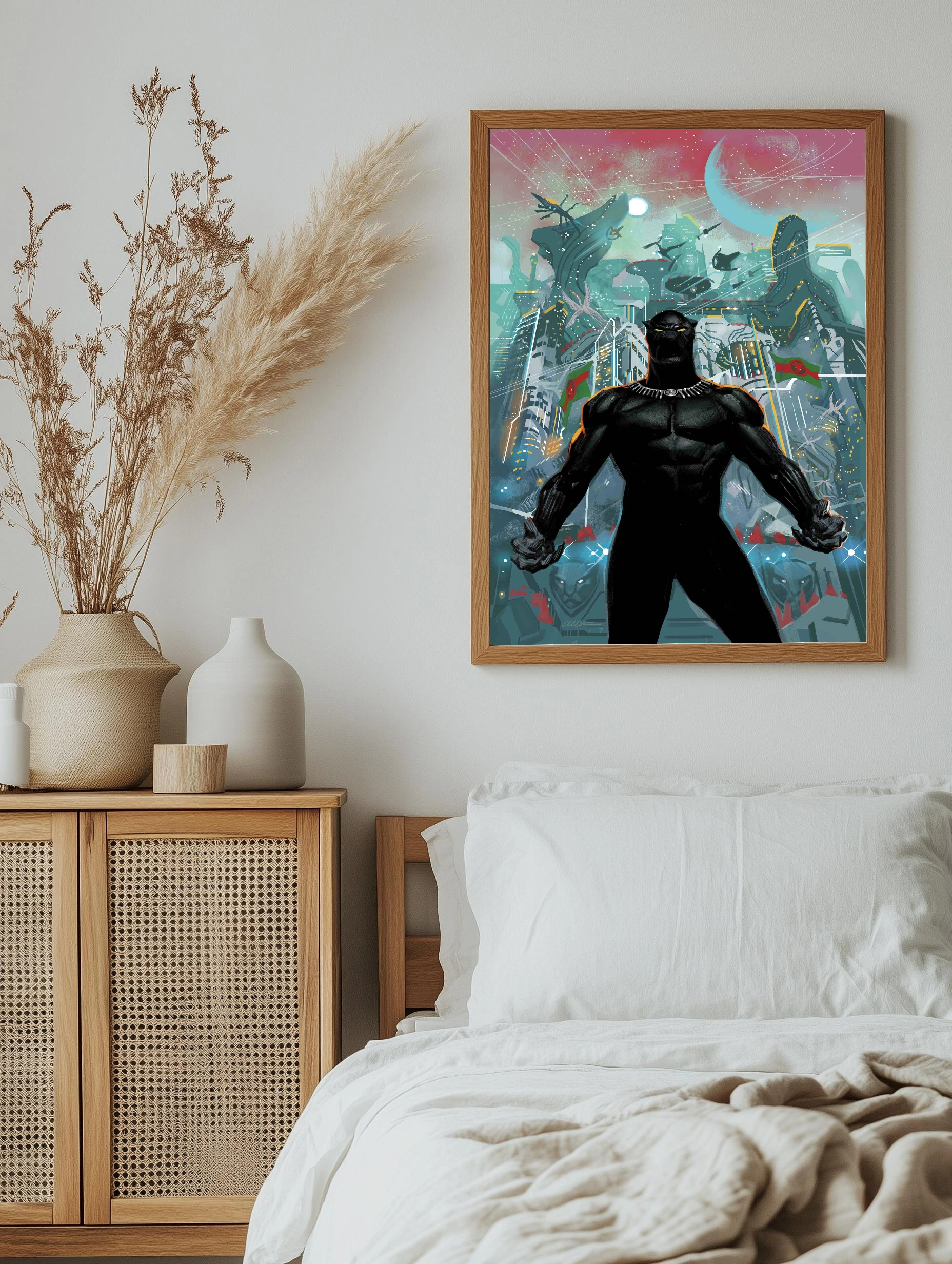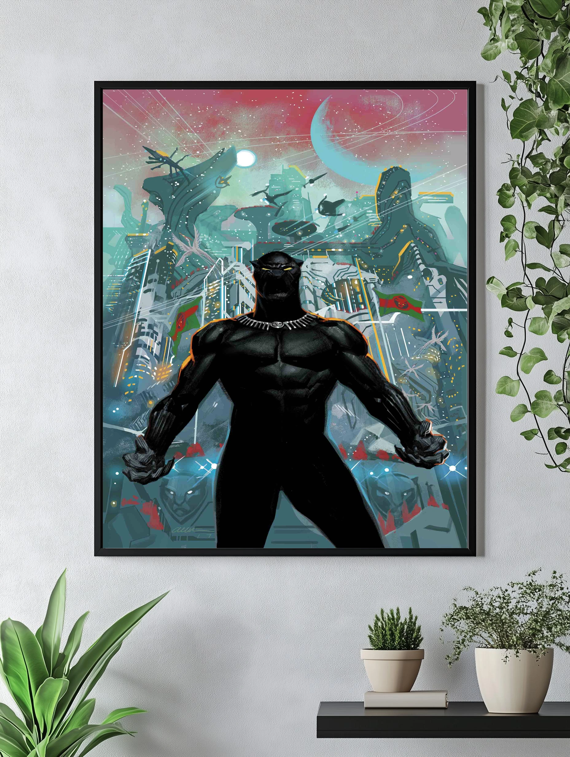 Изображение знаменитого персонажа Черной Пантеры на фоне футуристического мегаполиса Ваканды с яркими огнями и инопланетными формами. Темный силуэт героя с выразительной мускулатурой выделяется на фоне серо-синих и красных оттенков, создавая атмосферу силы, гордости и инноваций. Идеально для современного интерьера, декоративных картин и уникального настенного декора.