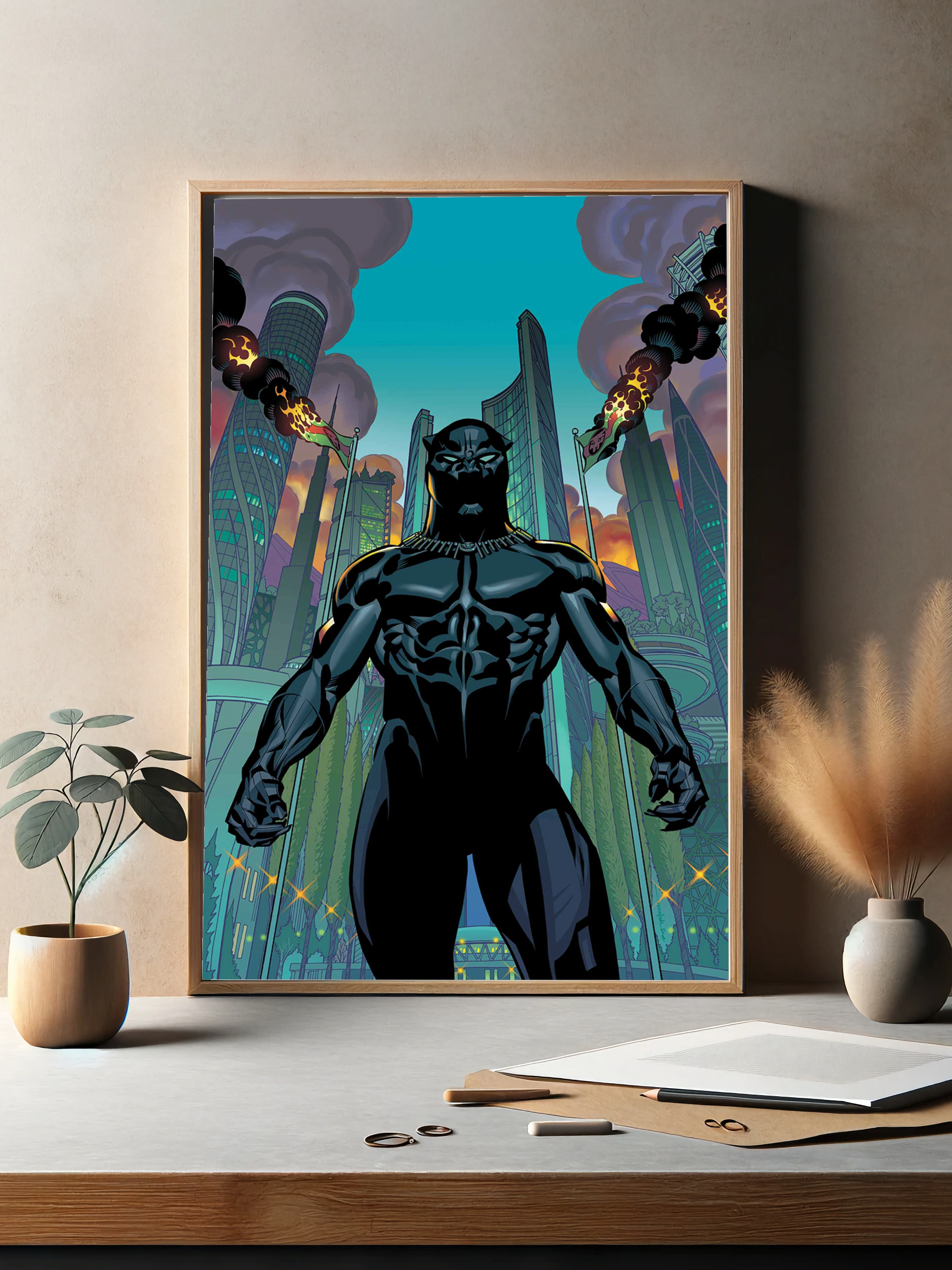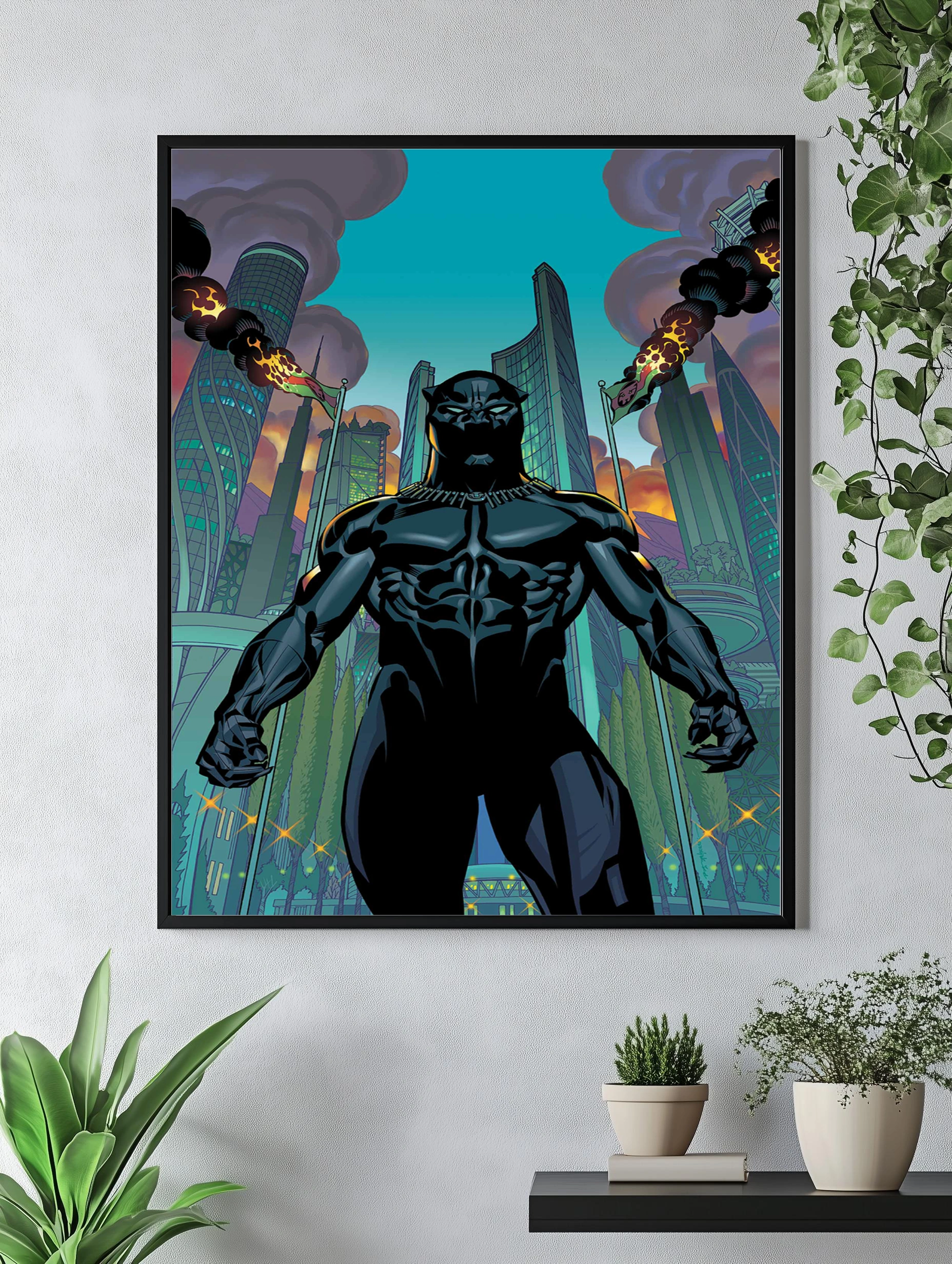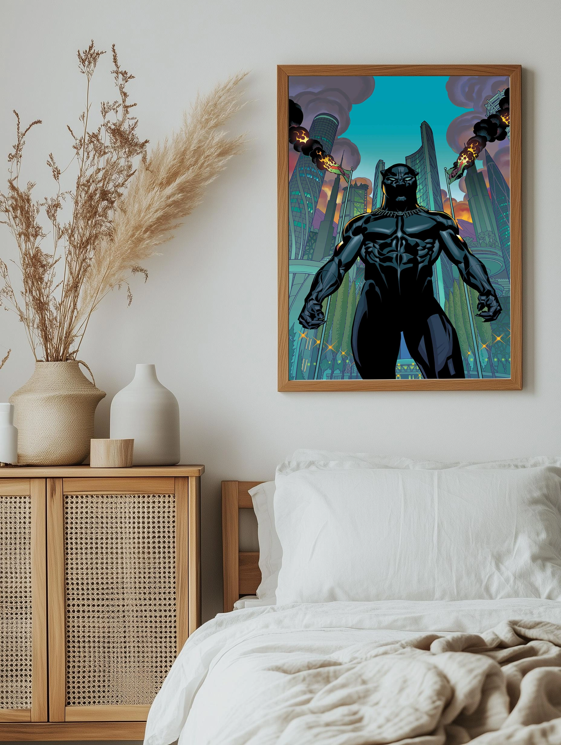Изображение показывает Черную Пантеру — одного из самых известных супергероев Marvel — на фоне футуристического городского пейзажа с высоким небоскрёбами и дымящимися факелами. Яркий синий фон и эффектное освещение создают динамичный, напряжённый настрой, подчёркивающий силу и защиту героя. Это художественный плакат, подходящий как интерьерный постер для стен гостиной или офиса, добавляет современное искусство и стильный декор стен.