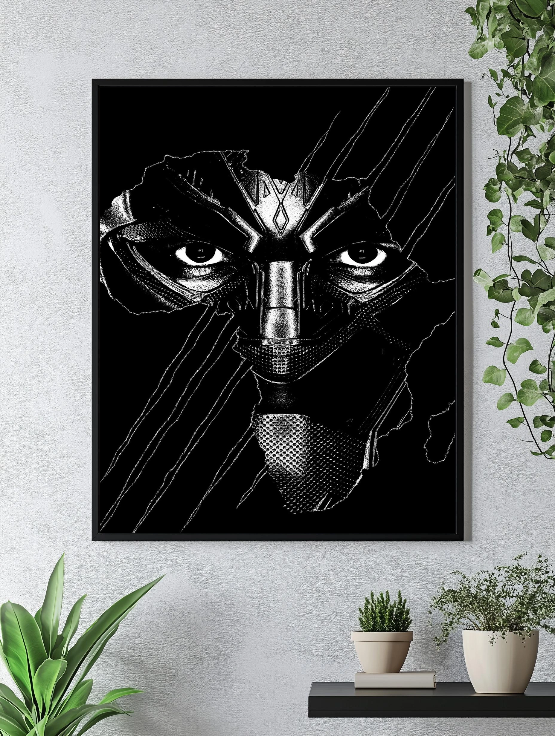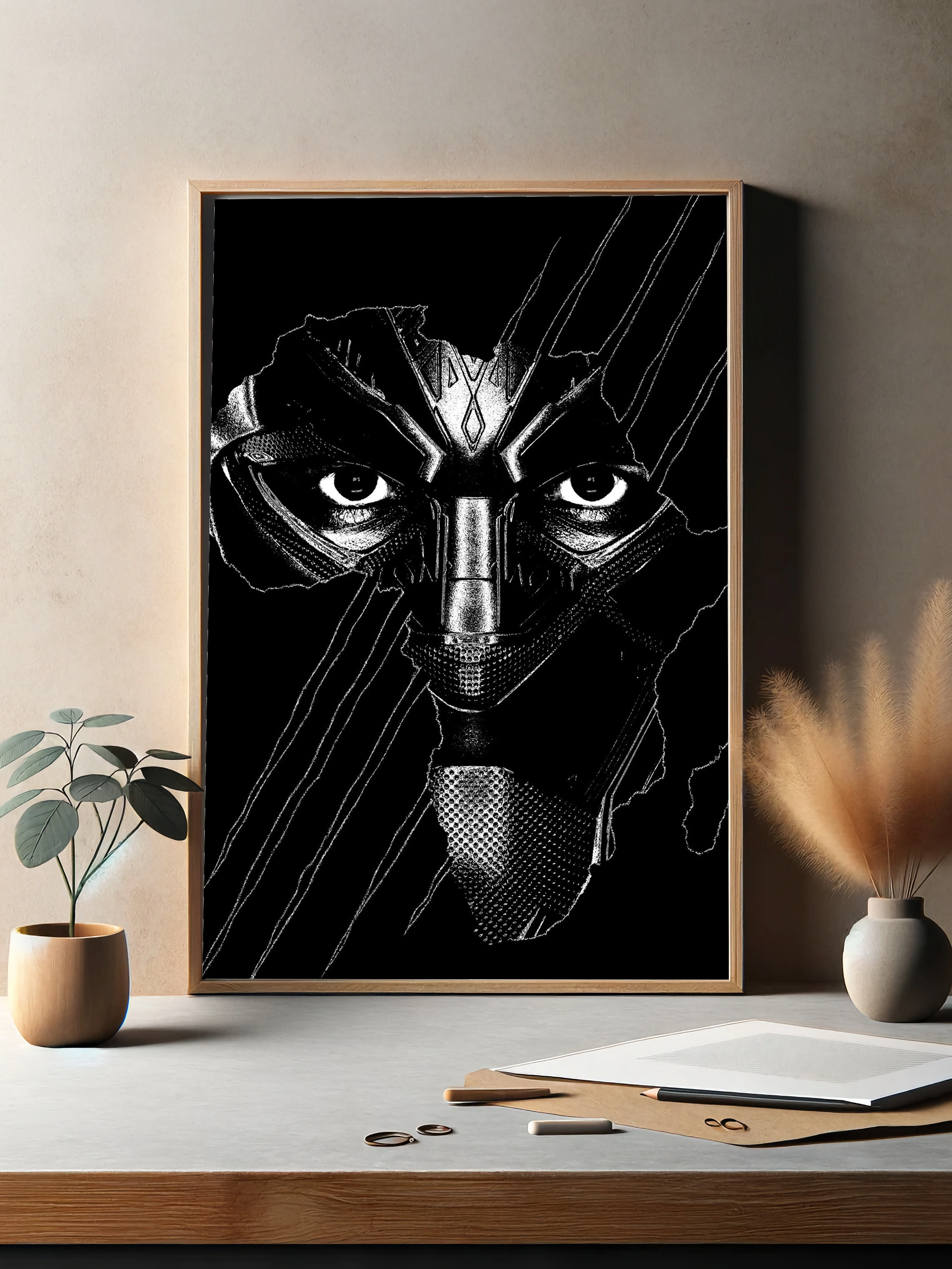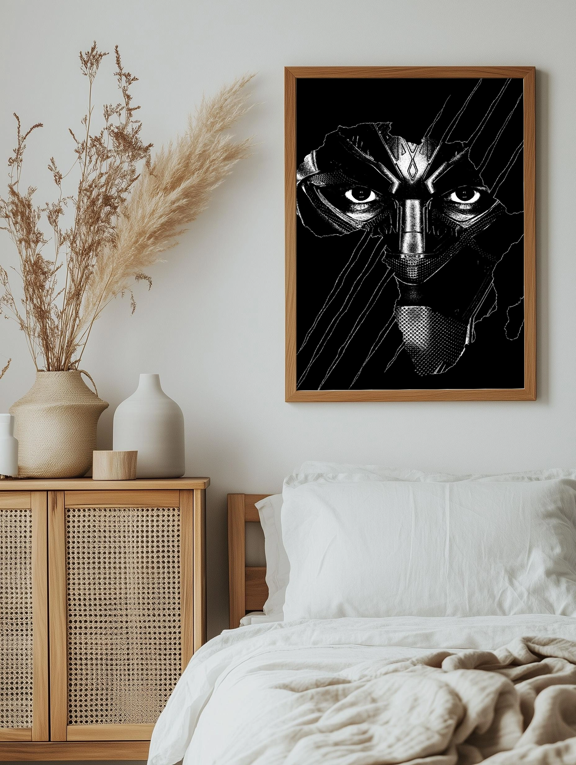 Изображение представляет собой детализированное чёрно-белое изображение героя Marvel — Черной Пантеры. Открытые глаза персонажа приковывают внимание на фоне разорванных теней, создавая ощущение силы и загадочности. Картина отлично подойдет для декора как гостиной, так и офиса, добавляя интерьеру современное искусство и стильный дух супергероя.