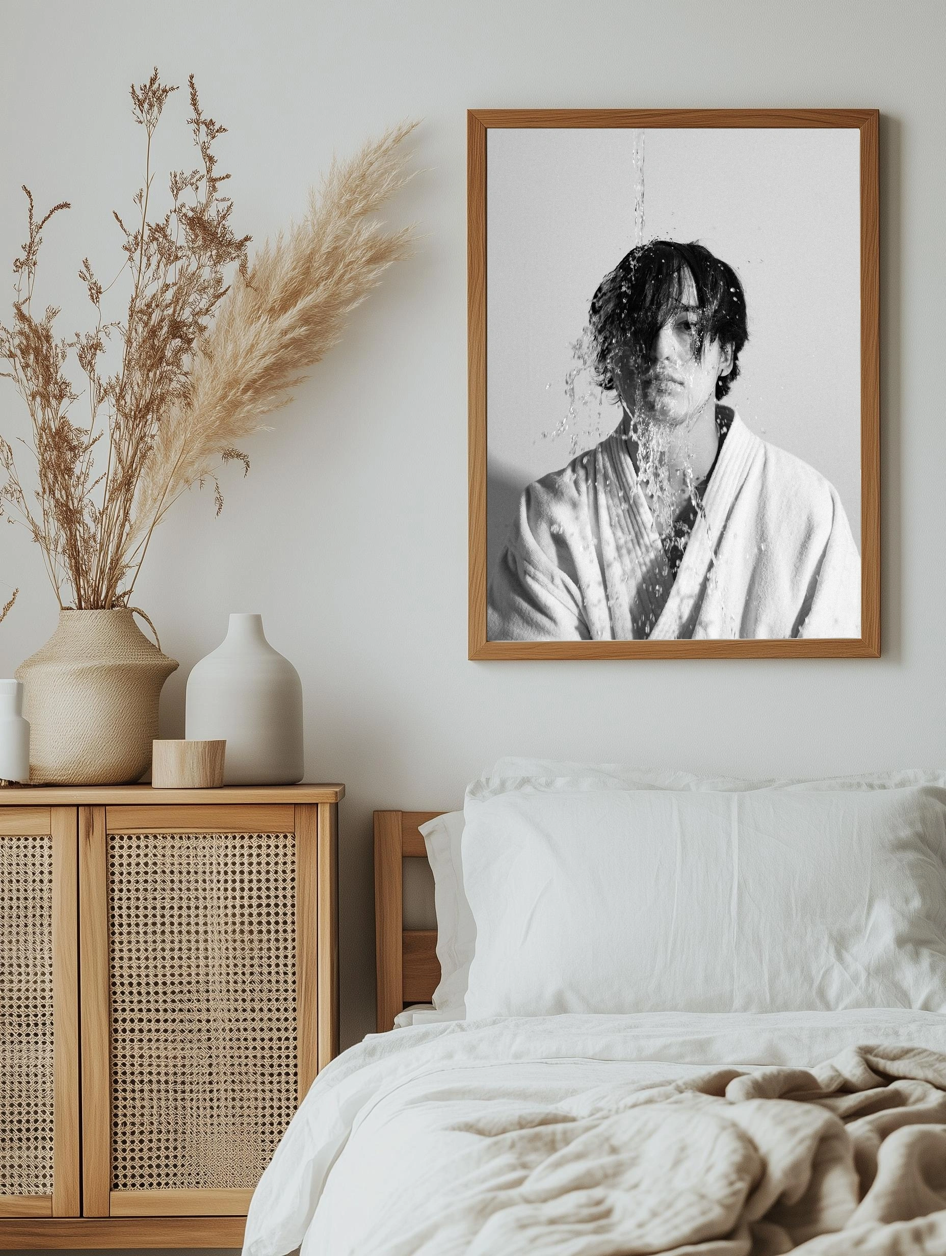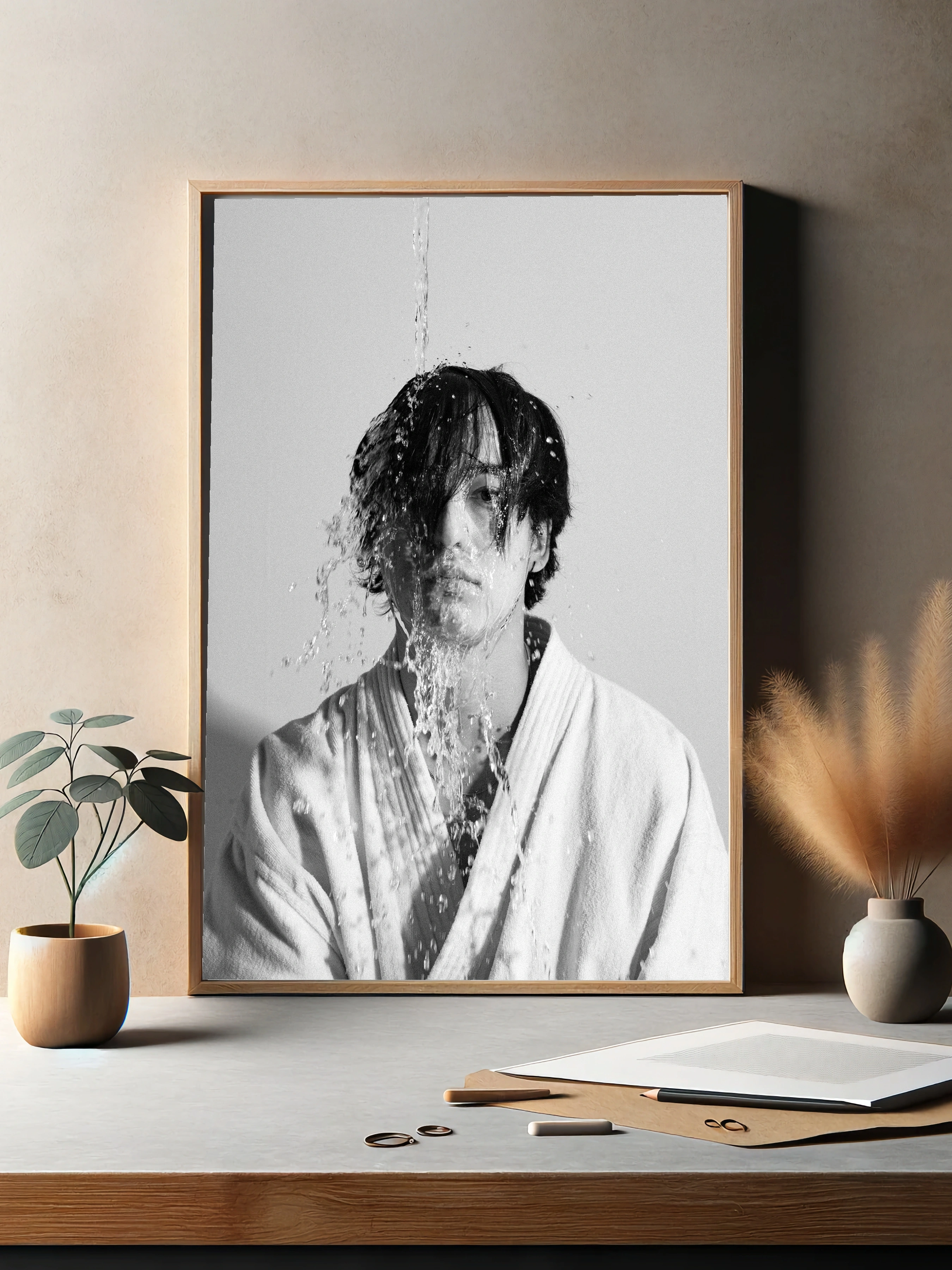 Черно-белая художественная картина для стен с изображением молодого человека, на которого падает струя воды. Монохромное изображение создает атмосферу глубокой эмоции и задумчивости. Идеально подойдет как интерьерный постер для гостиной, спальни или офиса, добавит стильный декор и динамику в любой интерьер.