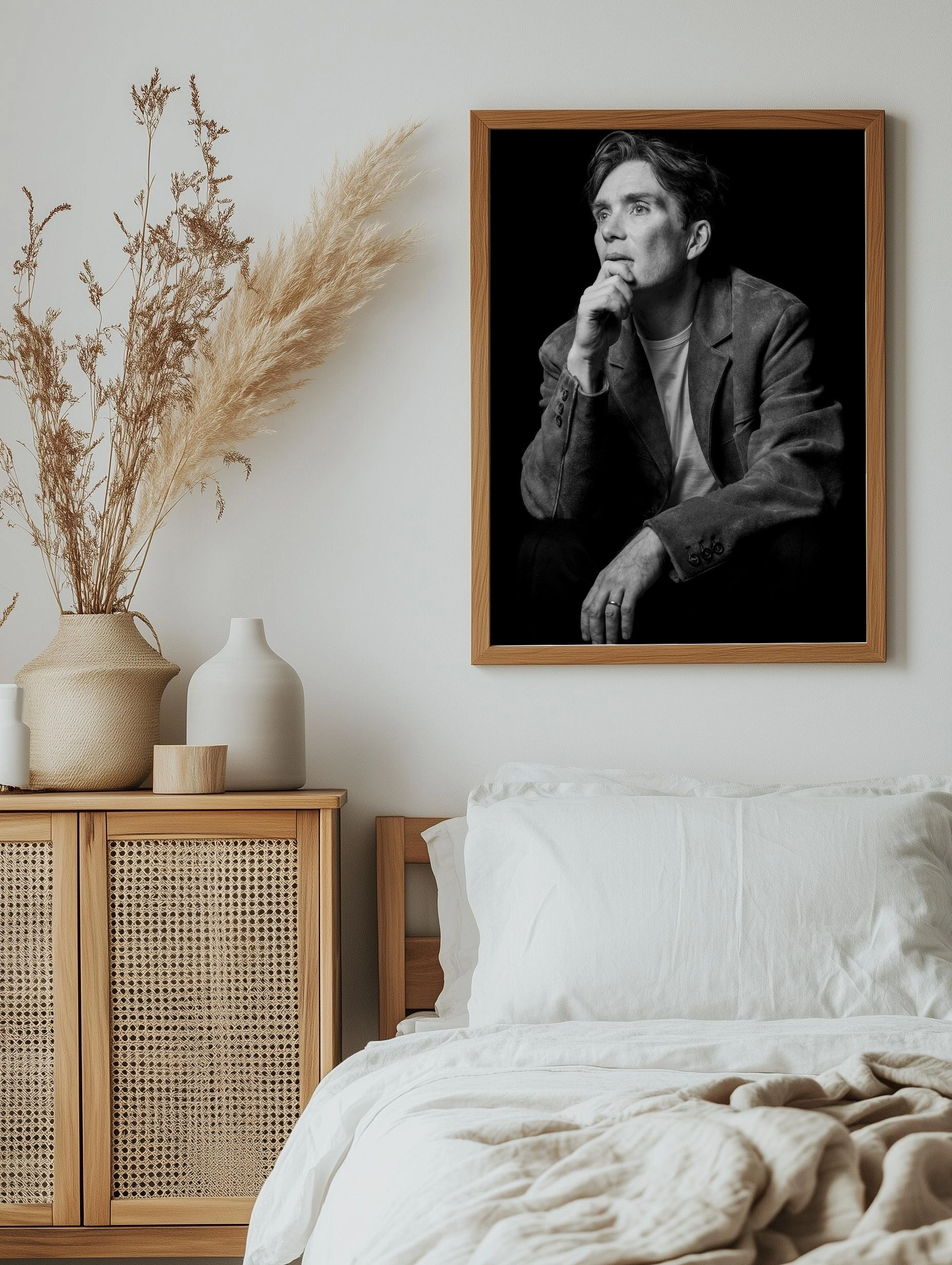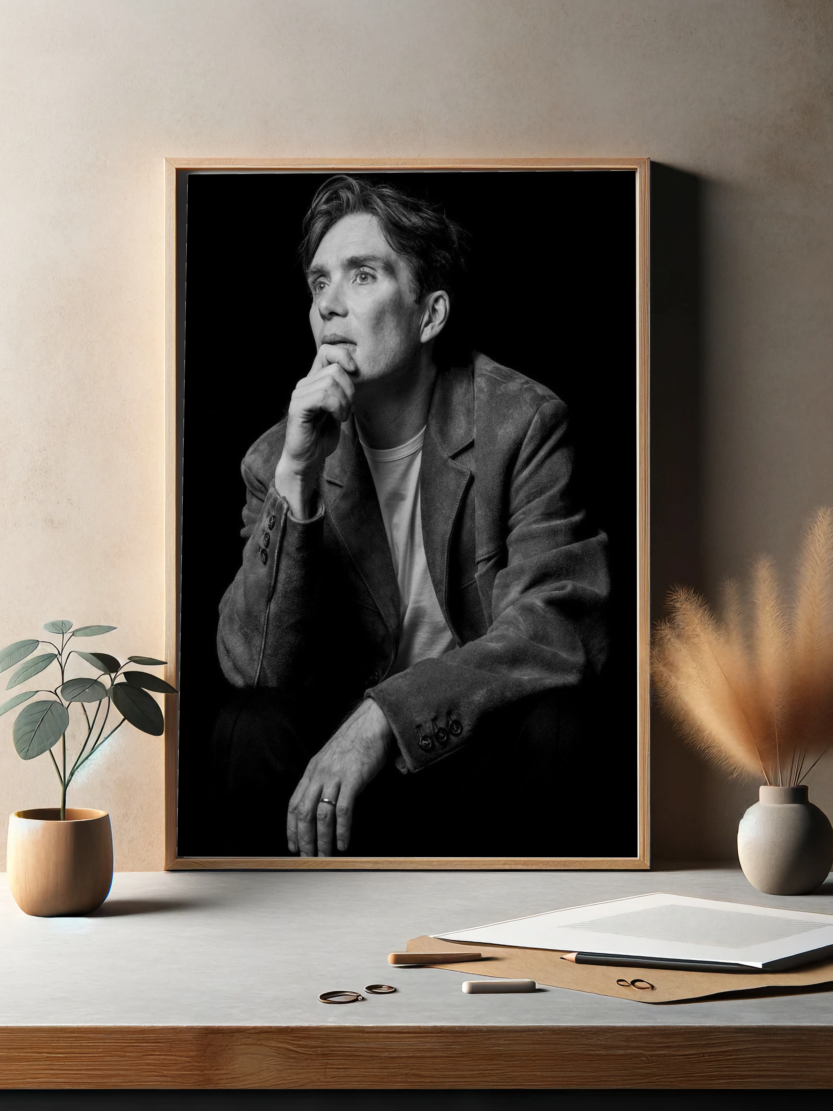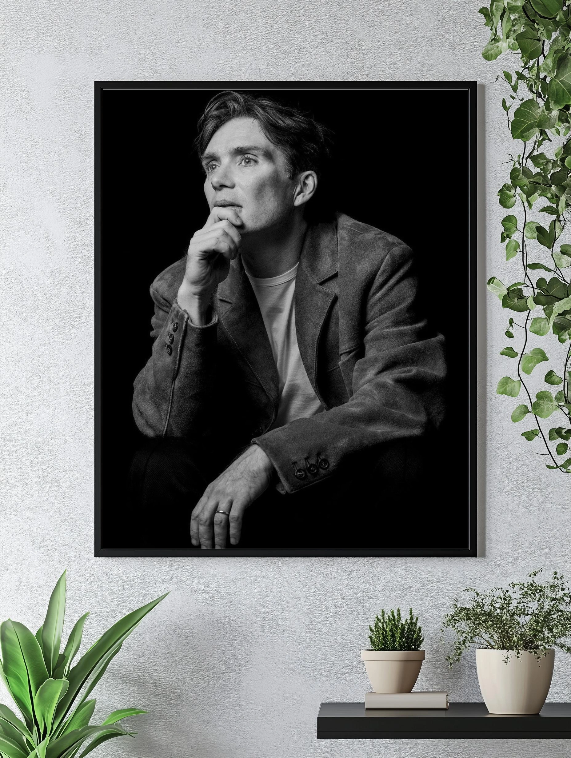 Черно-белое фото в классическом стиле, изображающее мужчину в задумчивой позе на темном фоне. Акцент на выразительном лице и текстуре замшевого пиджака создают атмосферу глубокой мысли и интеллекта. Идеально для современного интерьера, декоративный плакат с уникальным художественным стилем.