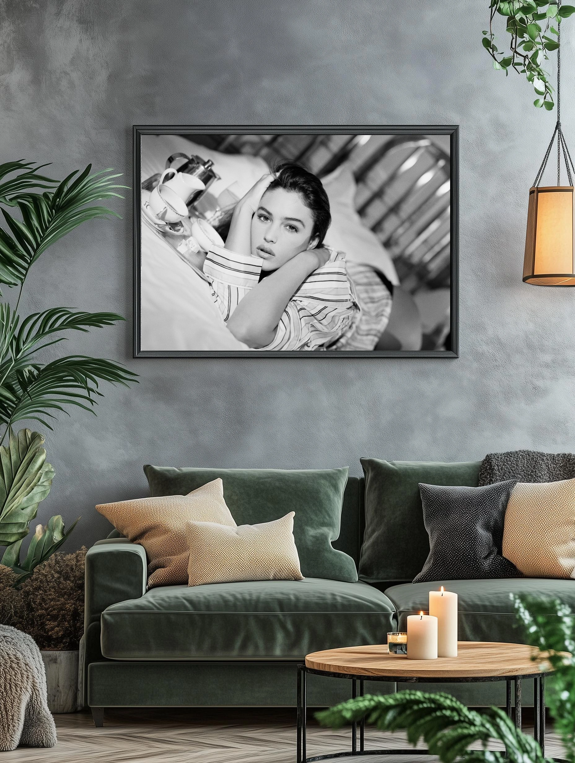 На фотографии изображена женщина с рыжими волосами, уложенными волнами, одетая в зеленый жилет поверх темного платья. Использованы темный фон и акцент на лицо, создавая атмосферу глубины и загадочности. Такой художественный плакат станет стильным декоративным элементом для гостиной или офиса, добавляя современное искусство для стен и уникальный интерьерный декор.