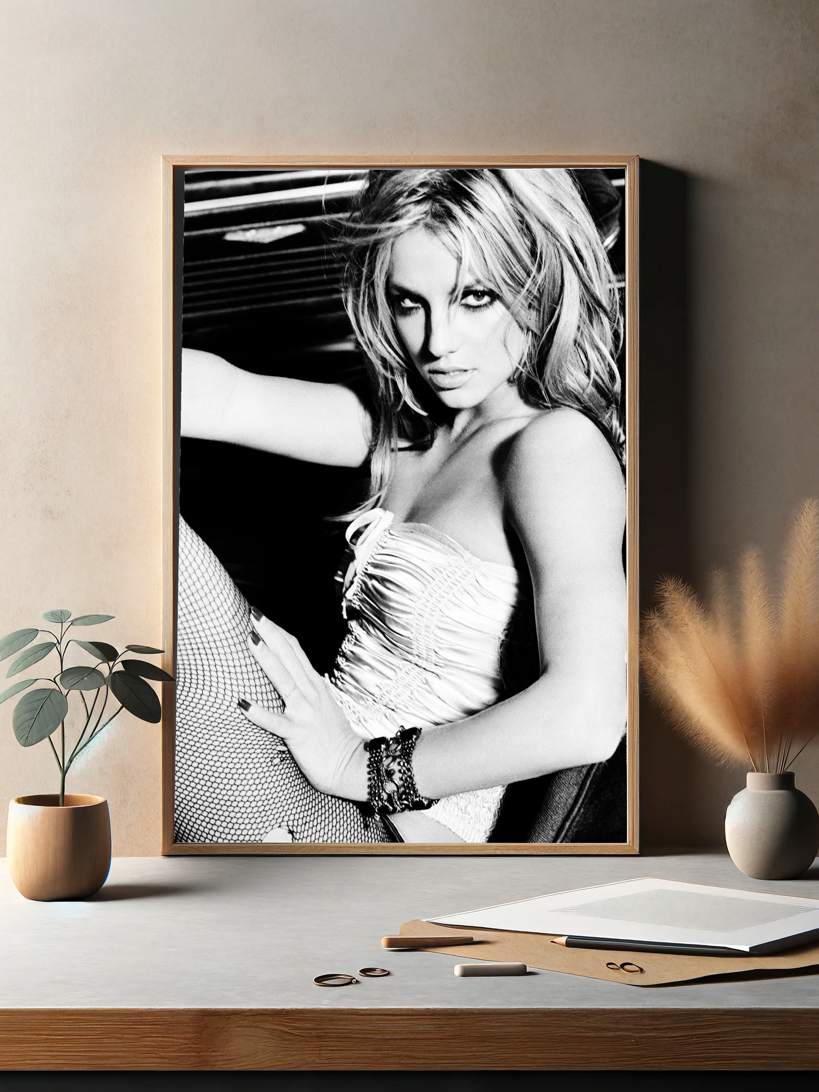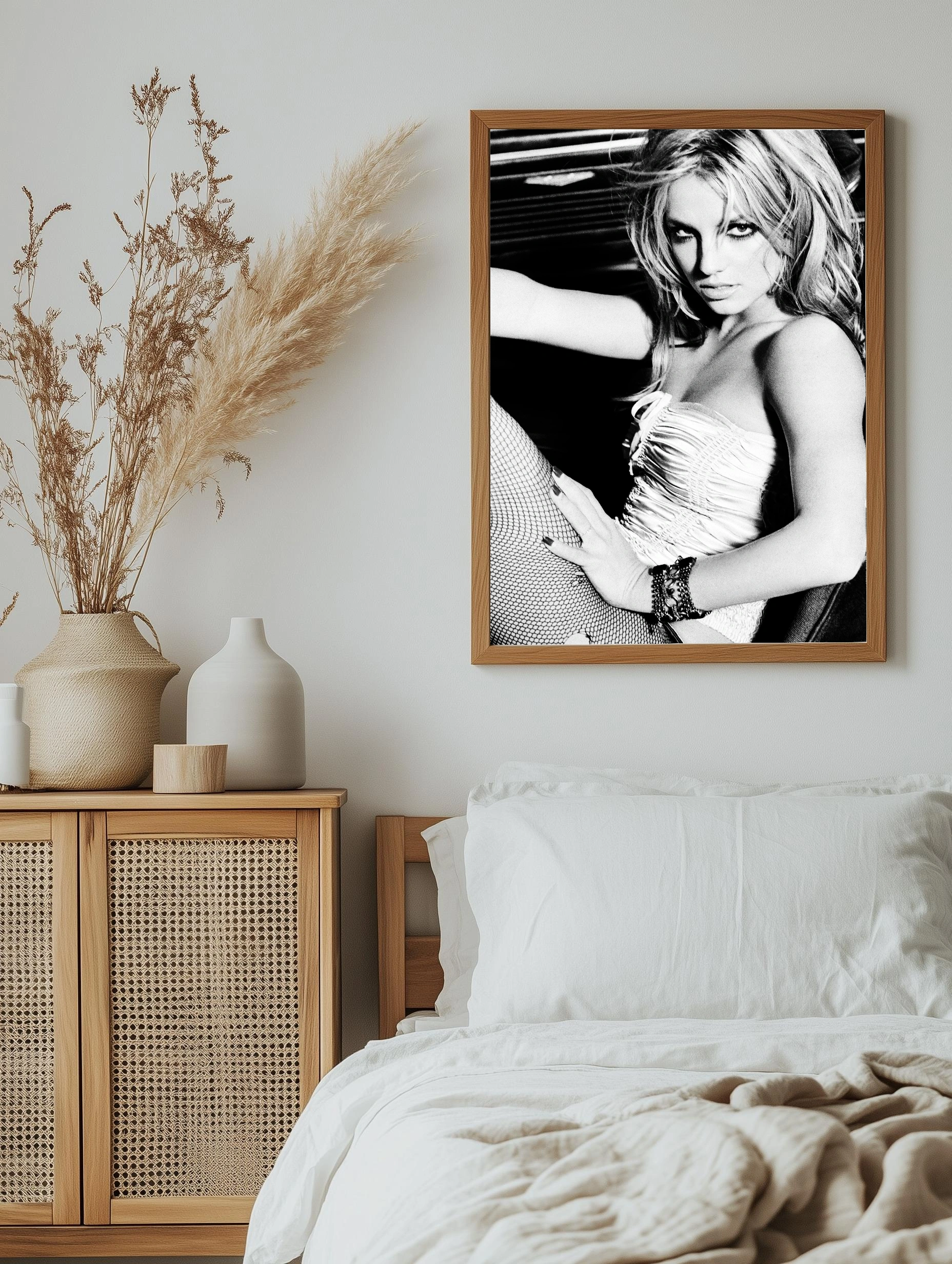 Черно-белая фотография эффектно передает атмосферу гламура и таинственности. Главная героиня — молодая женщина с выразительным взглядом и растрепанными волосами. Образ дополнен контрастным освещением и текстурами сетчатых чулок, создавая художественный плакат для спальни или гостиной. Этот интерьерный фотопостер станет стильным декором стен и уникальной картиной для дома.