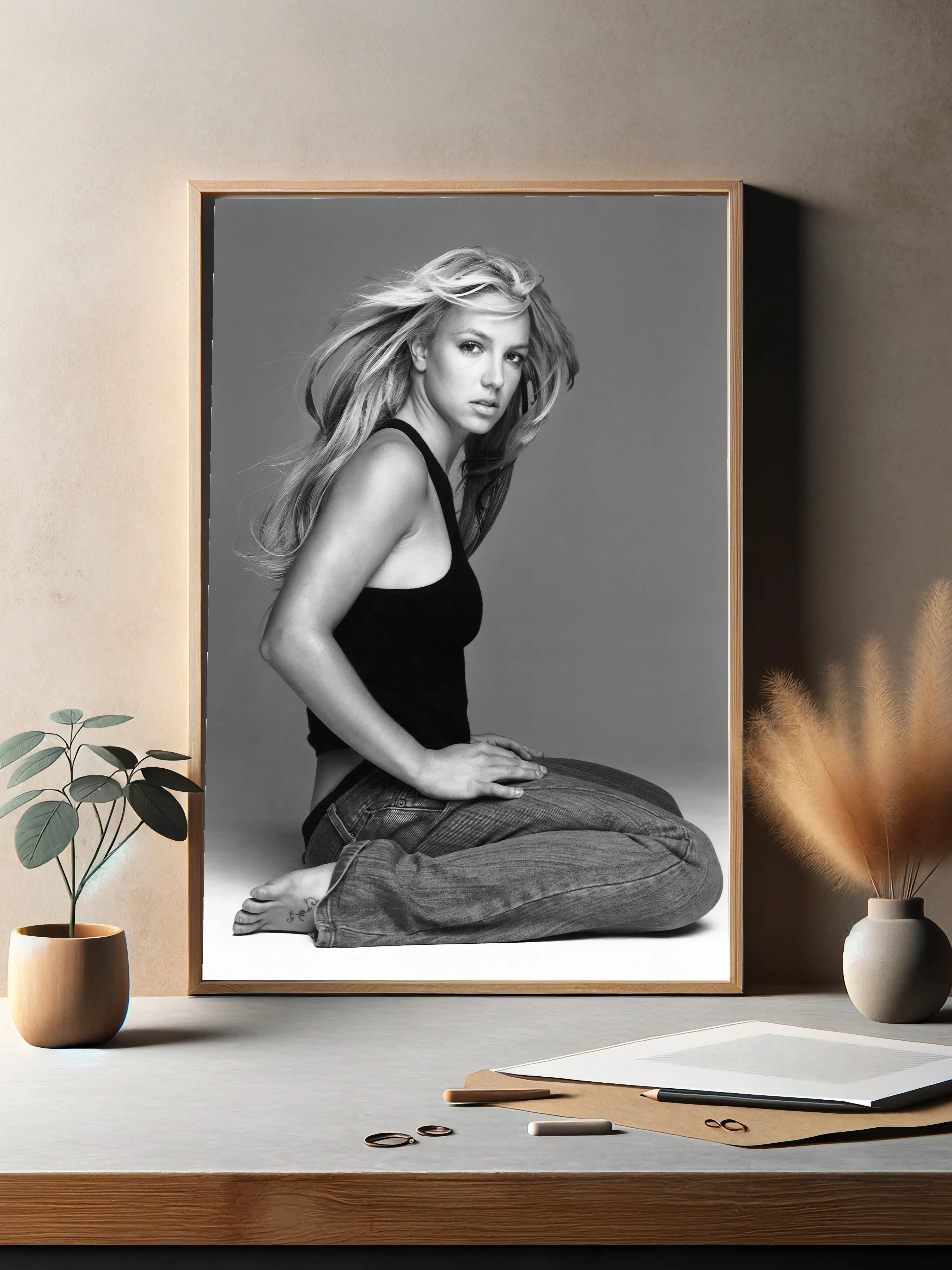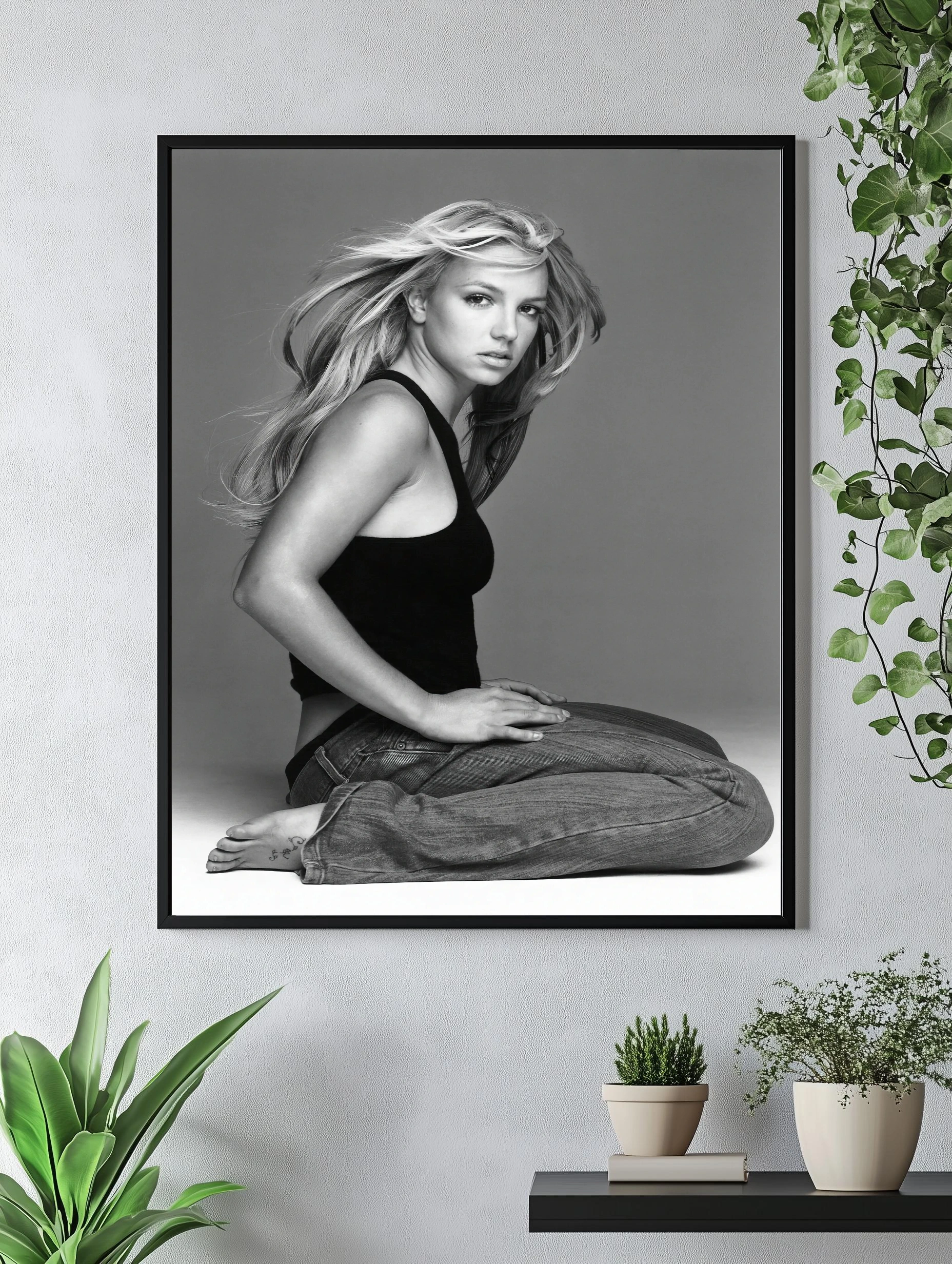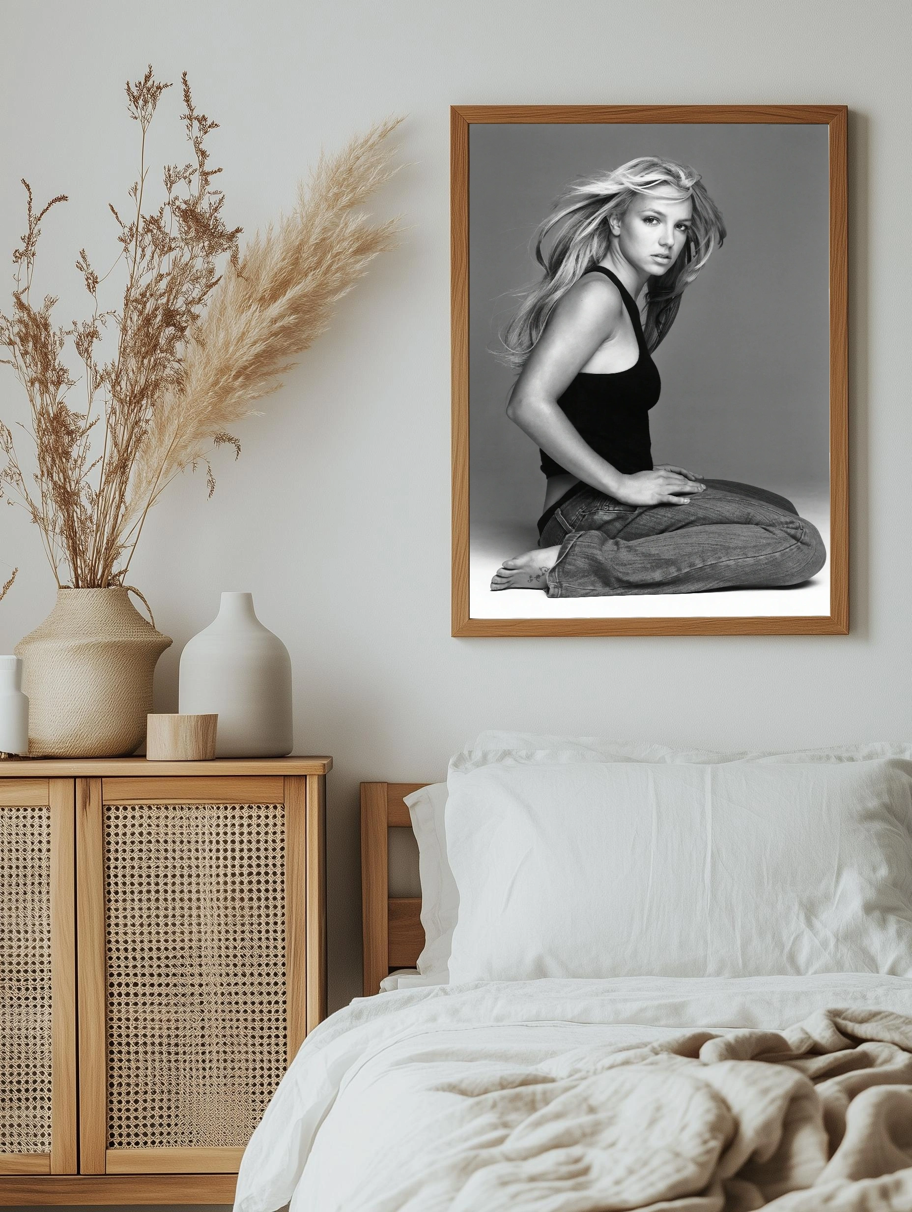 Изображение представляет собой чёрно-белую художественную фотографию молодой женщины, сидящей на полу в джинсах и топе. Природный, спокойный образ с акцентом на естественную красоту и мягкое световое оформление создает атмосферу утонченности и гармонии. Эта картина для гостиной или спальни отлично подходит для стильного декора стен и современного интерьера.
