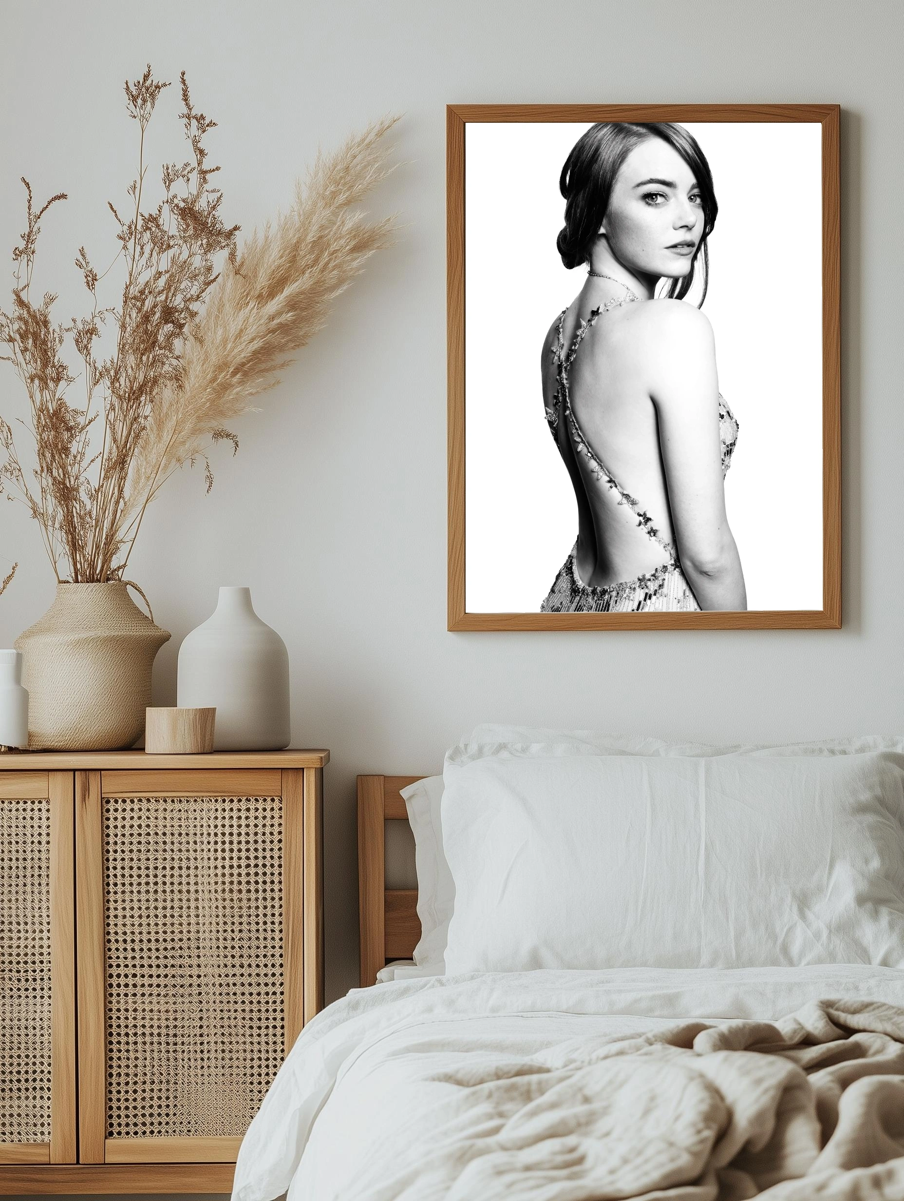 Черно-белая художественная картина, изображающая изящный портрет молодой женщины, смотрящей через плечо в мягком свете. Плавные линии и текстура ее вечернего платья создают атмосферу элегантности и утонченности. Эта декоративная картина станет стильным декором стен, подчеркнет современное искусство для стен в гостиной или спальне.