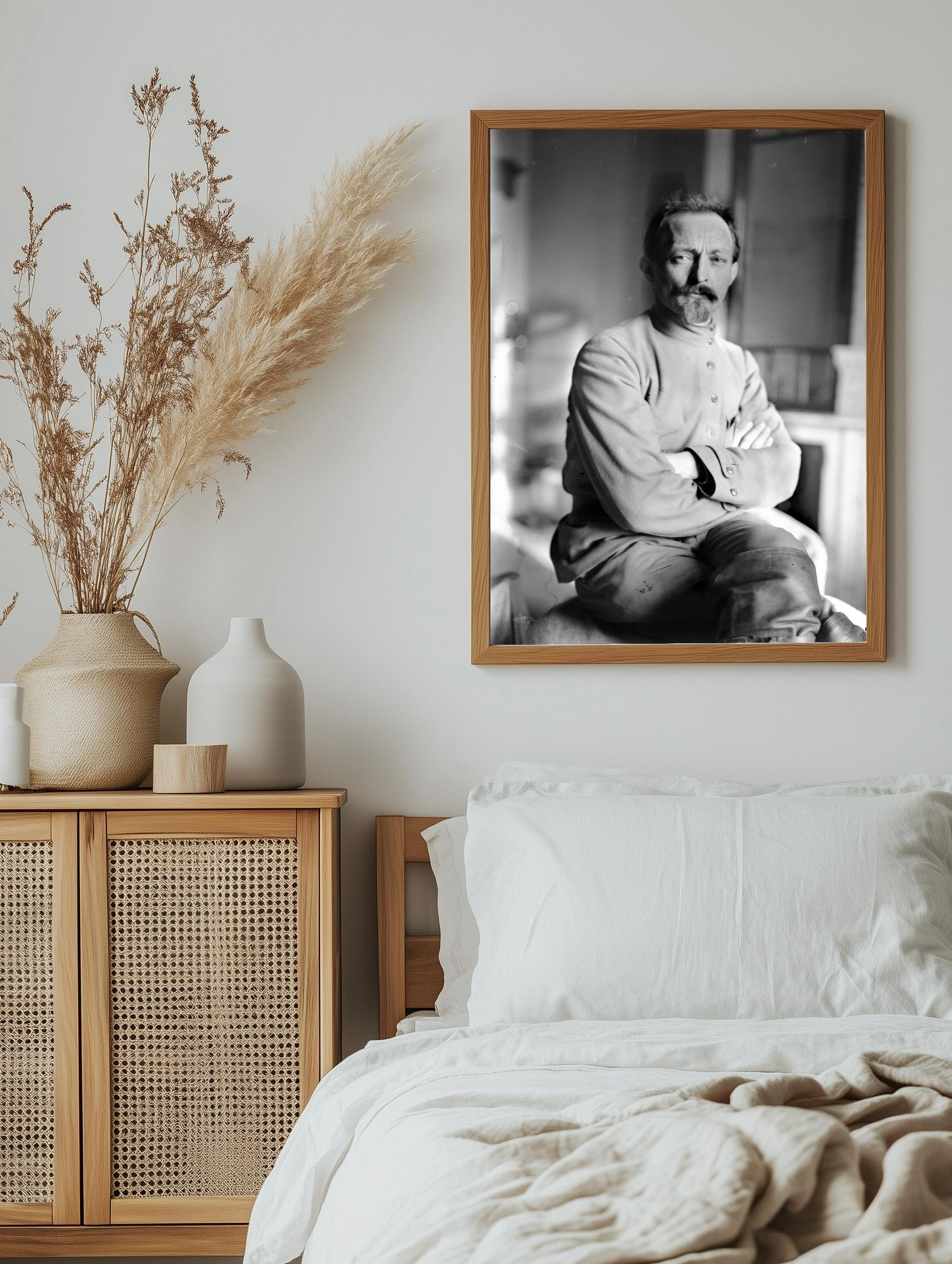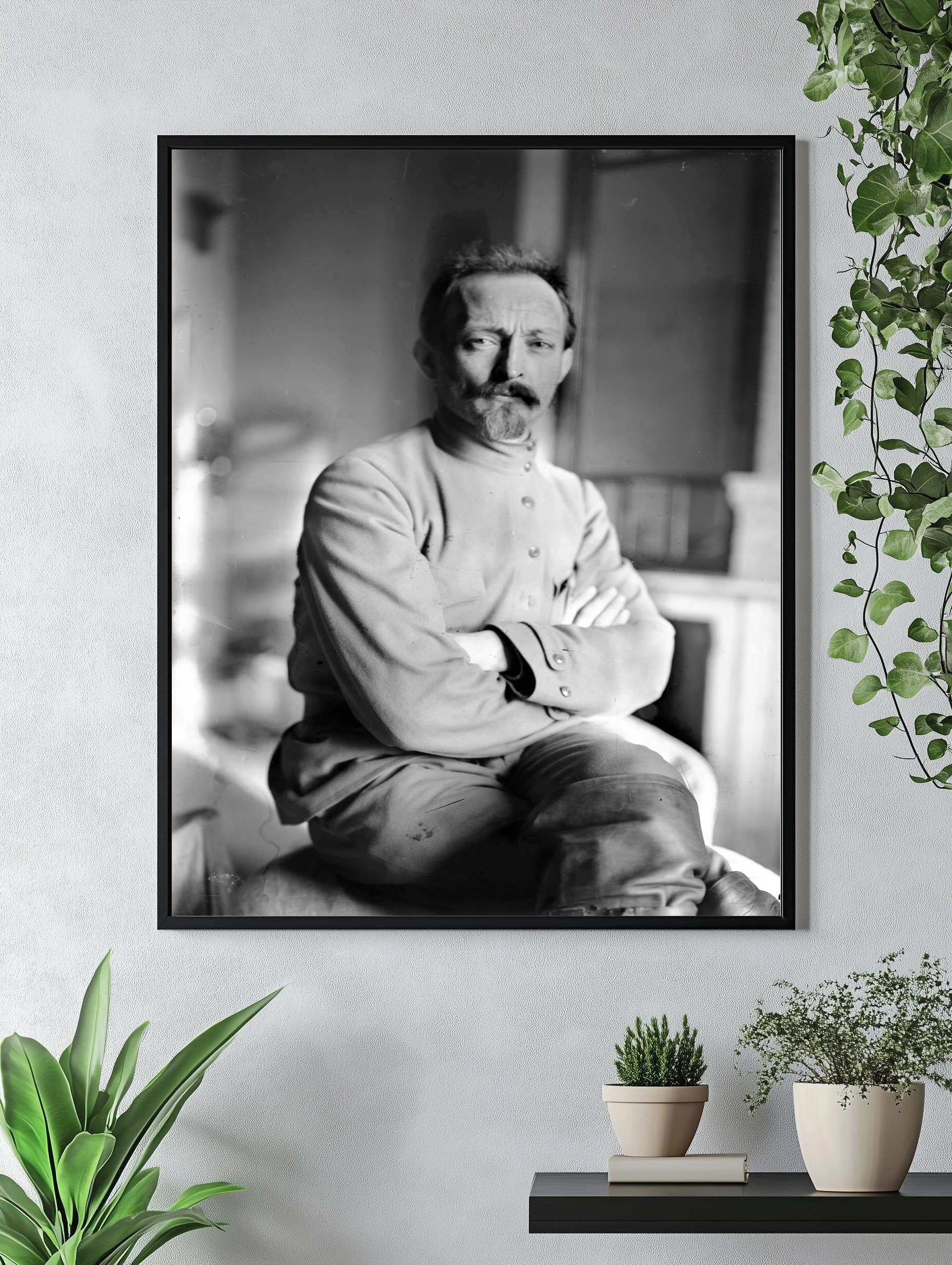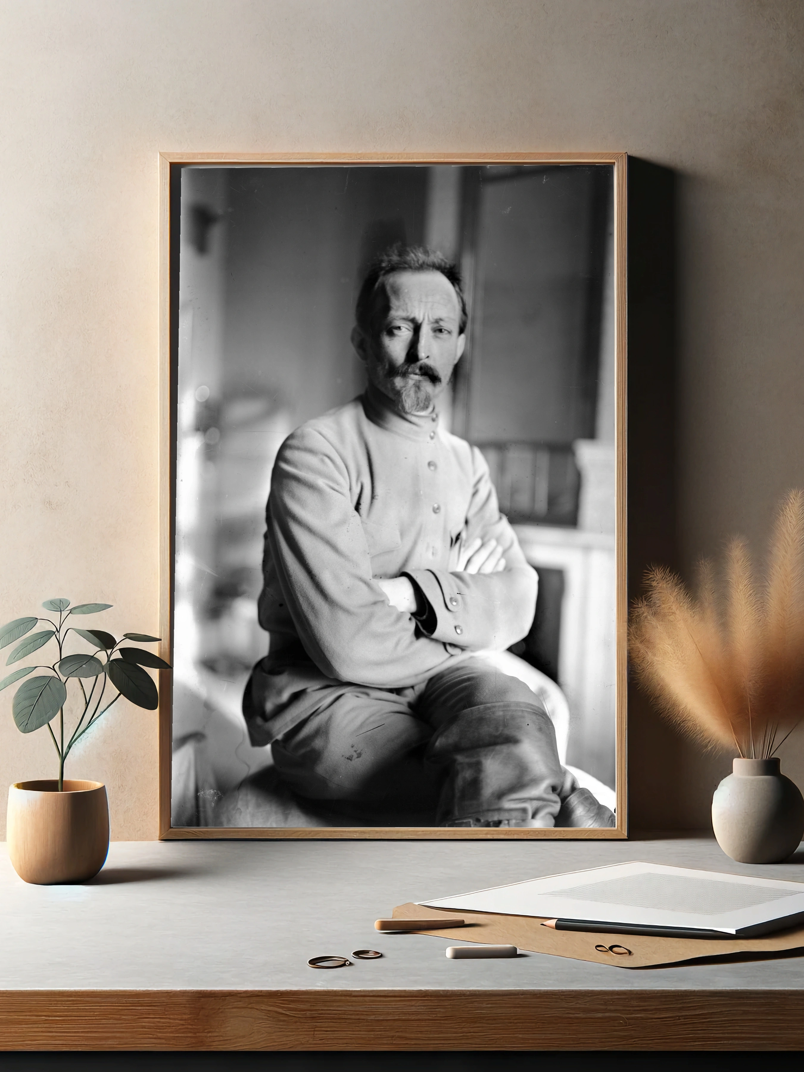 Строгий черно-белый портрет мужчины с усами и бородой, сидящего с перекрещенными руками в комнате. Изображение выполнено в классическом стиле, создавая атмосферу начала XX века. Фотография передает глубокий характер и силу духа, подходит для интерьерного искусства и художественного декора.