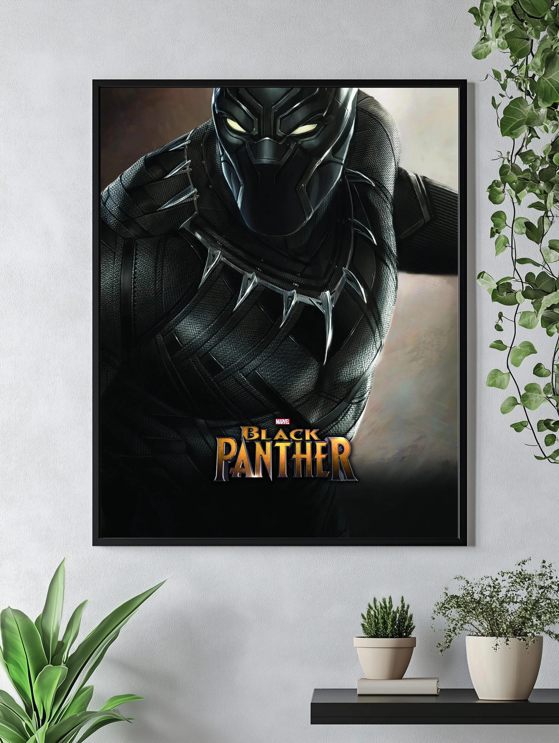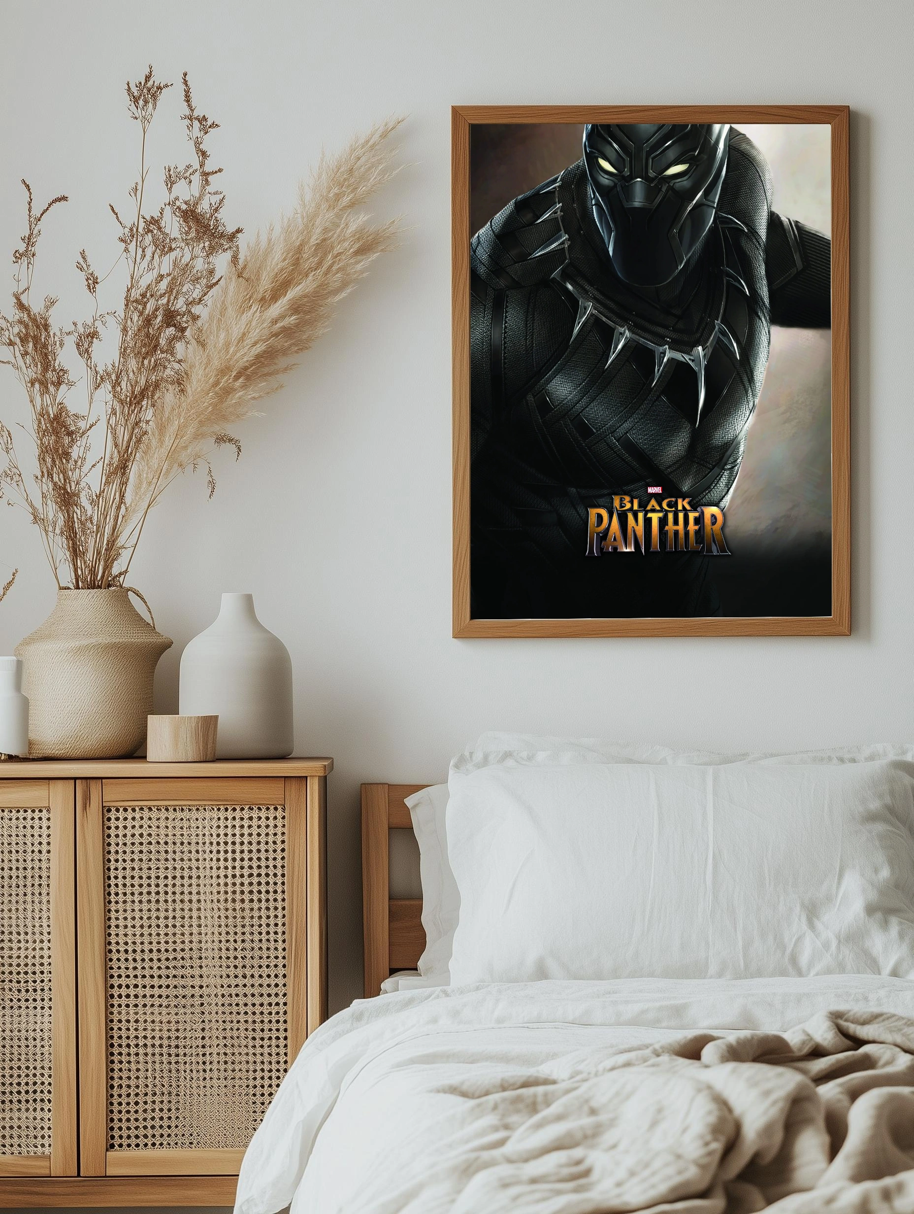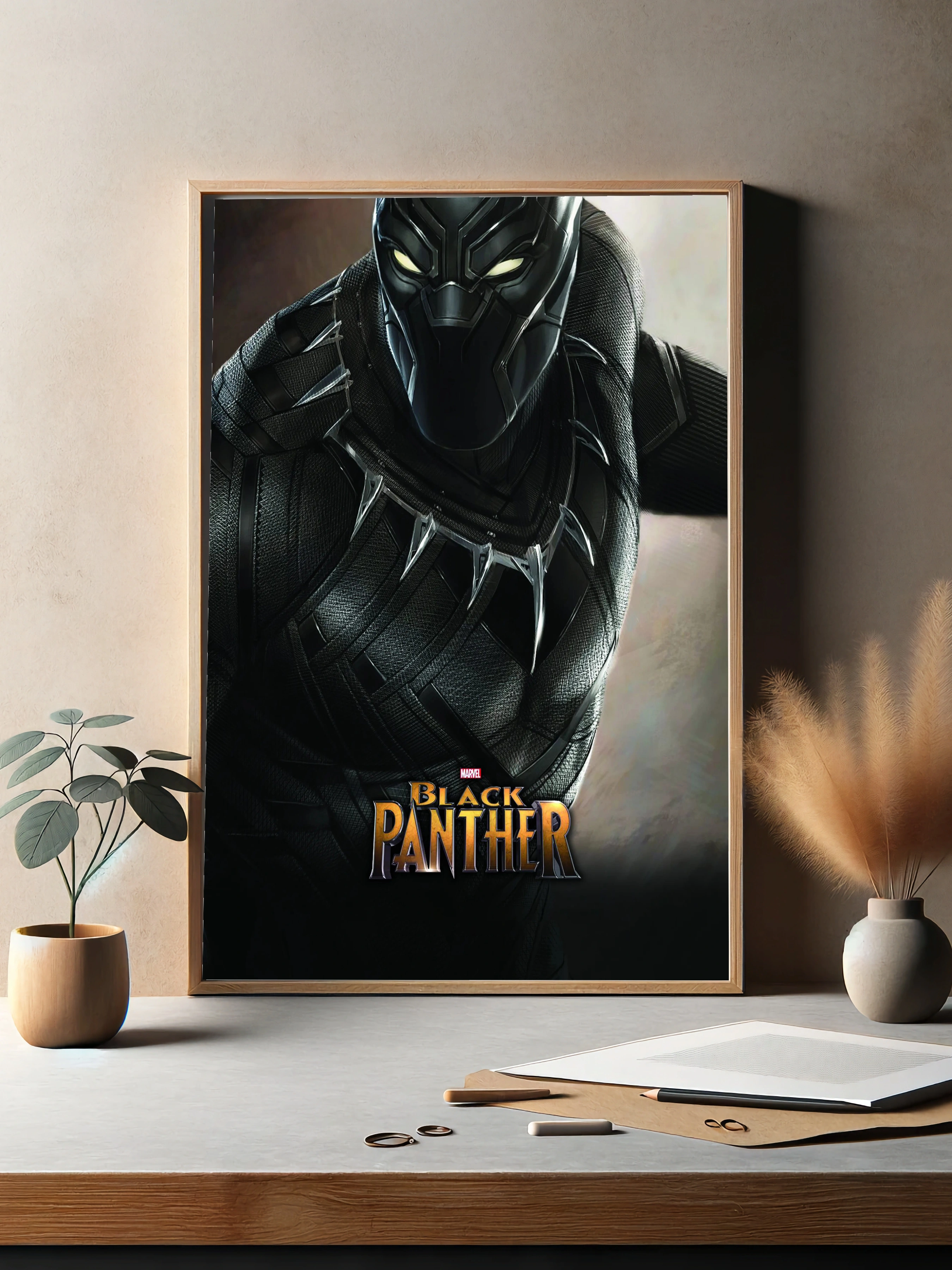 На изображении представлен известный персонаж Marvel — Чёрная Пантера, в динамичной позе, выполненный в стиле хай-тек с акцентом на текстуру костюма и светящиеся глаза. Фон нейтральный, что выделяет героя и создаёт атмосферу силы и решимости. Идеальный интерьерный постер для поклонников современного искусства для стен и декора.