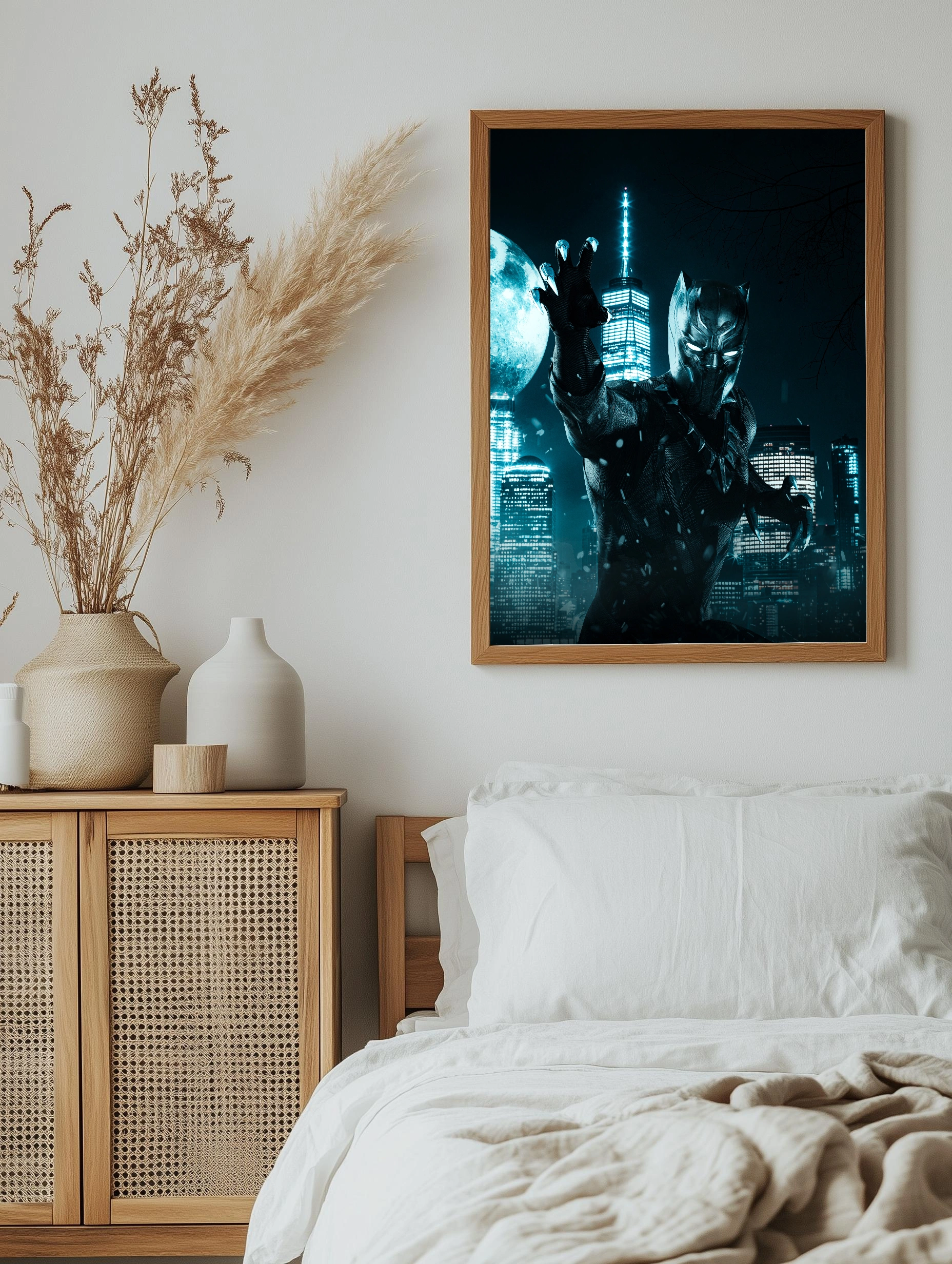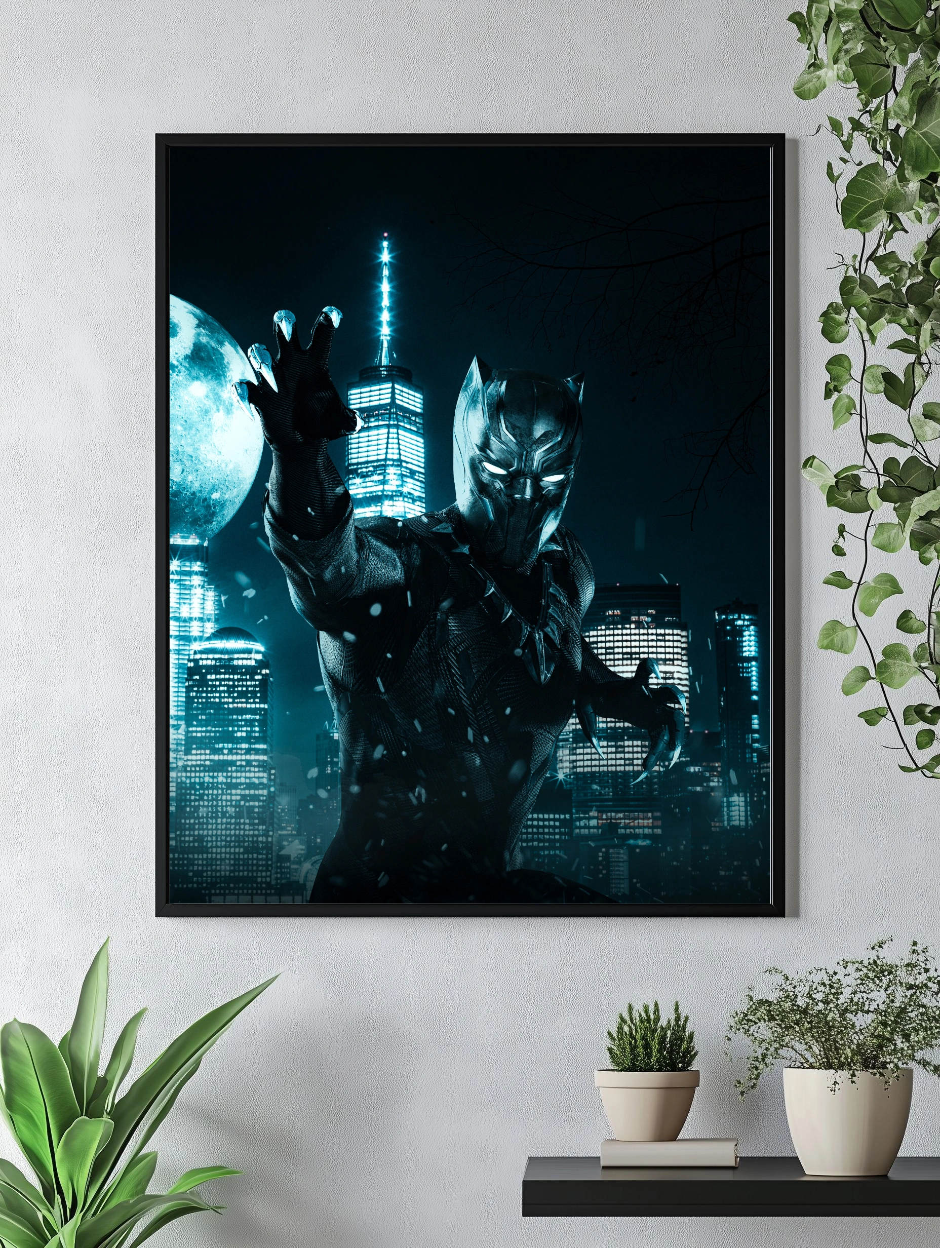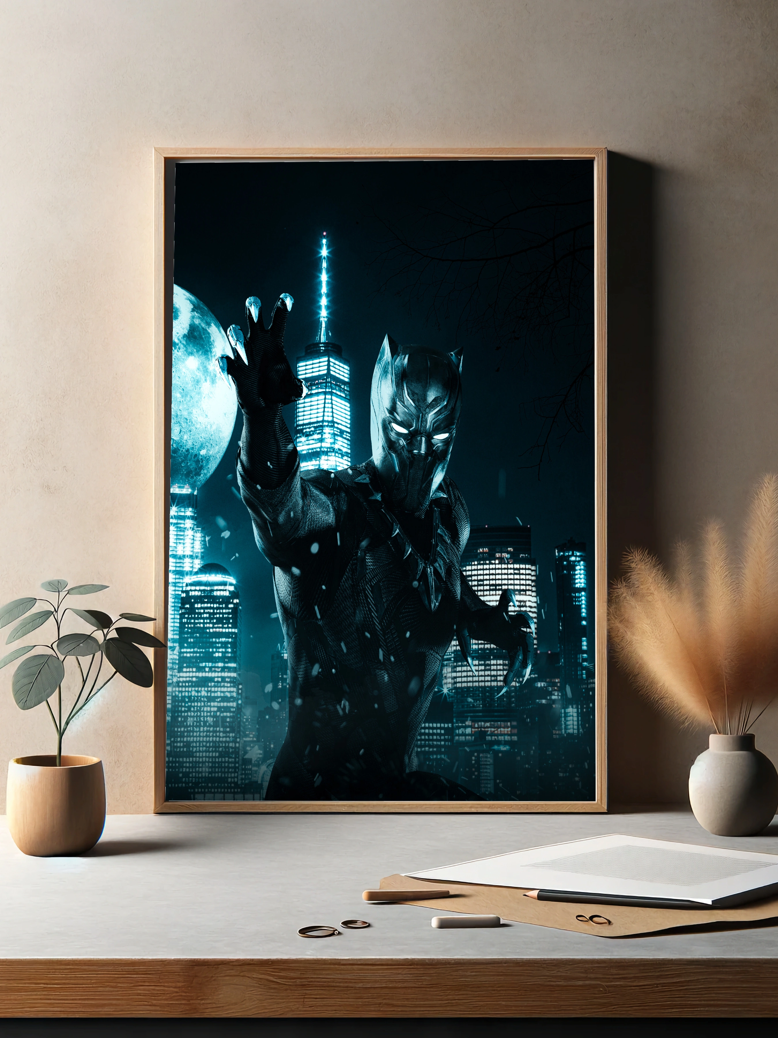 Изображение с Чёрной Пантерой на фоне ночного города с ярко освещённой архитектурой и полной луной. Стиль постера современный, с акцентом на темные и холодные оттенки. Художественный плакат отлично подойдет для интерьера гостиной или офиса, подчеркивая силу, загадочность и технологичность персонажа из мира Marvel.