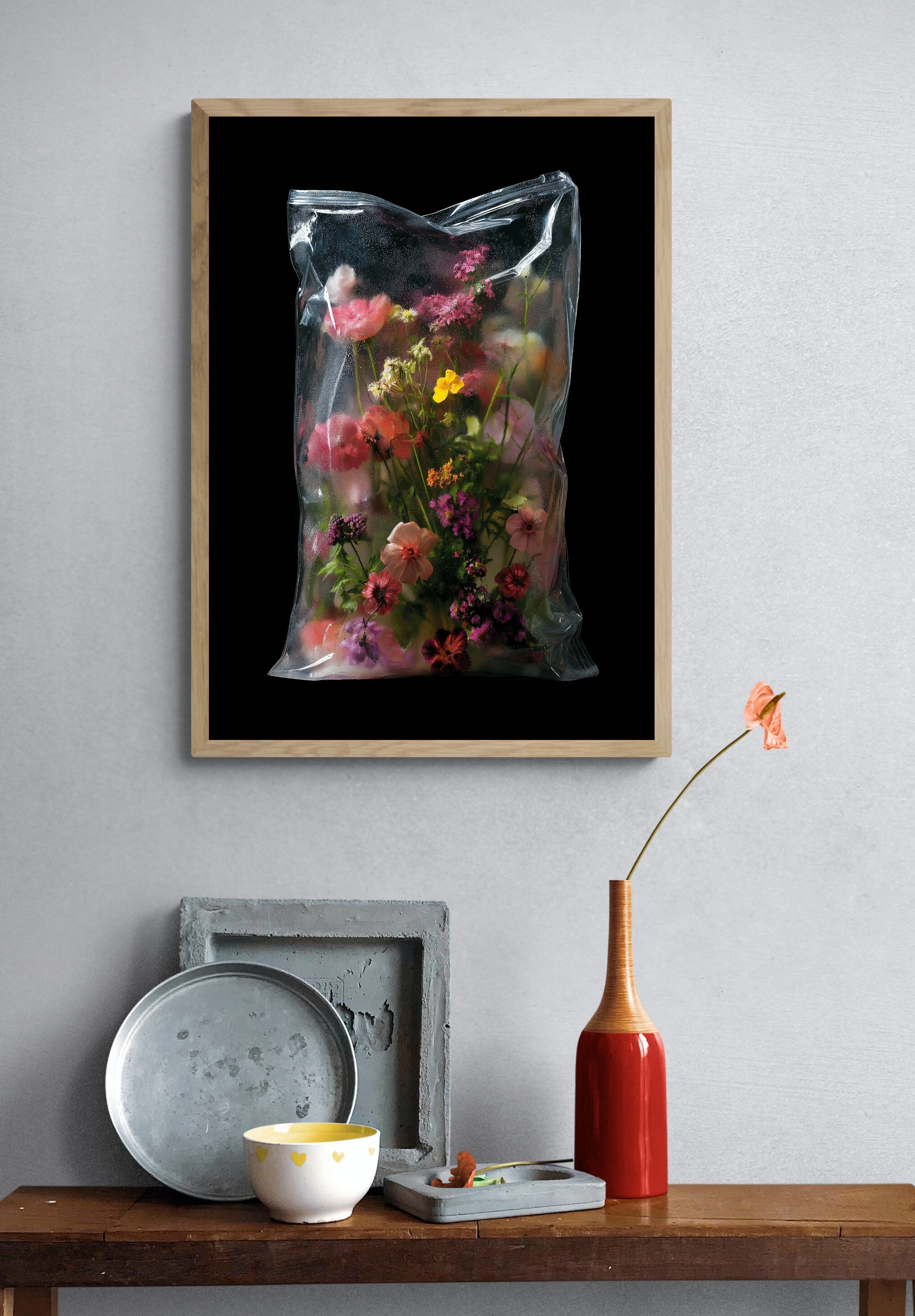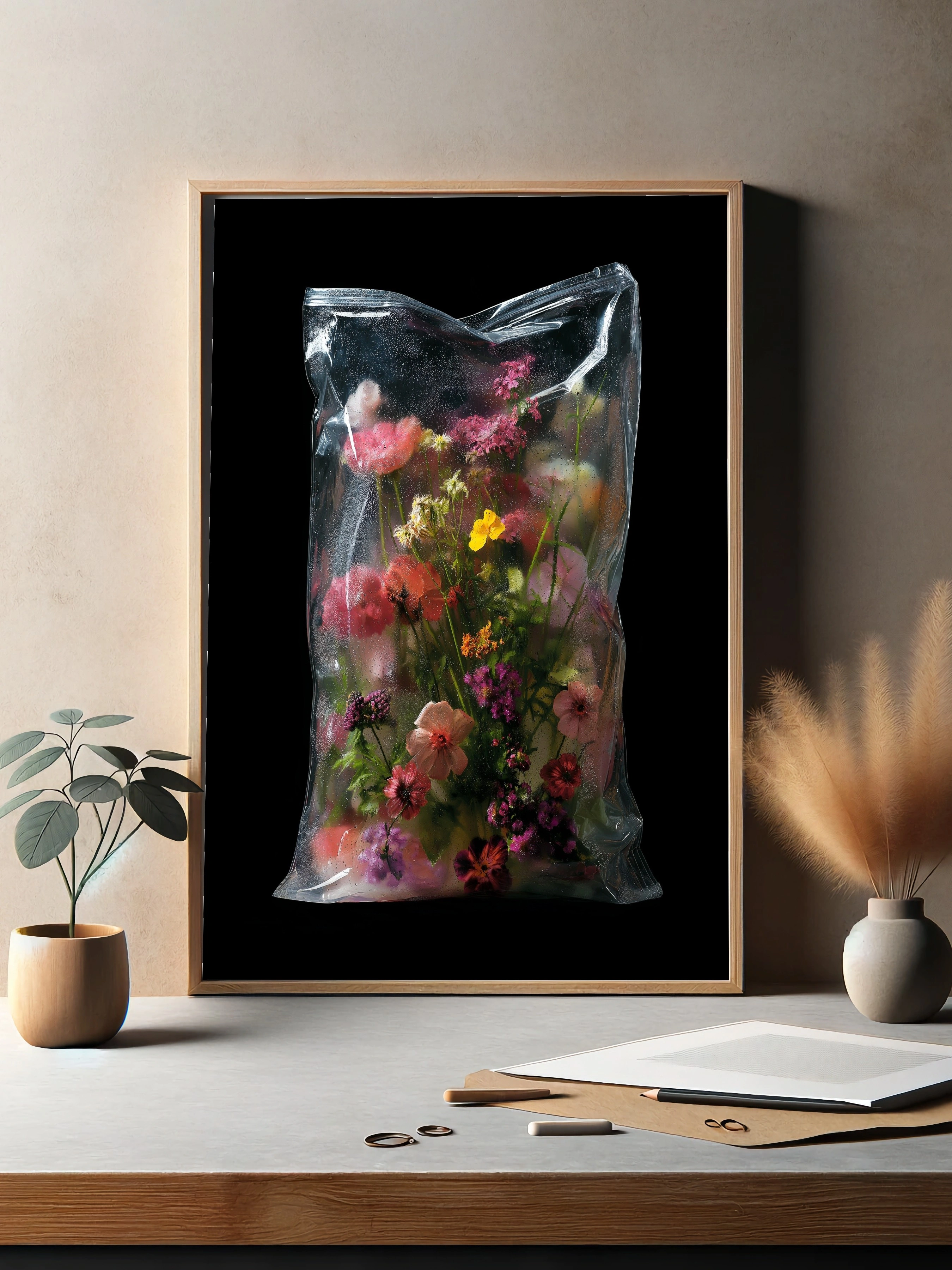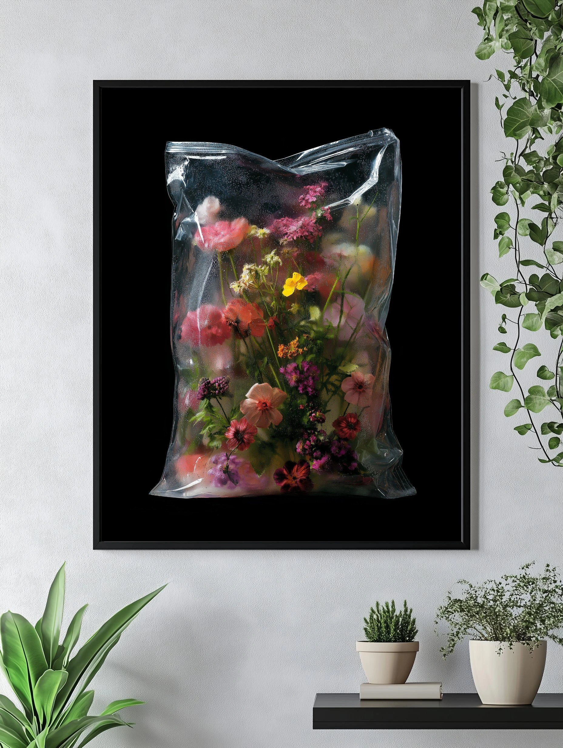 Этот постер представляет собой уникальную композицию, где яркие цветы, такие как розовые и желтые анютины глазки, нежные фиалки и мелкие полевые цветы, заключены в прозрачный пакет. Влага на поверхности пакета создает эффект свежести, подчеркивая красоту и живость растений. На черном фоне цветы выглядят особенно ярко и выразительно, создавая контраст, который привлекает внимание. Стиль изображения можно охарактеризовать как современный минимализм с элементами натюрморта, что придает ему особую атмосферу. Этот постер станет идеальным украшением для гостиной, кухни или офиса, добавляя нотки природы и свежести в любое пространство. Он привлечет внимание молодежи и креативщиков, ценящих оригинальные и стильные решения в интерьере.