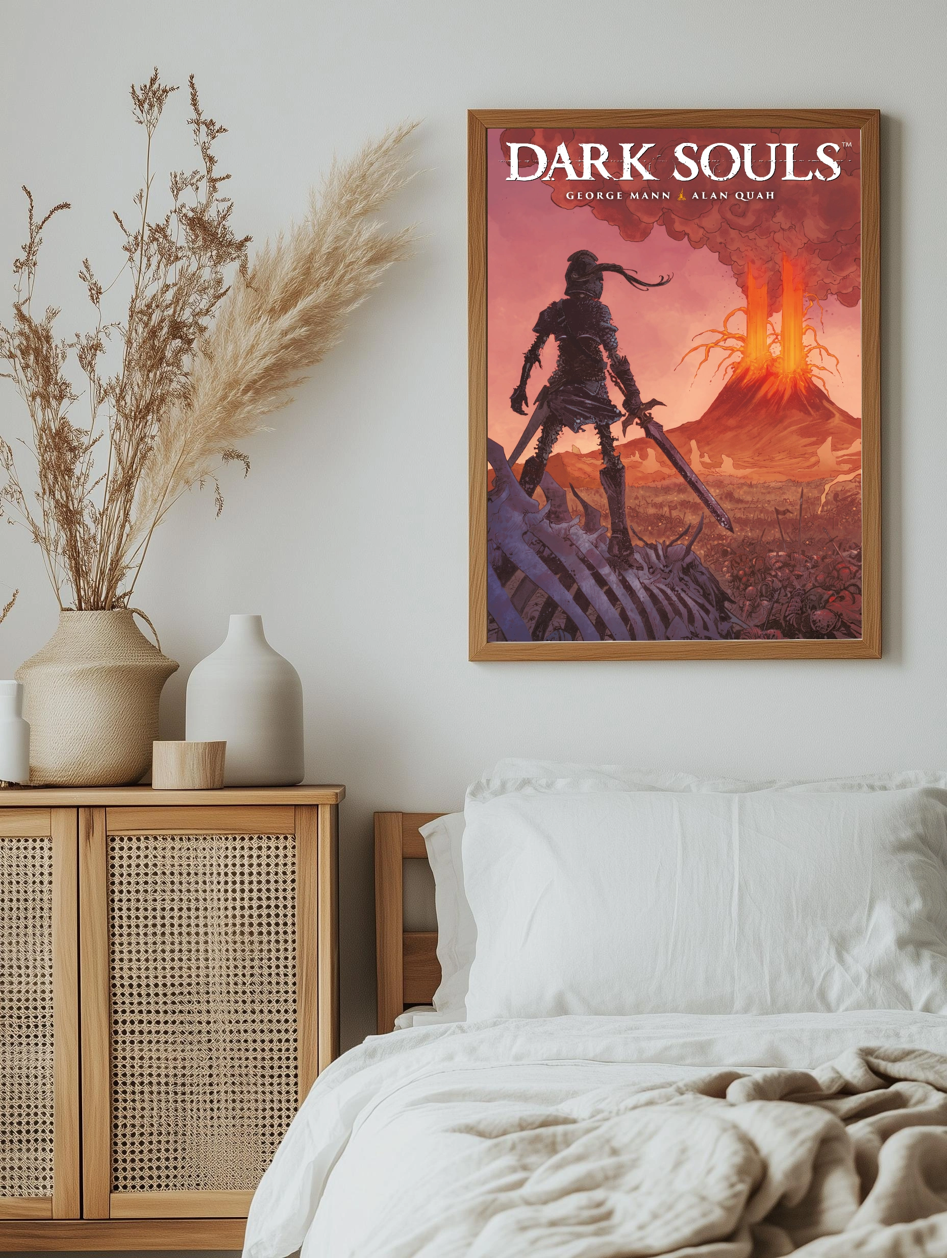 Изображение представляет собой атмосферную сцену из игры Dark Souls с мрачным рыцарем в тяжелых доспехах, стоящим с мечом в руках на фоне извержения вулкана. Использованы насыщенные оттенки красного и оранжевого, создающие ощущение напряжения и опасности. Художественный стиль напоминает комиксы, сочетающий эпическую тематику темного фэнтези и драматизм.