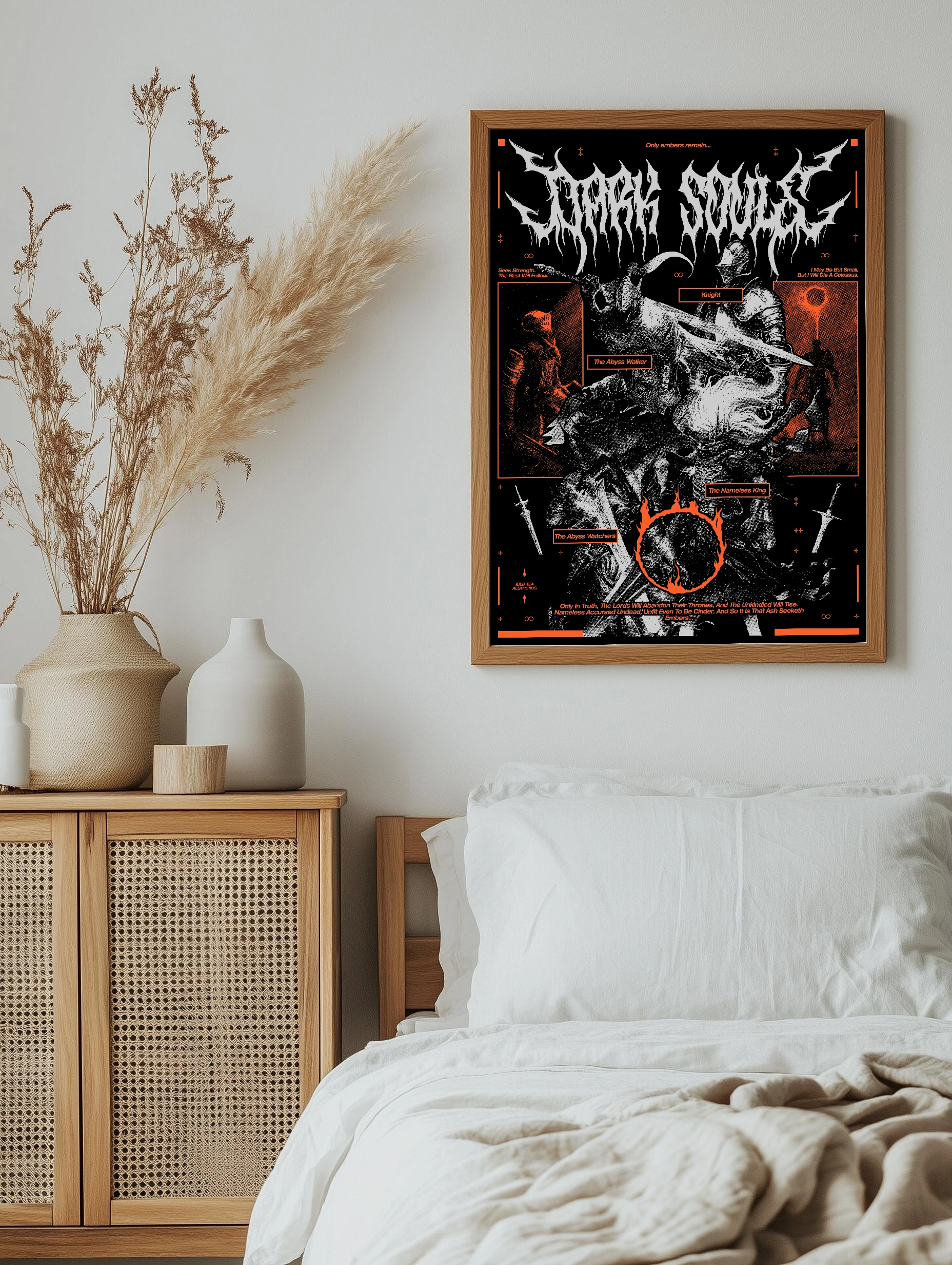 Изображение представляет собой художественный плакат по мотивам популярной видеоигры Dark Souls, выполненный в темно-готическом стиле. На черном фоне выделены рыцари с доспехами и мечами, обозначенные как The Abyss Walker, Knight, The Nameless King и The Abyss Watchers. Акцент сделан на мрачной эпике и атмосфере битвы, дополненной оранжевыми акцентами, символизирующими пламя и огонь. Это интерьерное искусство отлично подойдёт для поклонников фэнтези и игры.
