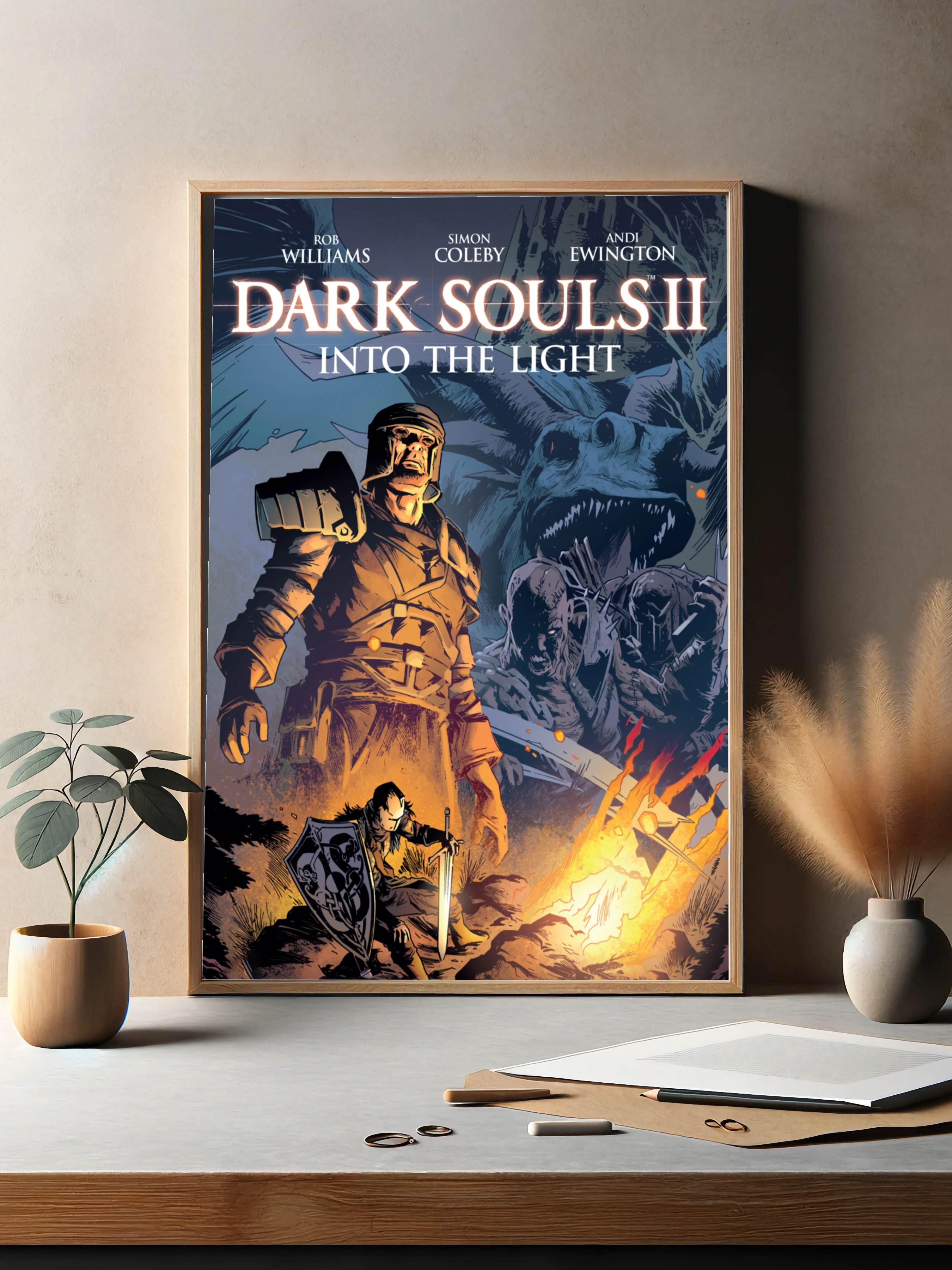 Яркий художественный плакат по мотивам видеоигры Dark Souls II изображает массивного рыцаря в пламенном свете на фоне зловещего дракона и врагов. Стиль напоминает комикс с выразительной графикой и драматическим светотеневым эффектом. Отличный декоративный плакат для интерьера фанатов фэнтези и видеоигр.