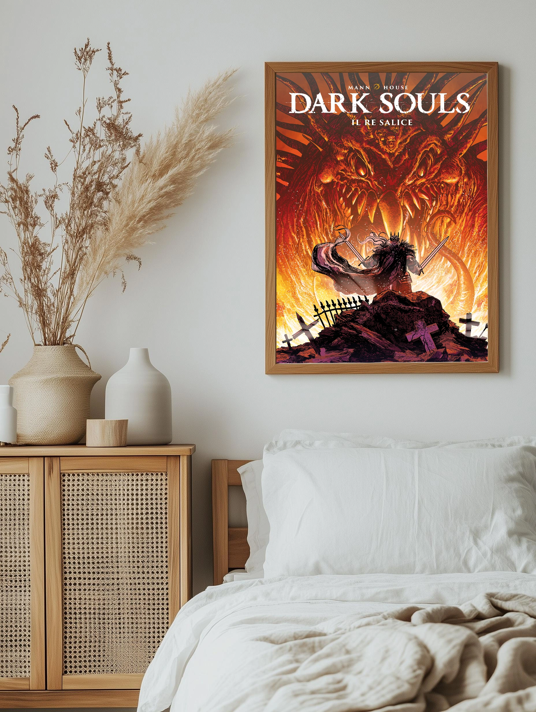 Декоративный плакат, изображающий эпическую сцену из Dark Souls, на котором воин в темных доспехах с короной стоит на горе среди могил, сражаясь с гигантским огнедышащим чудовищем. Картина для гостиной или офиса, наполненная драматизмом и атмосферой современного искусства для стен.