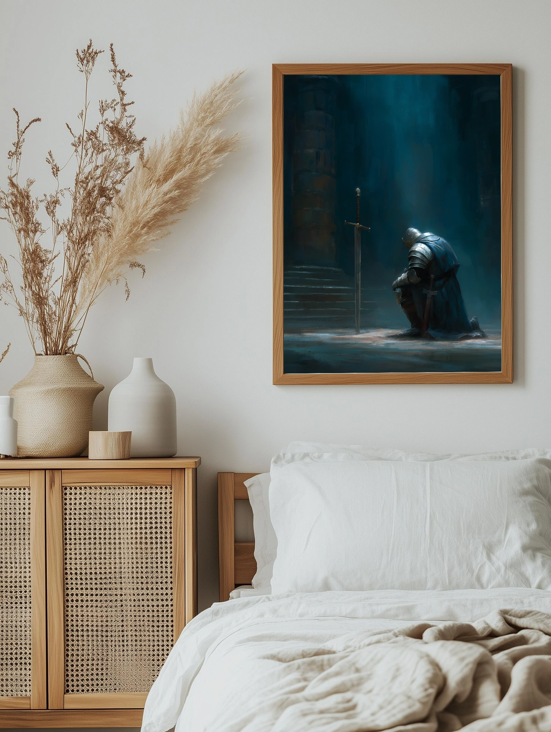 Изображение показывает рыцаря в полном доспехе, преклонившего колено перед мечом в таинственной темной обстановке средневекового замка. Картина выполнена в глубоком синем и сером тоне, создавая атмосферу сосредоточенности, внутренней борьбы и медитации. Этот интерьерный постер с принтом идеально подходит для декора в стиле исторического фэнтези или готики, добавляя драматизма и силы интерьерному искусству.