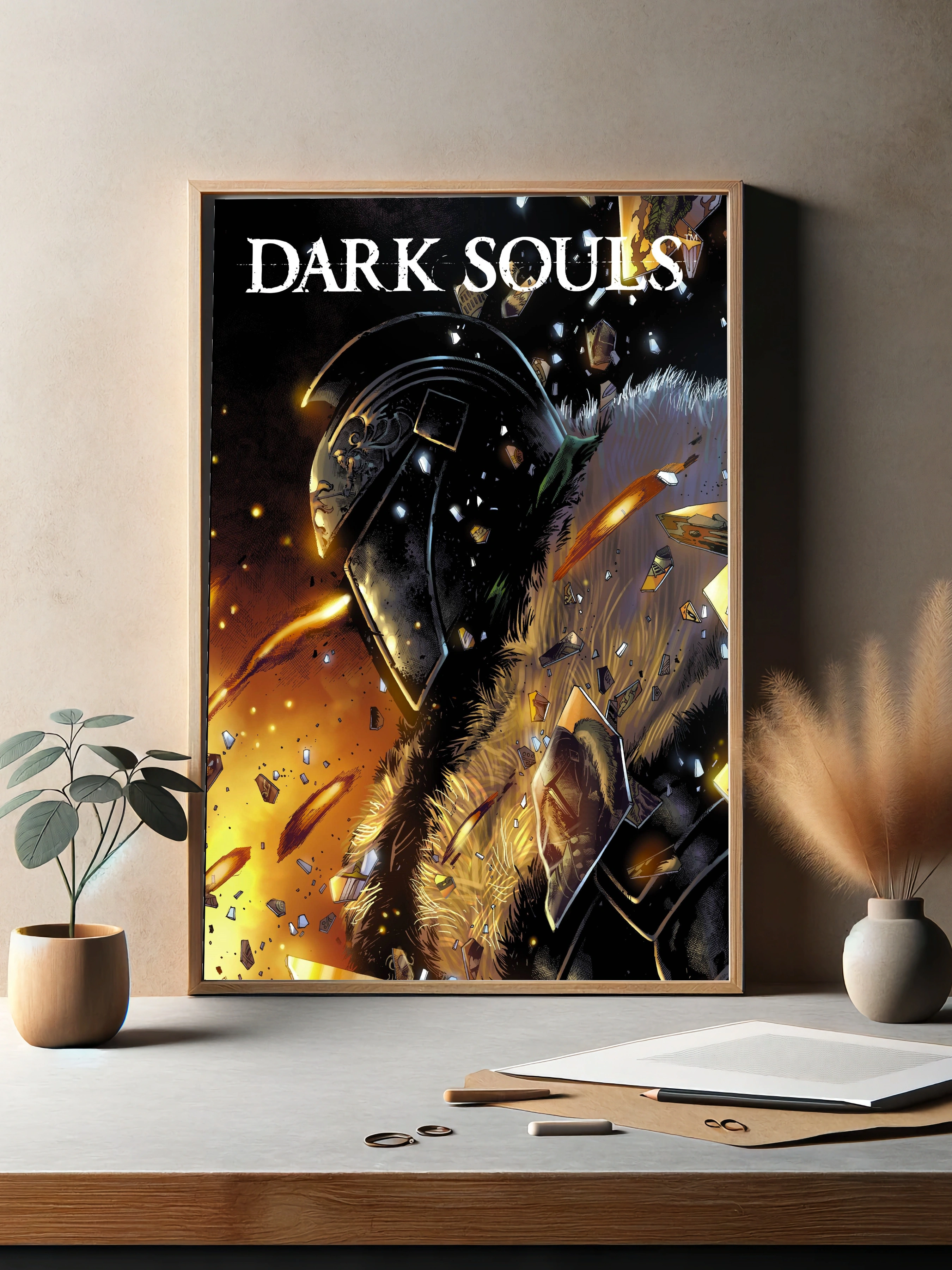 На изображении представлен персонаж из известной видеоигры Dark Souls в стиле темного фэнтези. Иллюстрация выполнена с эффектом взрывающихся осколков и огненных частиц, что создаёт ощущение динамики и драматизма. Этот интерьерный плакат подходит для любителей видеоигр и современного искусства, добавляя атмосферу эпичности и мрака.