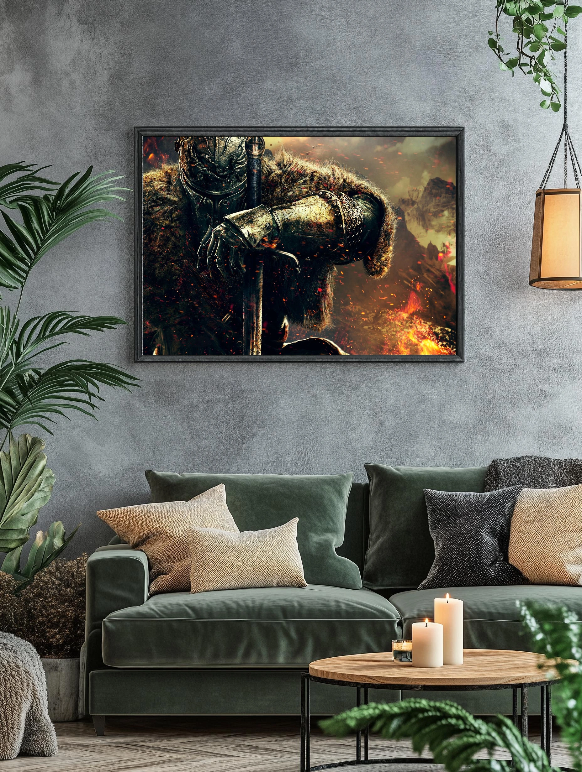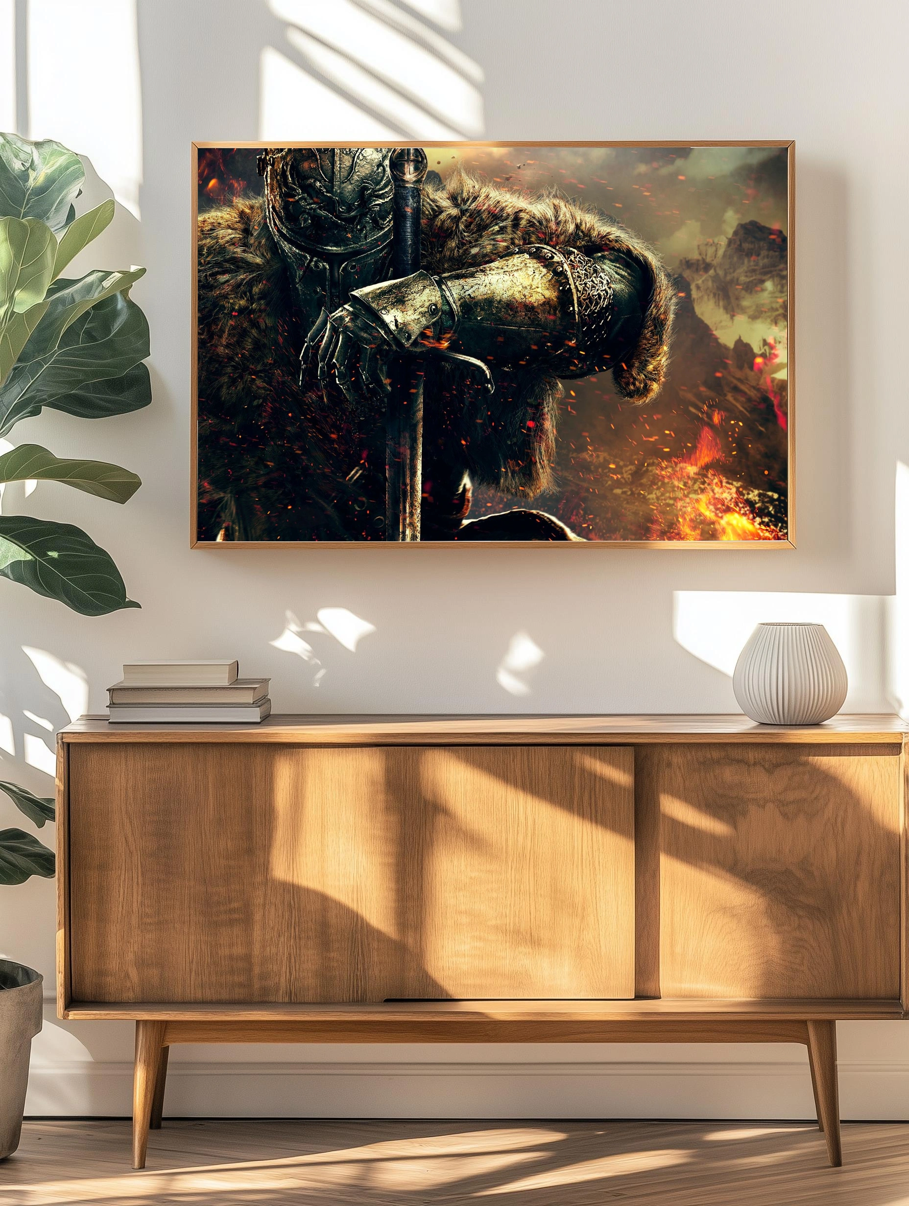 Декоративный плакат с изображением средневекового рыцаря в металлических доспехах и меховой накидке, держащего меч. Атмосфера напряжённая и драматичная, вокруг летают пылающие искры на фоне горящего пейзажа. Картина для гостиной или офиса, создающая эффект силы и стойкости.