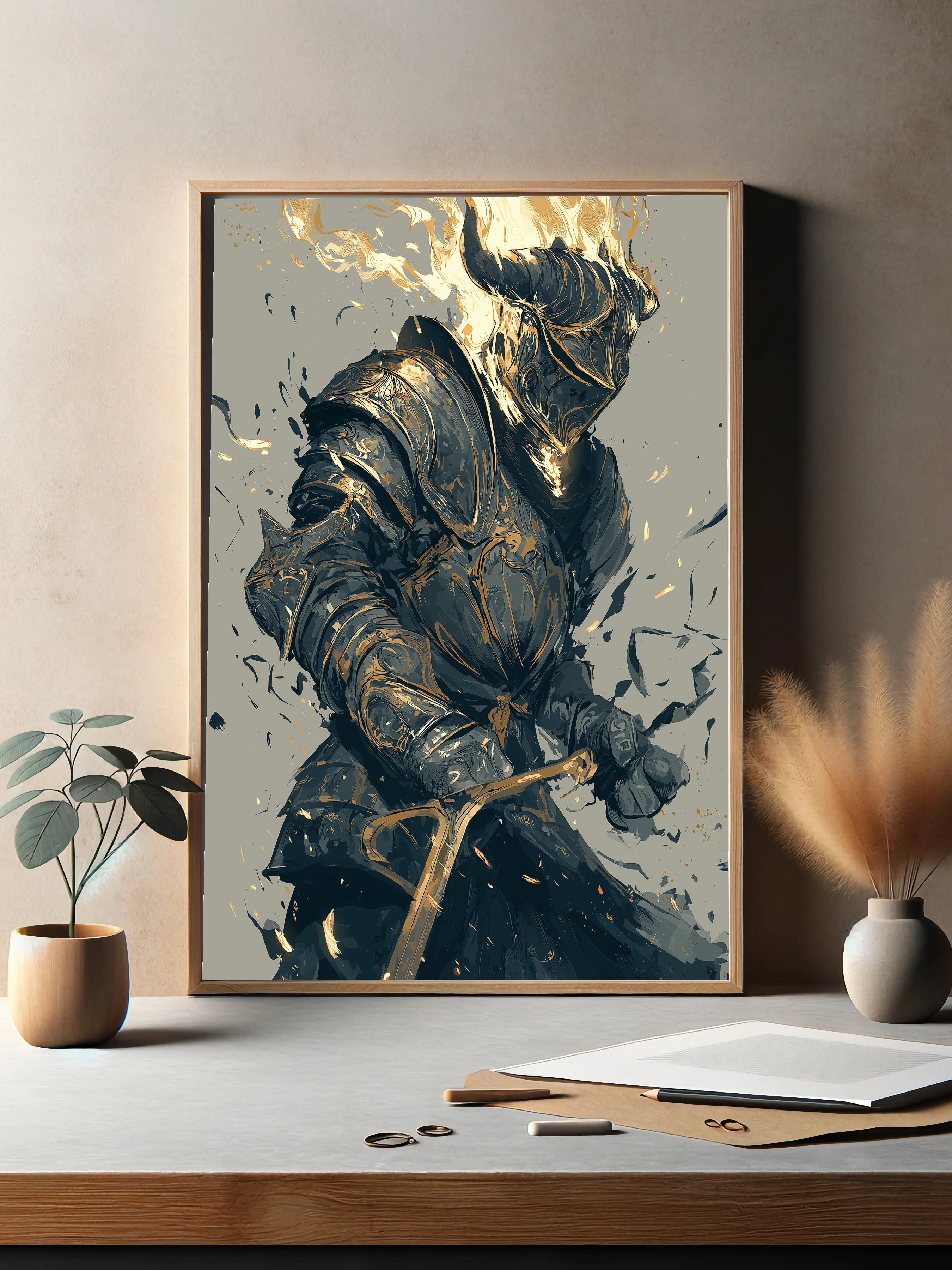 Декоративный художественный плакат с изображением средневекового рыцаря в детализированных горящих доспехах, выполненный в стиле цифровой живописи. Темная сине-серая гамма с яркими акцентами горящего оранжевого и желтого создают атмосферу мощи и героизма. Уникальные картины для дома, отлично подходят для стильного декора стен в гостиной или кабинете.