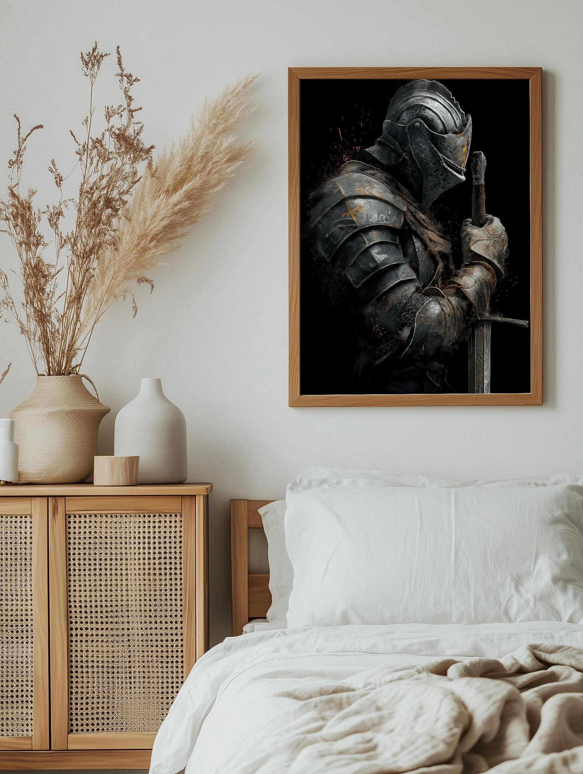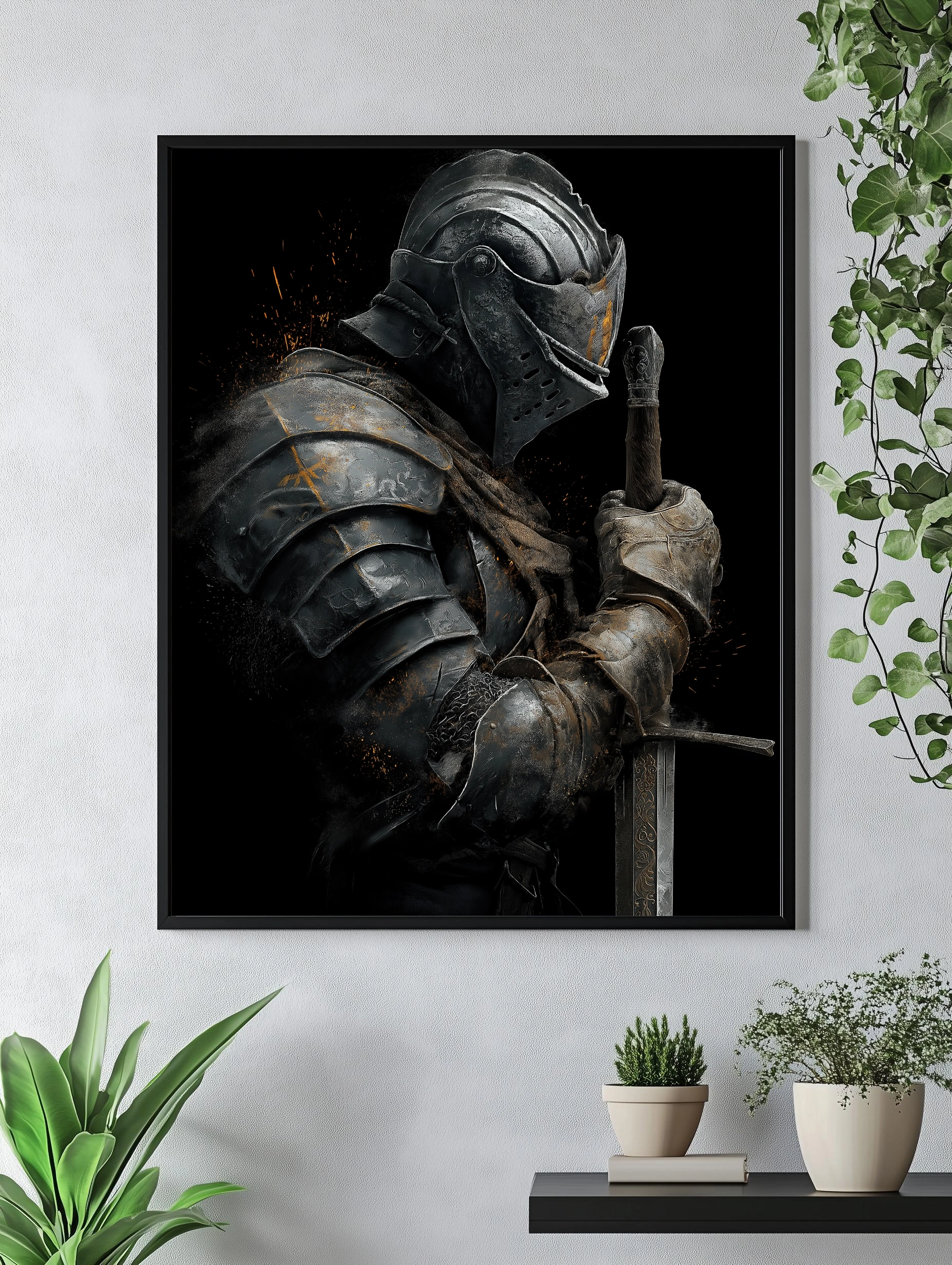 Изображение представляет собой мощный художественный портрет средневекового рыцаря в полной доспехе, держащего меч. Оформлено в темном готическом стиле с акцентом на металлические текстуры и детали брони. Картина идеально подойдет для современного интерьера, добавляя глубину и величественную атмосферу, создавая эффект мистики и героизма.