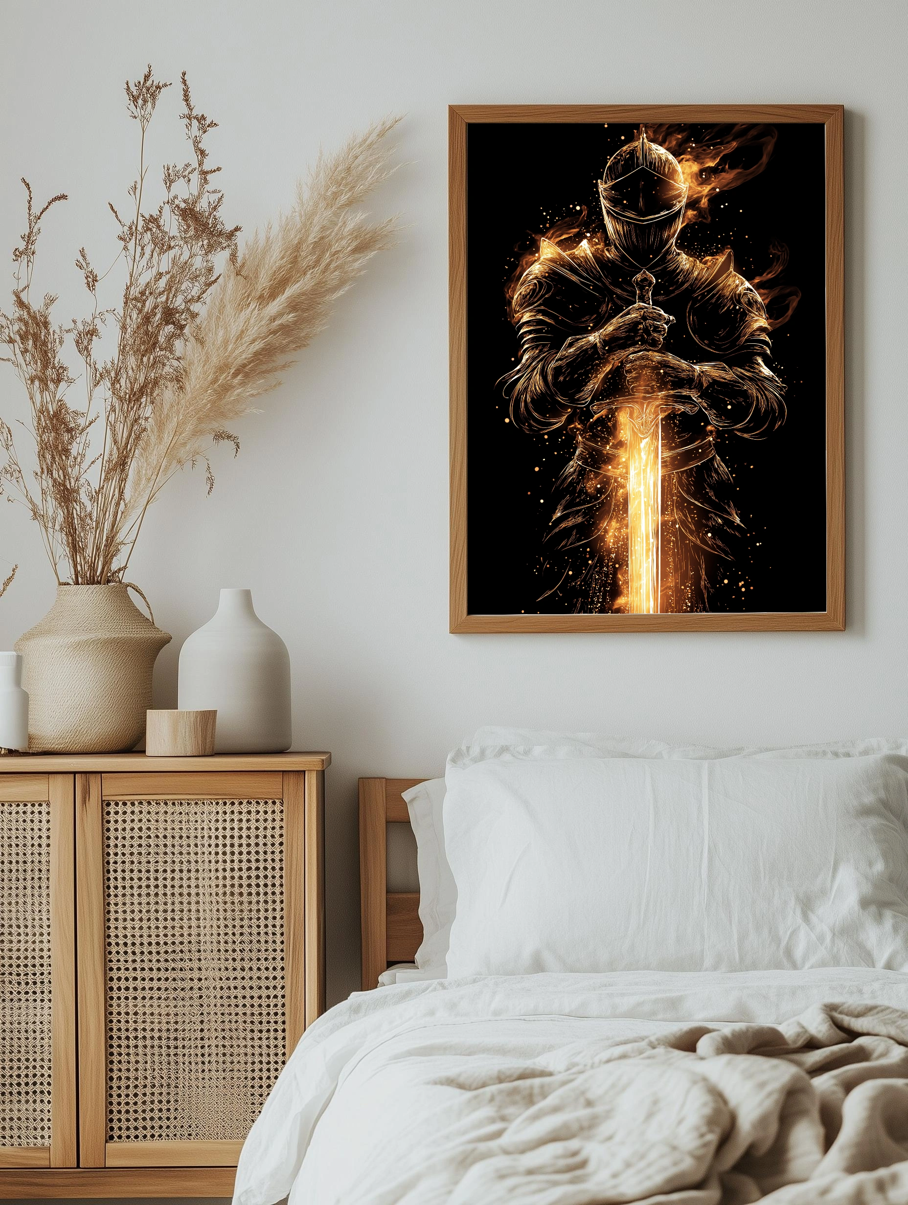 Изображение представляет собой художественный плакат с силуетом рыцаря в полном доспехе, который держит горящий меч. Стиль рисунка стилизован под светящиеся огненные линии на черном фоне, создавая мистическую и мощную атмосферу. Этот декоративный плакат идеально подойдет для современного интерьера спальни, гостиной или офиса и подчеркнет индивидуальность любого пространства.