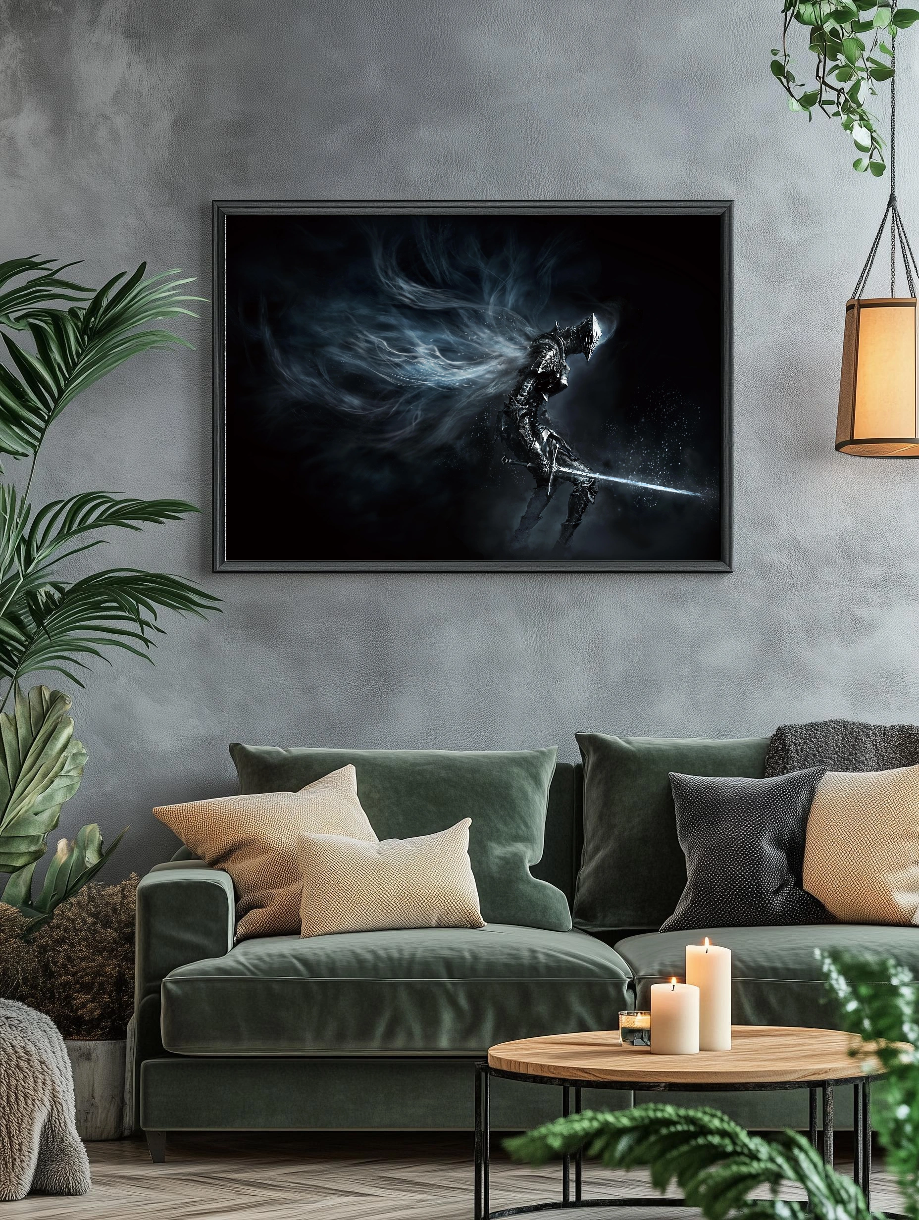 На изображении представлен мрачный воин в темных доспехах с длинным светящимся мечом, словно из фантастического или фэнтезийного мира. Фон глубокий черный с дымчатыми, парящими элементами, создающими атмосферу мистики и напряжения. Этот интерьерный постер наполнен динамикой и силой, отлично подойдет для современной гостиной или офиса.
