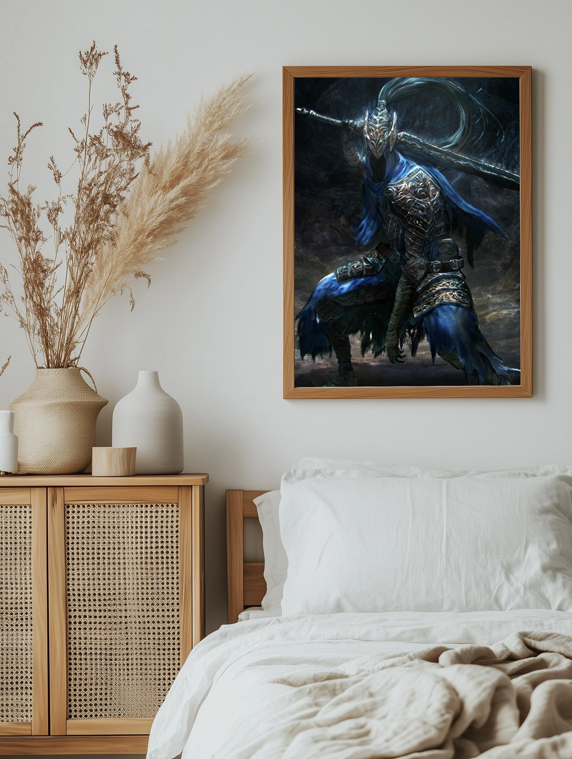 Изображение показывает загадочного рыцаря в тяжелых металлических доспехах с богато украшенным шлемом и щитом, а также заметным синим плащом. Фон мрачный, с темными, почти дождливыми оттенками, создающими атмосферу ночной битвы или глубокого подземелья. Это мощная картина для гостиной или офиса в стиле интерьерного искусства с элементами фантазийного и готического искусства.