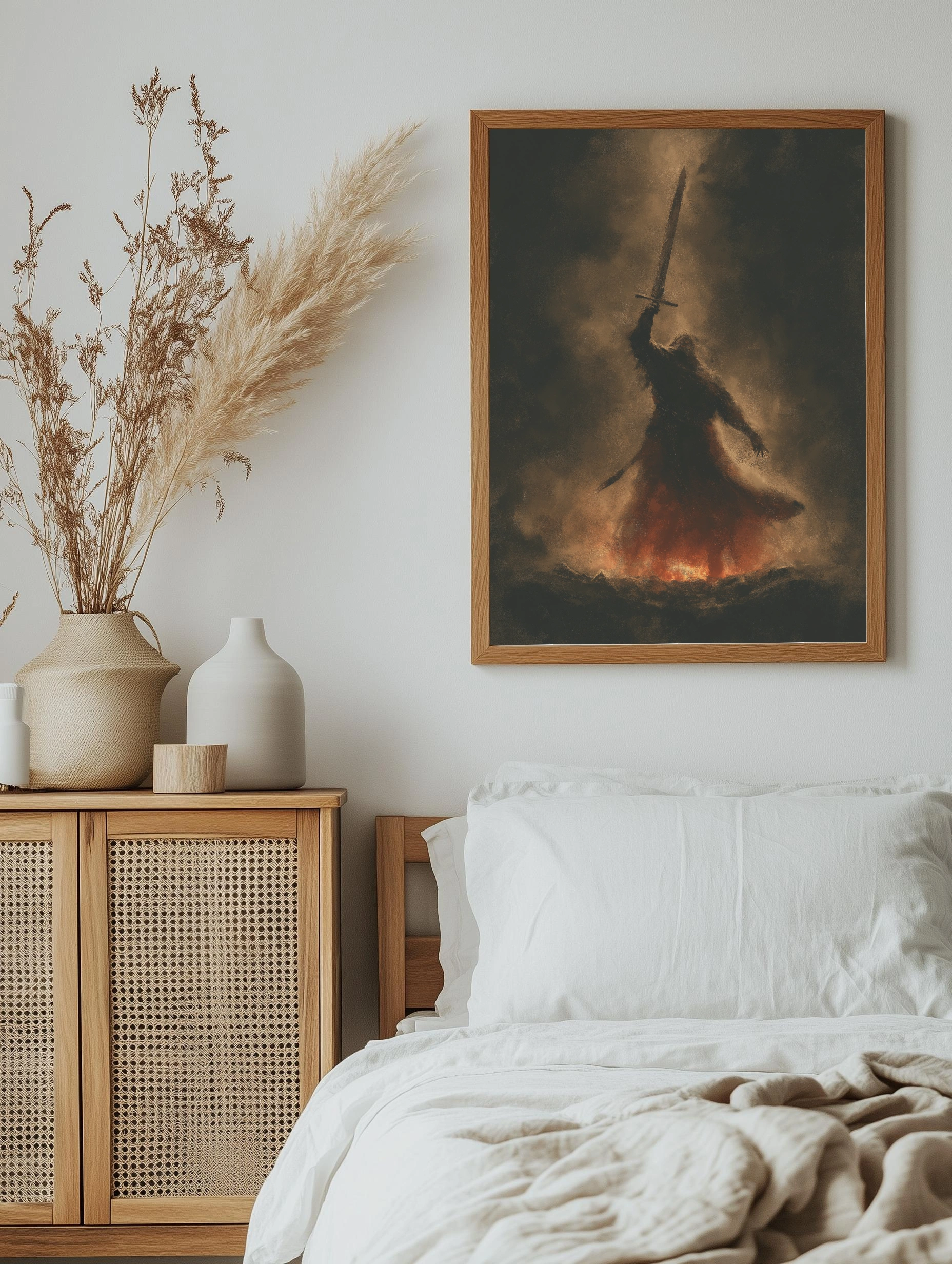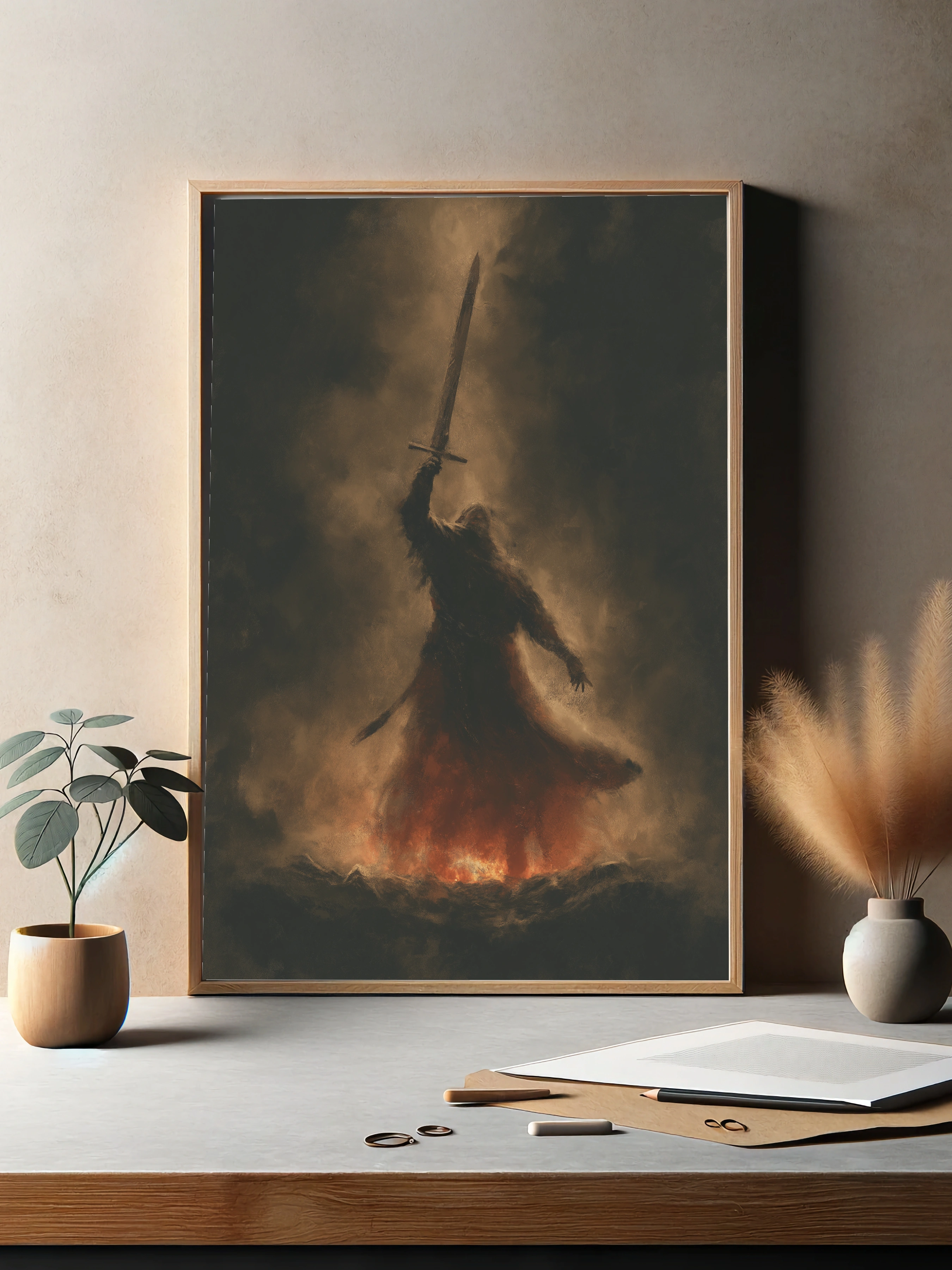 Динамичная картина с изображением воина, поднимающего меч к небу на фоне огня и тумана. Темный силуэт героя окружен жарким светом, создающим атмосферу сражения и мощи. Идеальное интерьерное искусство для спальни или офиса, подходящее как декоративный плакат с принтом для стильного декора стен.