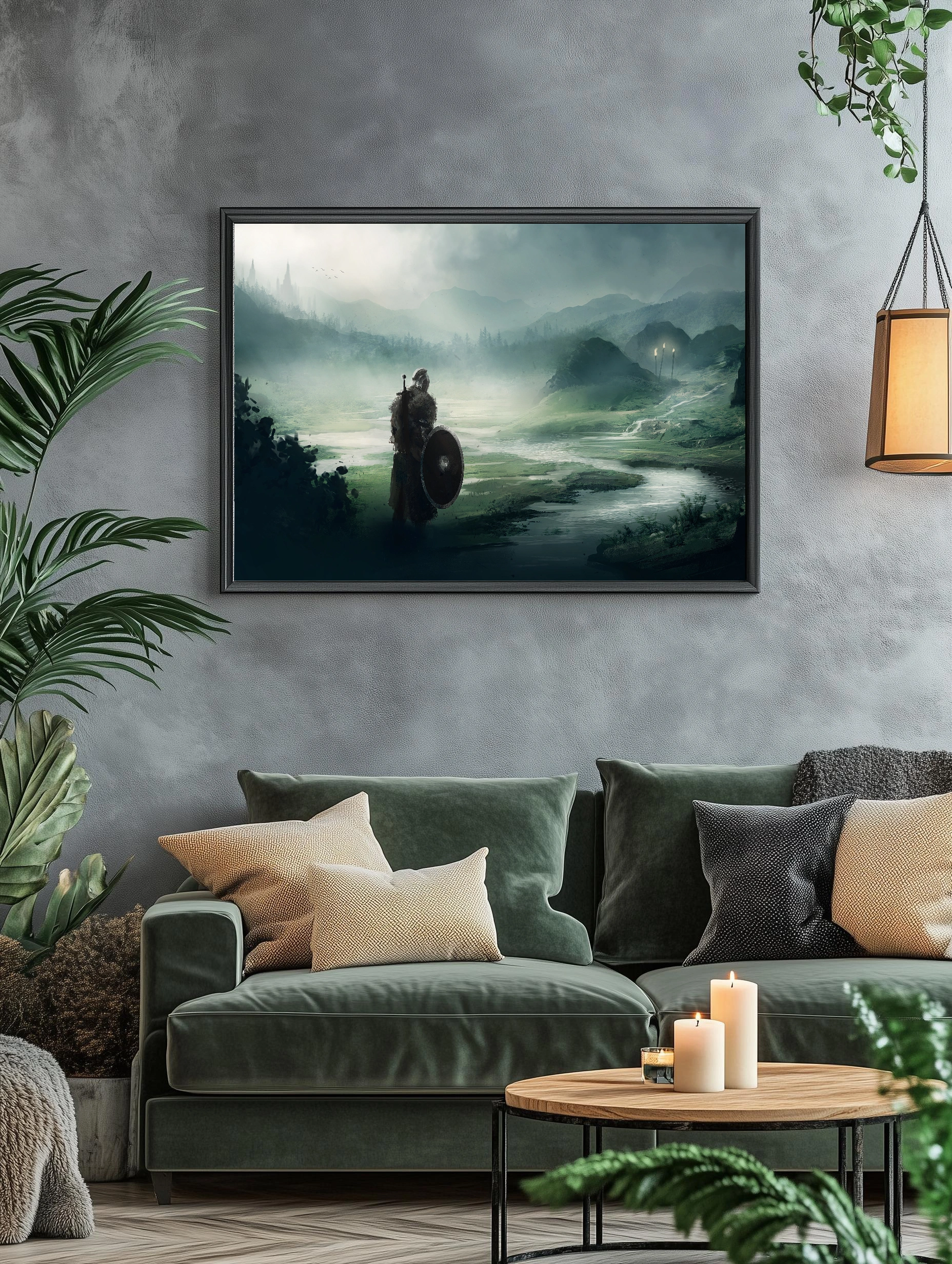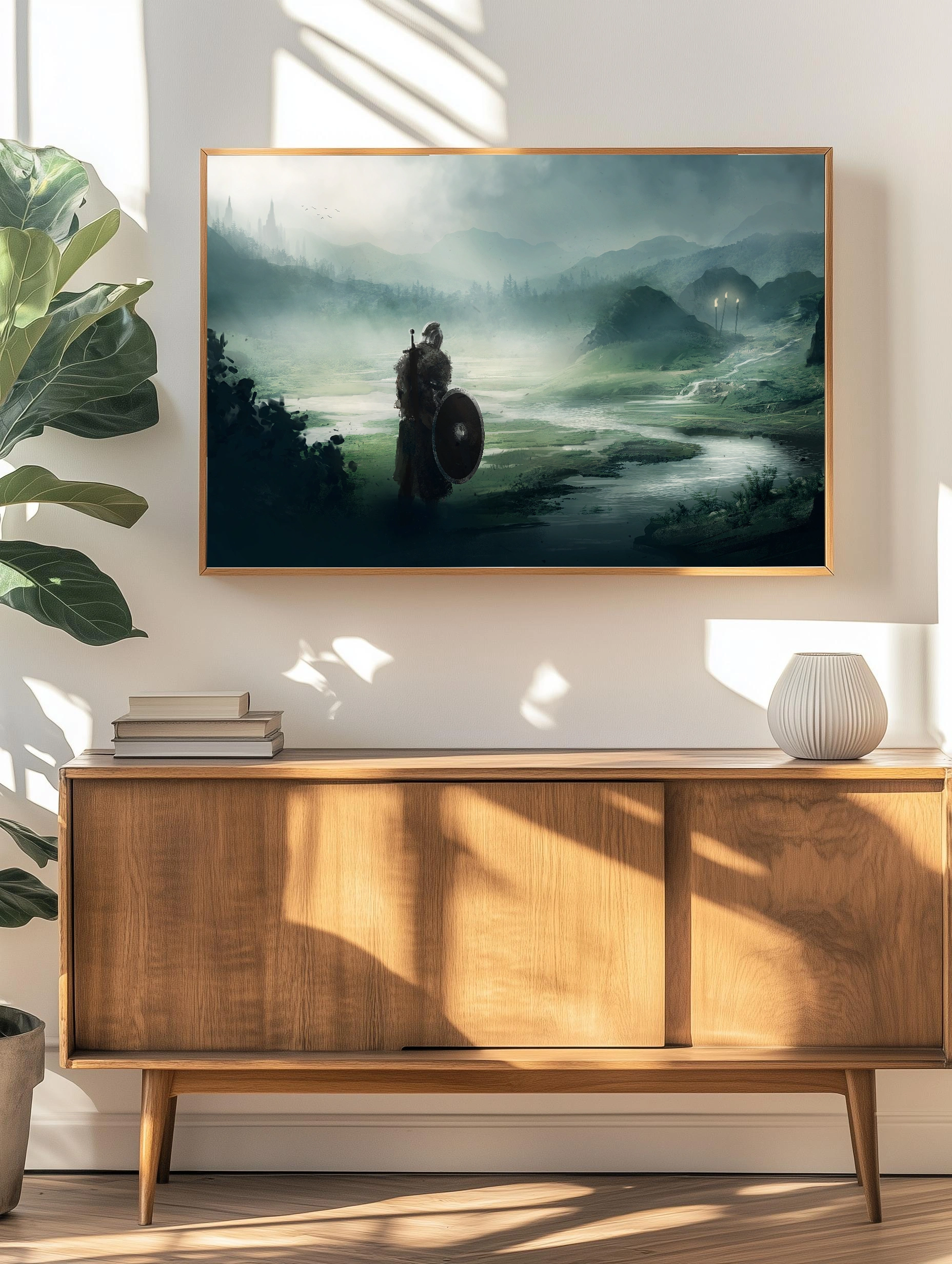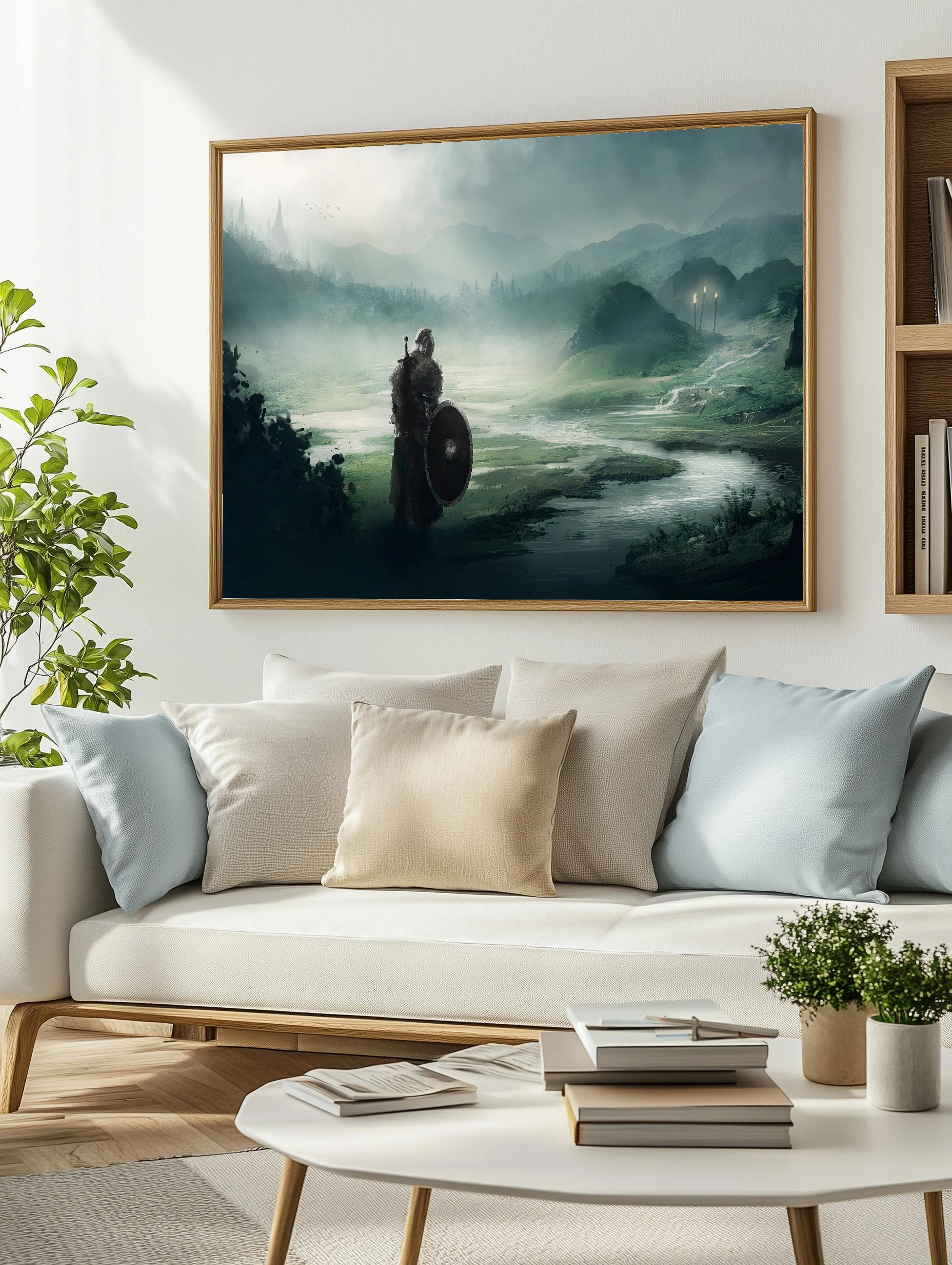 Художественный интерьерный плакат с изображением одинокого воина в доспехах, стоящего на берегу реки среди туманных гор и лесов. Картина передает атмосферу загадочности и средневекового эпоса. Преобладающие оттенки придают работе лёгкость и глубину, создавая стильный декор стен для гостиной или кабинета.