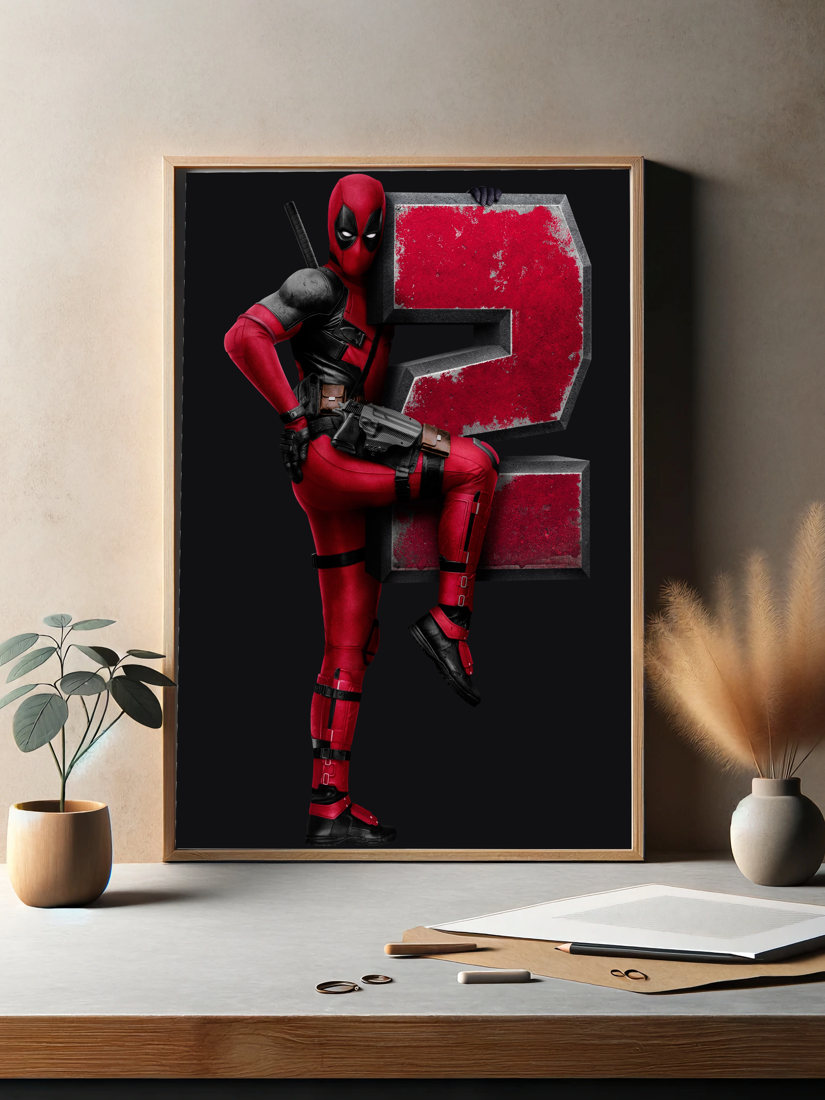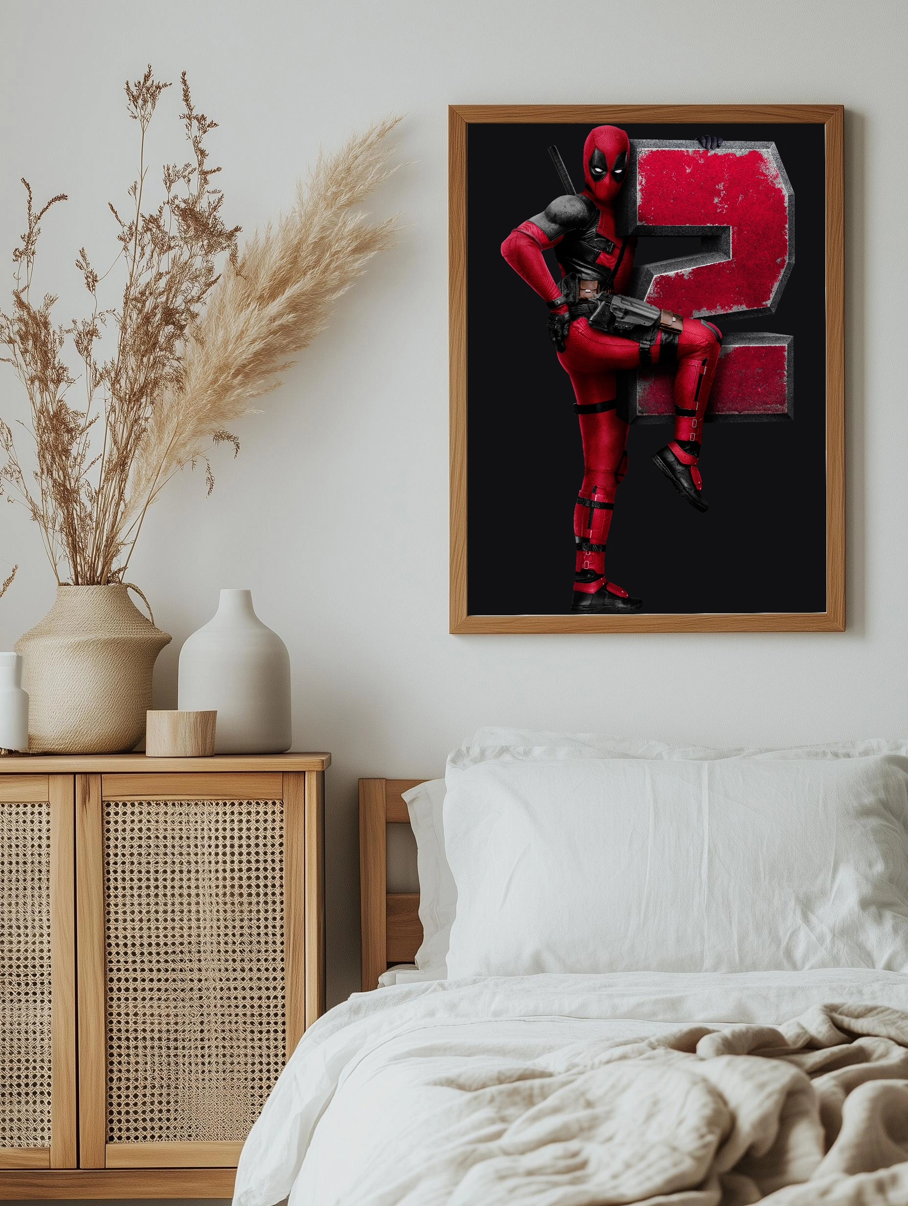 На изображении представлен известный персонаж Marvel — Дэдпул в ярко-красном и черном костюме, держащий большую цифру ‘2’. Стиль фото реалистичный с акцентом на детали его экипировки. Чёрный фон подчёркивает насыщенные красные оттенки, создавая эффект современного искусства для стен, декоративного плаката и интерьерного постера. Такой художественный плакат идеально подходит для декора гостиной, офиса или спальни.