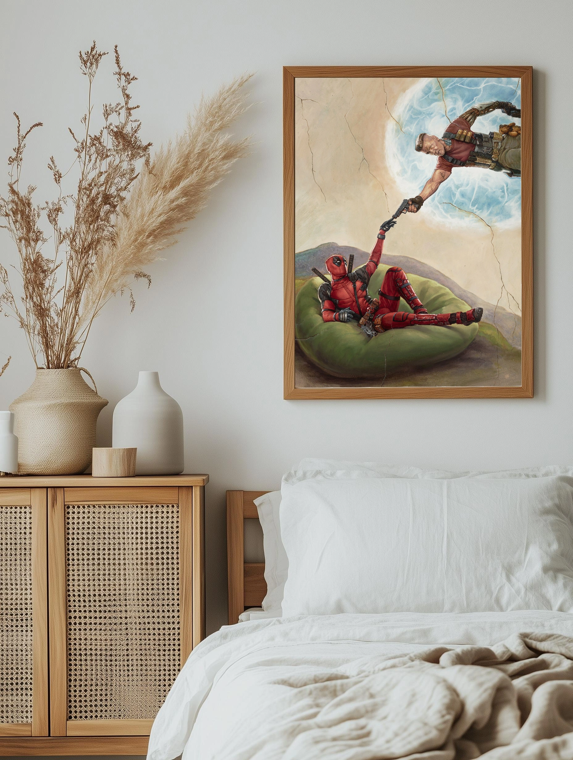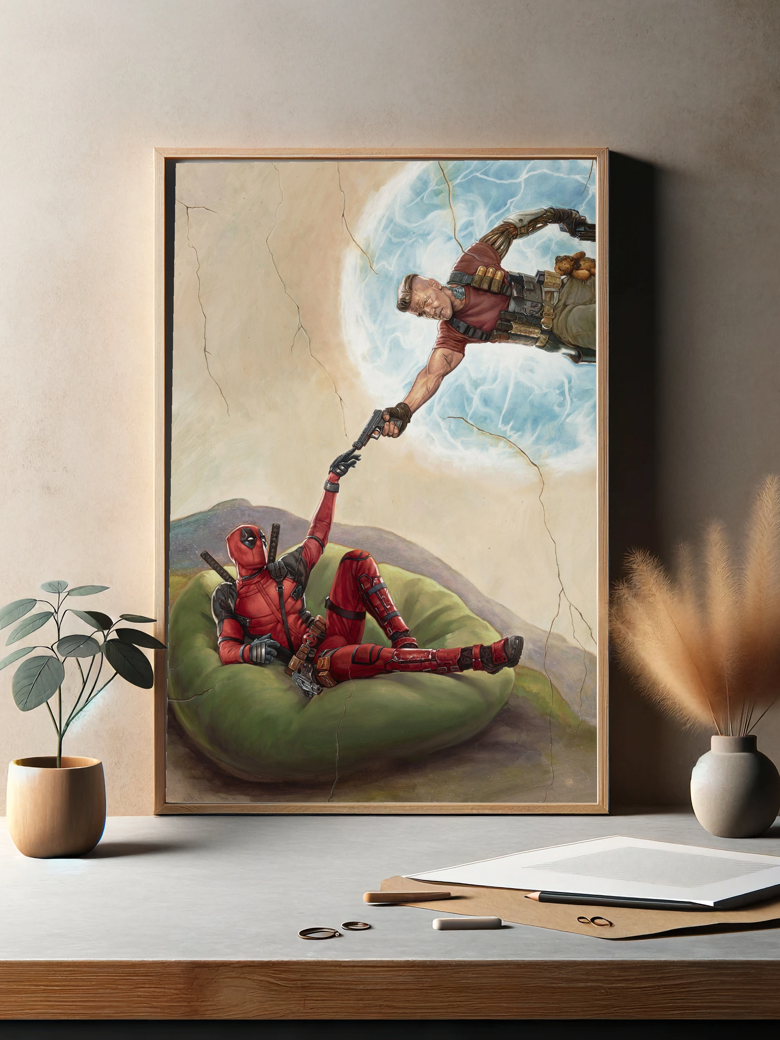Изображение показывает героев комиксов Marvel — Дэдпула и Кейбла. Дэдпул в красном костюме лежит на зеленом кресле-мешке, протягивая руку к Кейблу, который тянется через разлом в стене. Картина выполнена в реалистичном стиле с акцентом на детали, отражая динамику и напряжённость сцены. Идеально подходит в качестве интерьерного декоративного искусства для любителей современного искусства и супергеройских сюжетов.