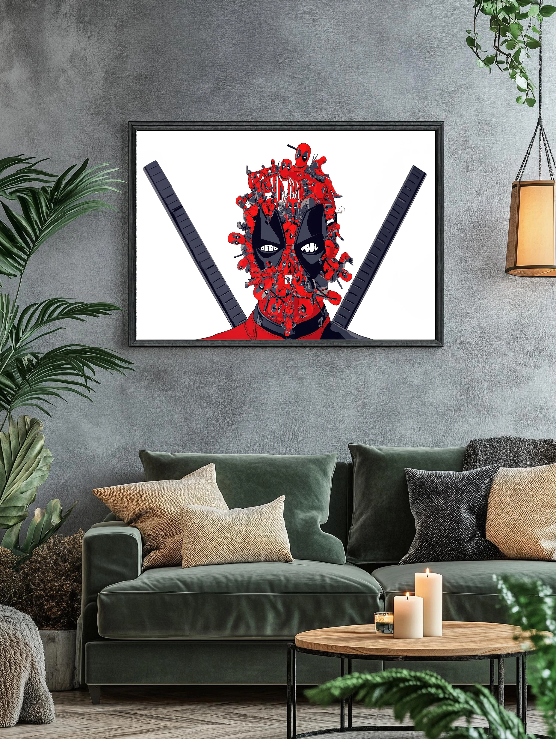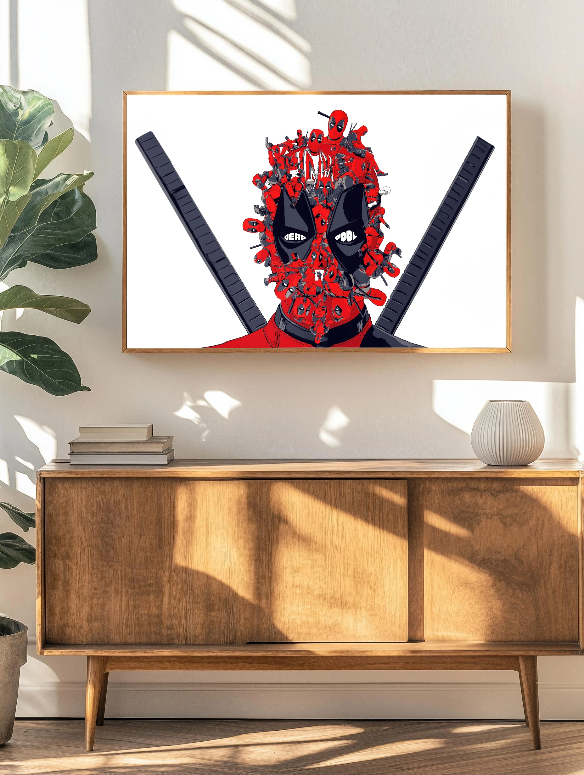 Декоративный плакат с множеством изображений персонажа Deadpool в ярких красных, чёрных и серых оттенках на белом фоне. Иллюстрация выполнена в комикс-стиле, подходит как современное искусство для стен в гостиной или офисе. Стильный и динамичный декоративный плакат с принтом для интерьера.
