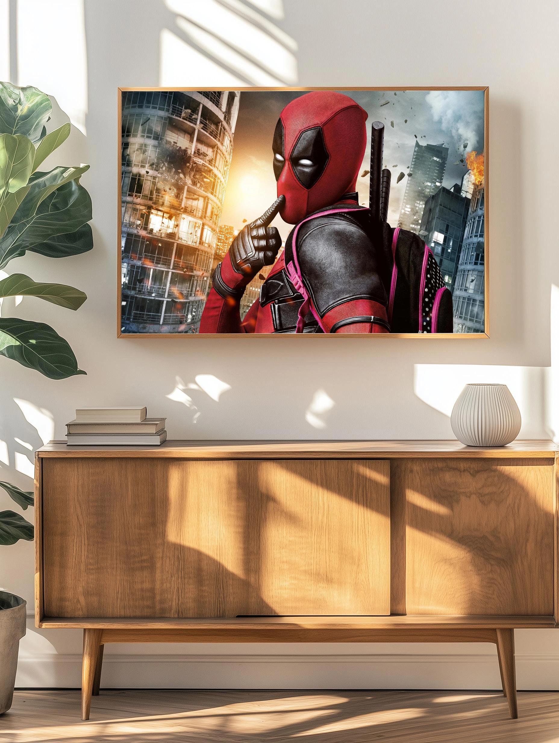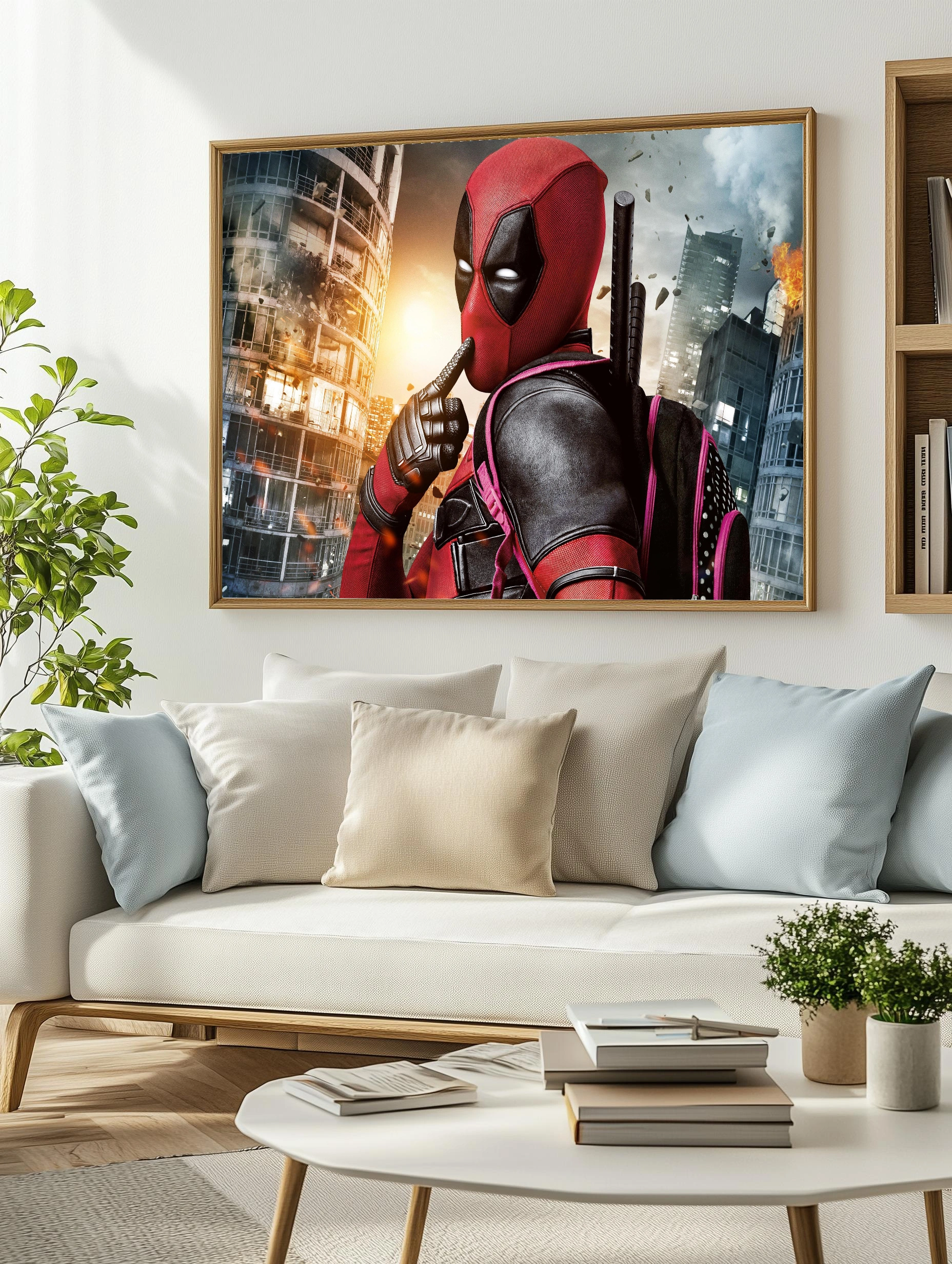 Данный интерьерный постер с изображением известного персонажа Deadpool представляет собой эффектное сочетание динамики и драматизма разрушенного города на фоне заката. Яркие красные и чёрные тона костюма героя контрастируют с холодными оттенками серого и жёлтого в архитектуре и огне. Уникальный дизайн привнесёт в интерьер современное искусство для стен, создавая стильный декор и атмосферу действия.