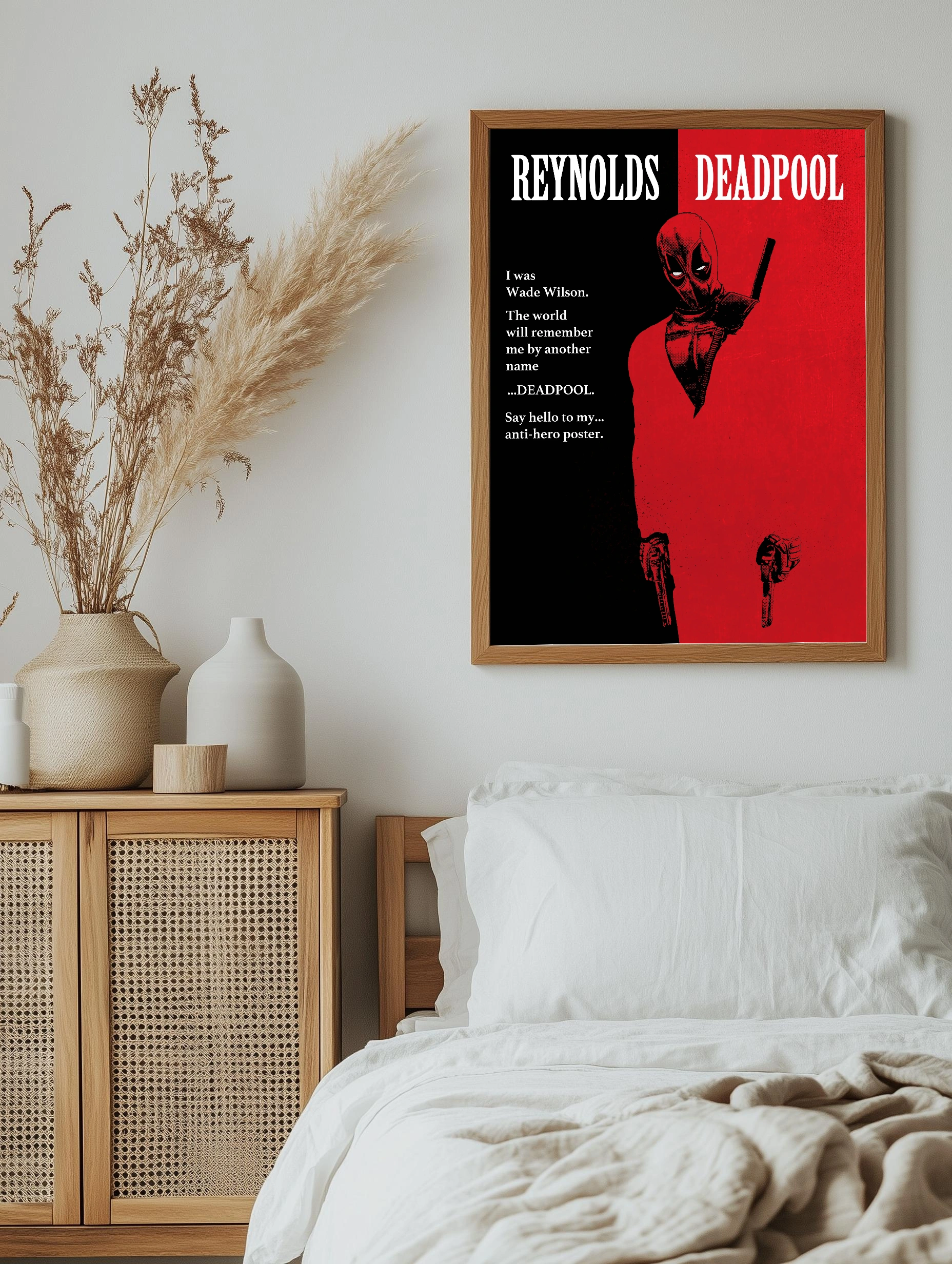 Этот интерьерный постер на стену посвящён персонажу Deadpool (Дэдпул) — Уэйду Уилсону из одноимённого комикса и фильма. Постер выполнен в современном стиле с использованием чёрного и красного цветов, показывая силуэт и маску героя. Текст добавляет уникальный художественный акцент, создавая выразительный и стильный декоративный плакат для гостиной или офиса.