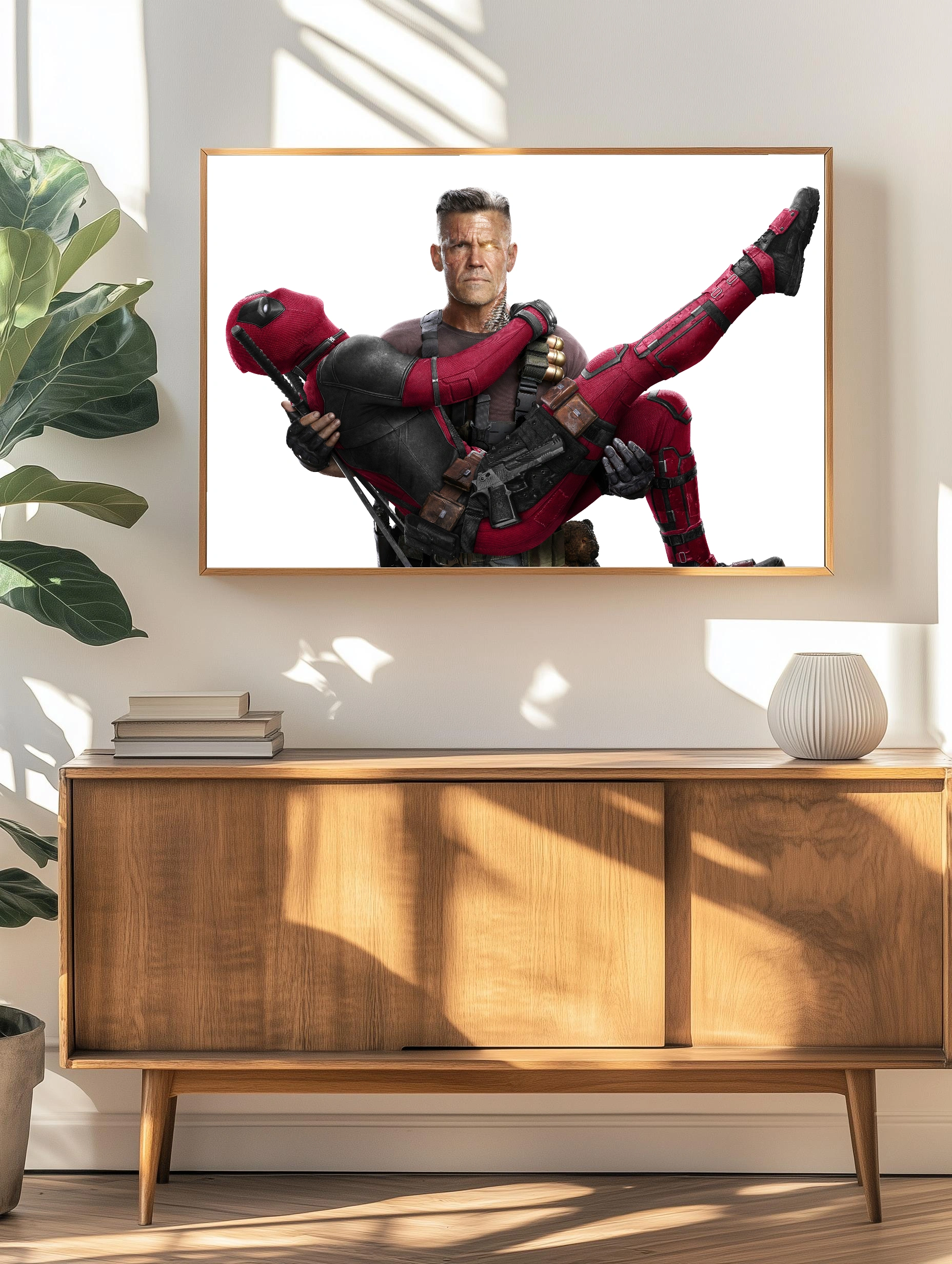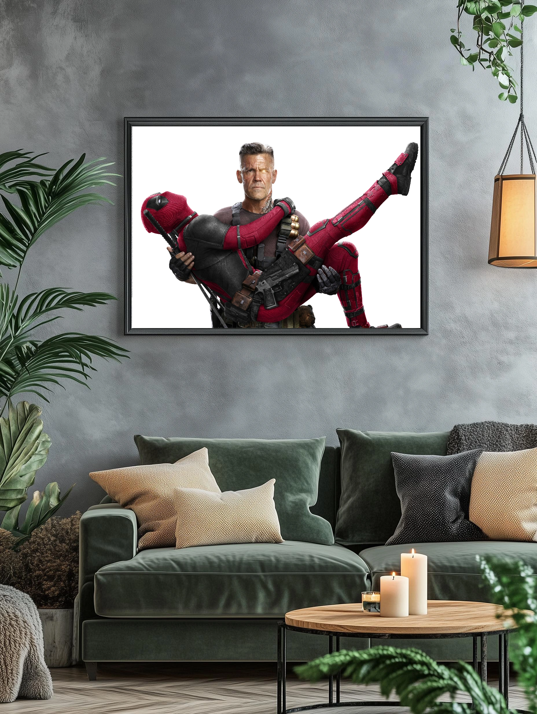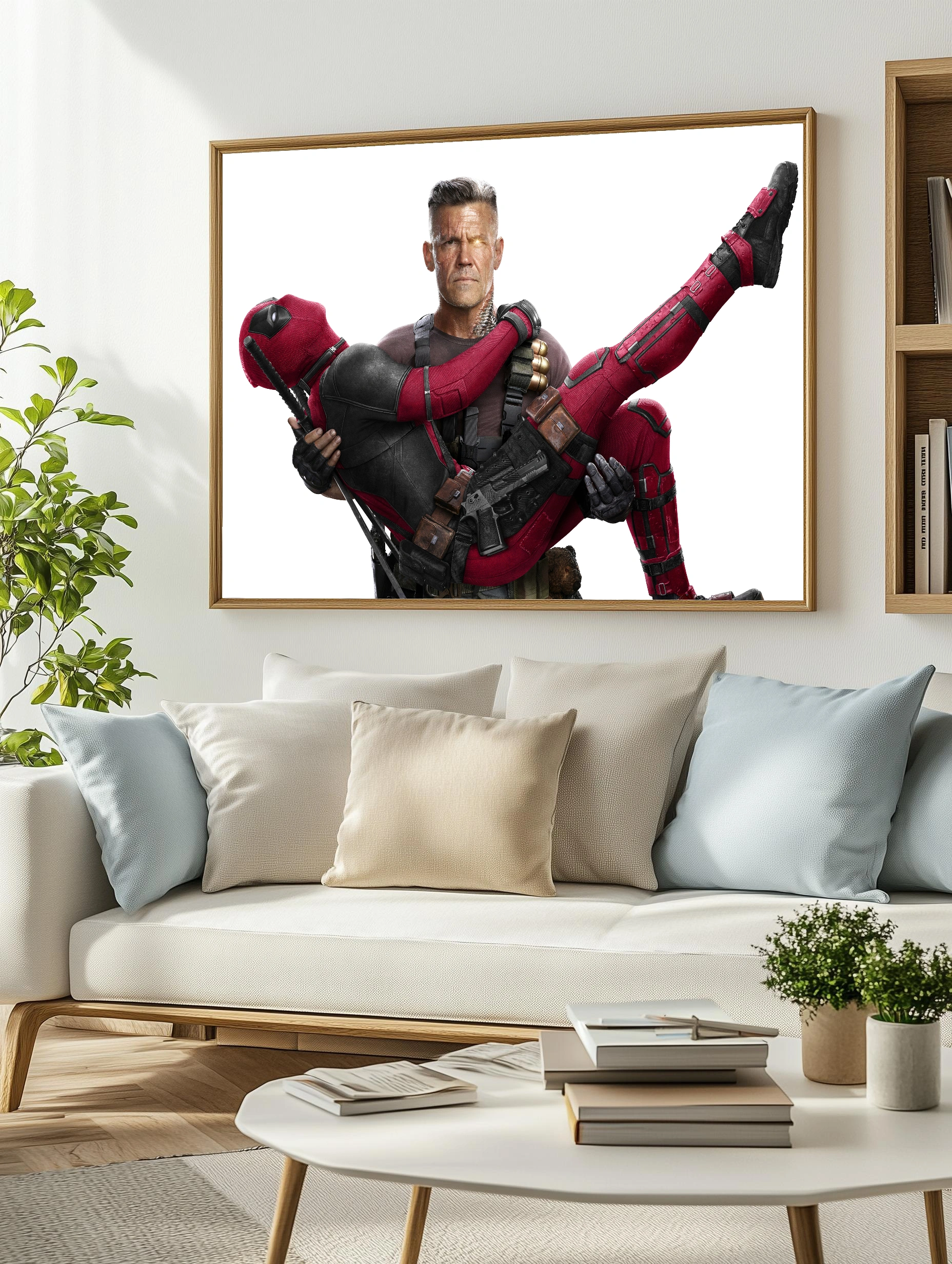 Изображение показывает знаменитых персонажей Marvel — Дэдпула, в красно-чёрном костюме, которого в руках держит Кейбл с кибернетическим глазом и военной экипировкой. Светлый фон подчёркивает контраст героев, создавая стильный художественный интерьерный постер с современным искусством для стен.
