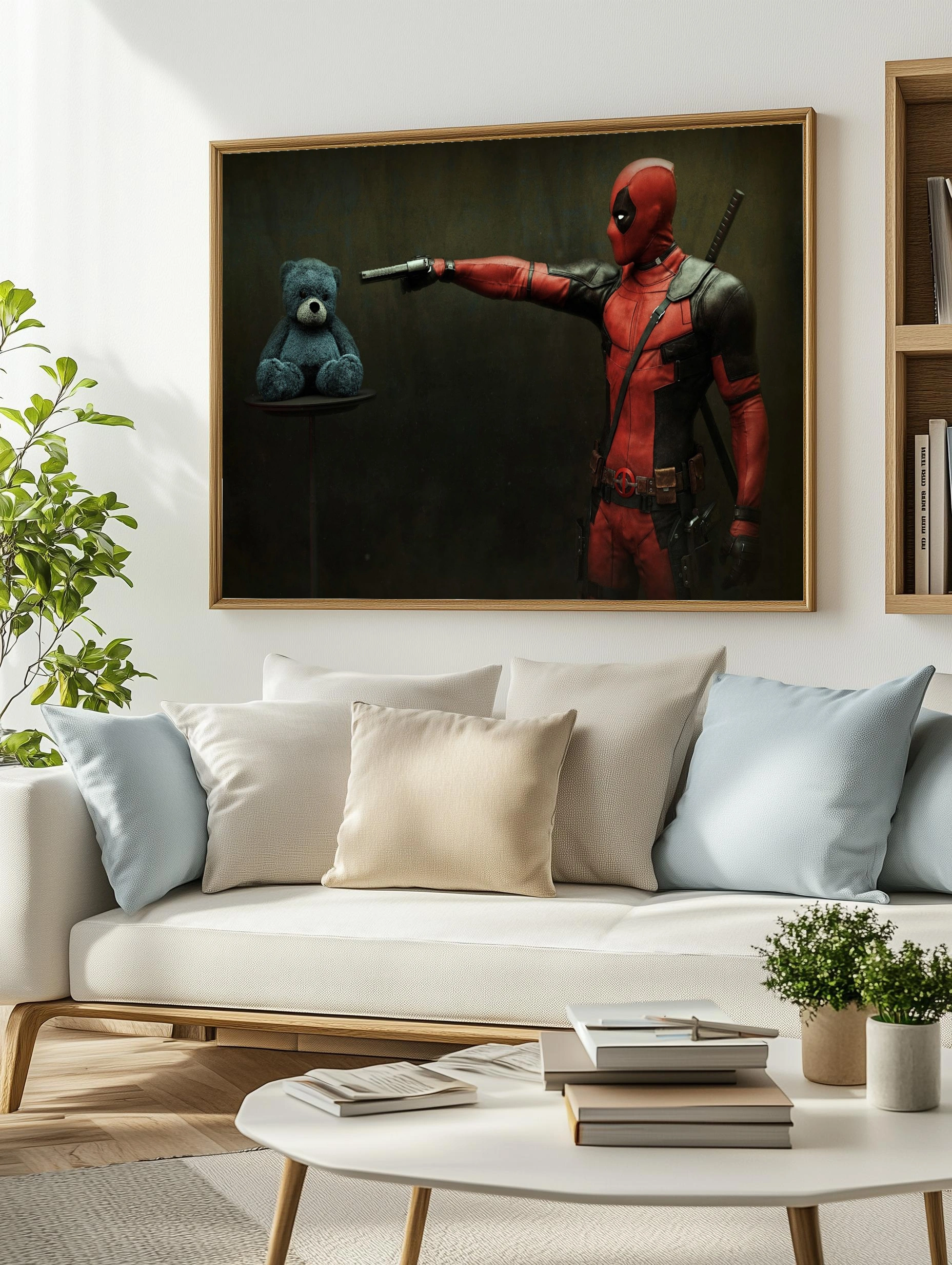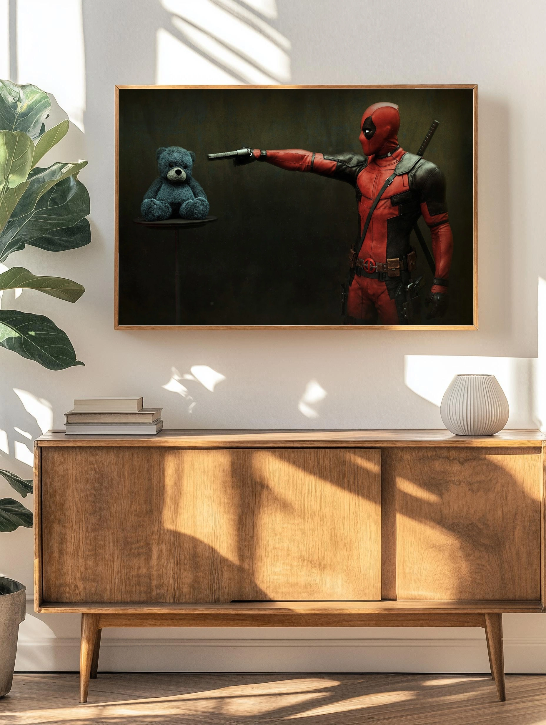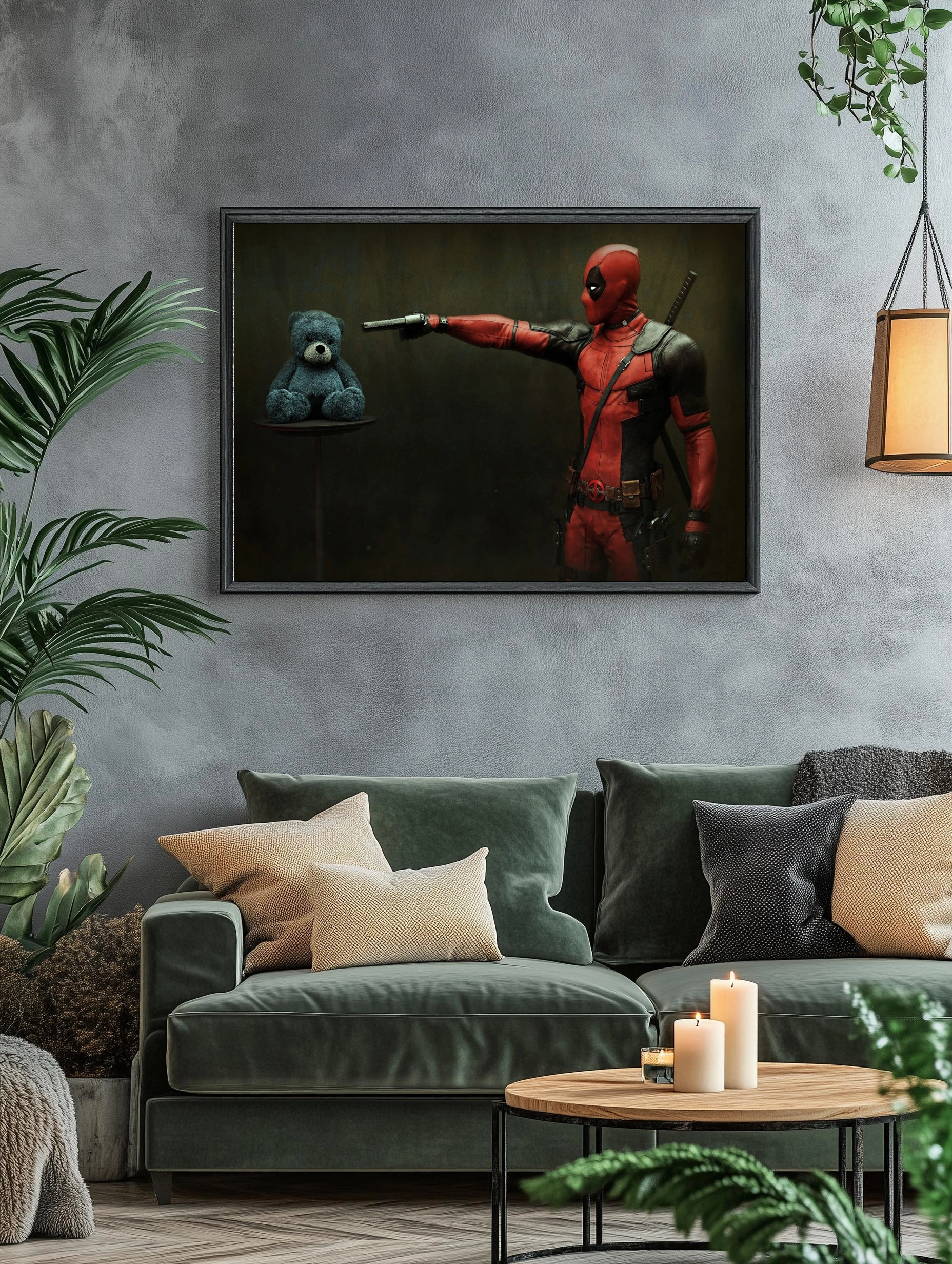 На изображении представлен известный персонаж комиксов и фильмов — Дэдпул, в ярком красно-чёрном костюме с оружием, направленным в сторону синего плюшевого мишки на столике. Контрастные цвета и мрачный фон создают выразительный художественный плакат для стен. Этот интерьерный постер отлично впишется в современный декор, добавит изюминку в гостиную, офис или спальню, являясь стильным настенным декором с элементами современного искусства.