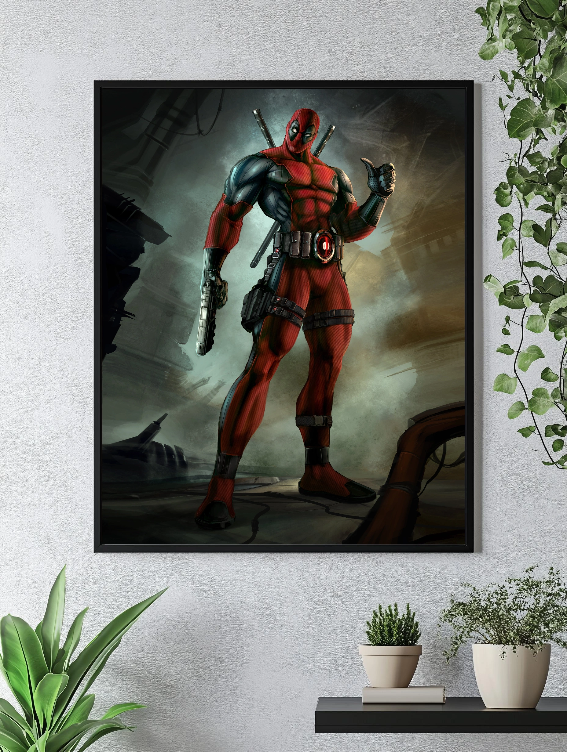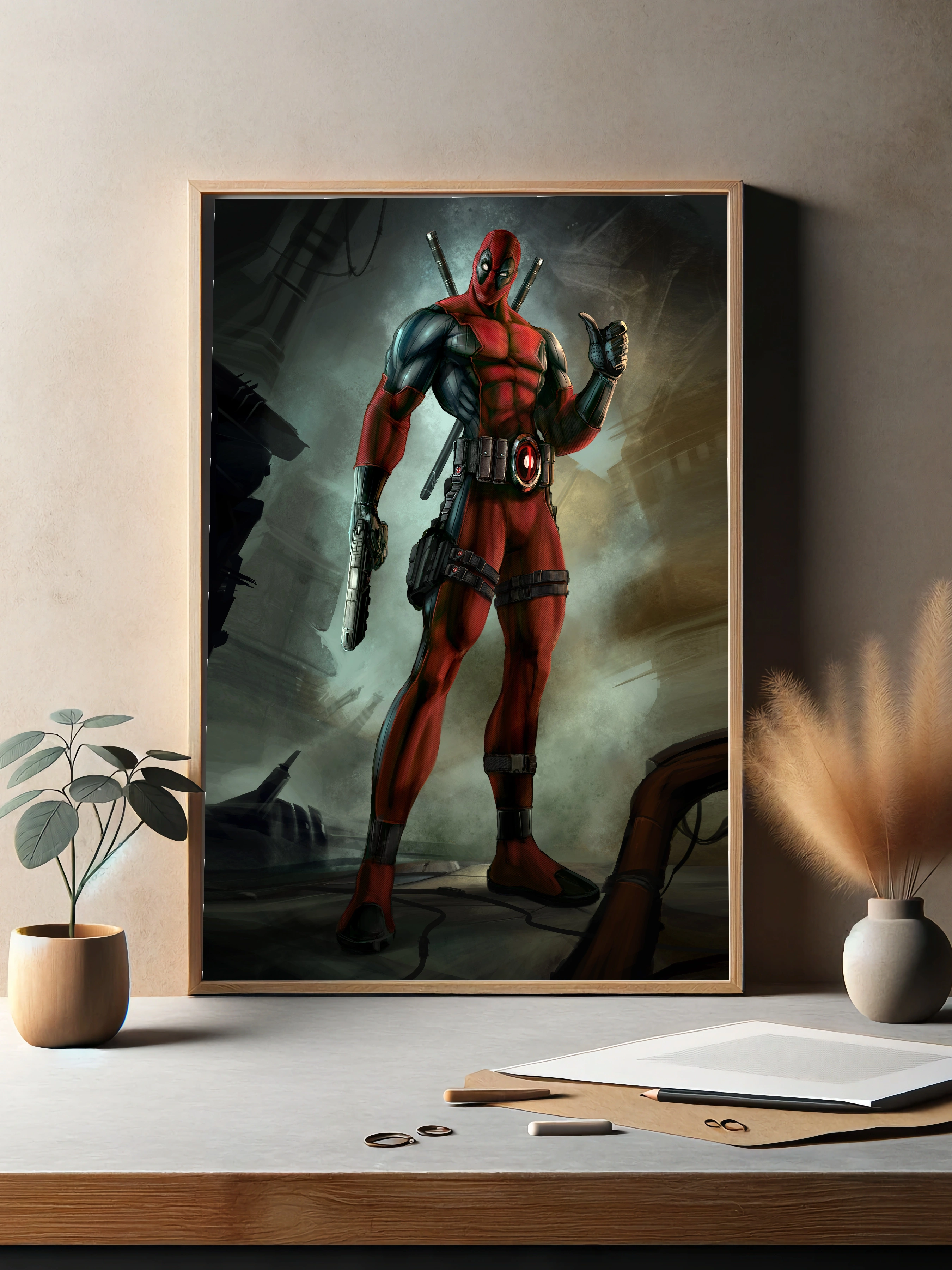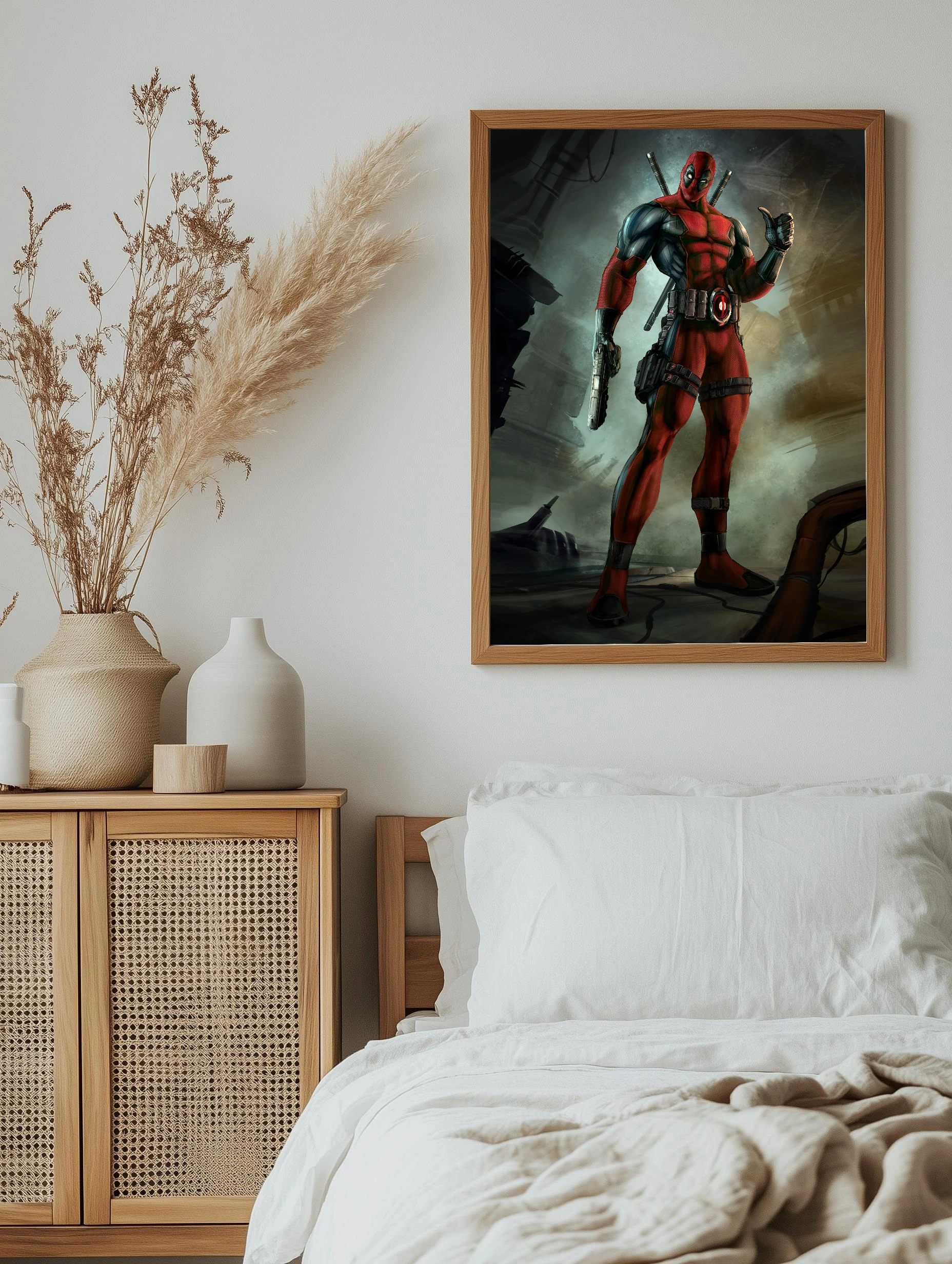Это изображение показывает известного персонажа Дэдпула в динамичной позе с оружием в руках, выполненного в реалистичной и детализированной манере. Темный фон с индустриальным оттенком подчеркивает его ярко-красный костюм и создает атмосферу напряжения и действия. Декоративный плакат отлично подойдет для современного интерьера, превращая пространство в стильное и выразительное место.