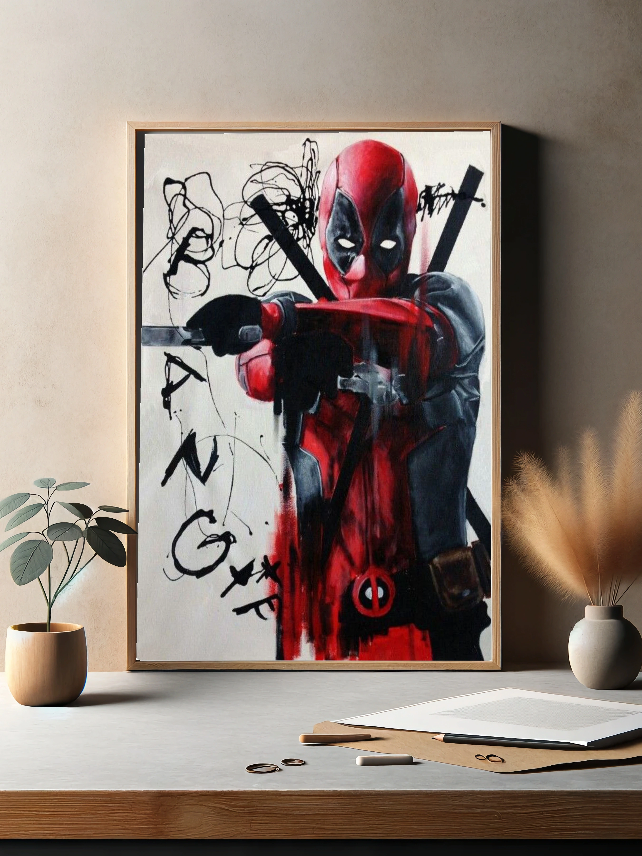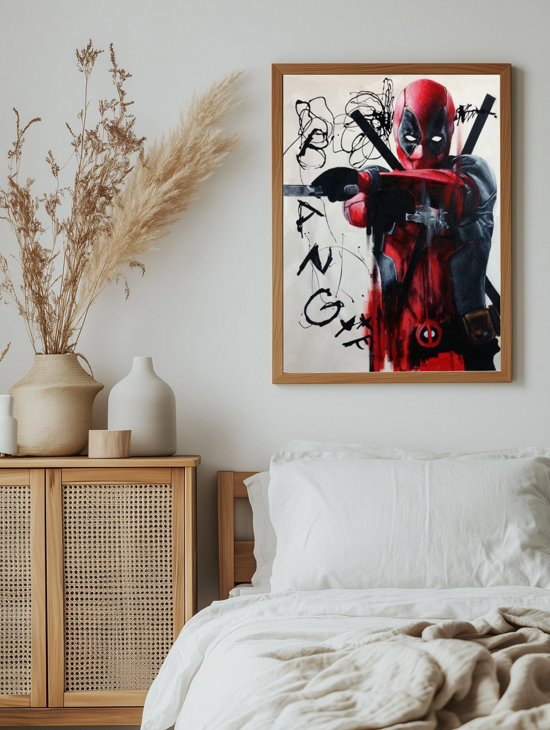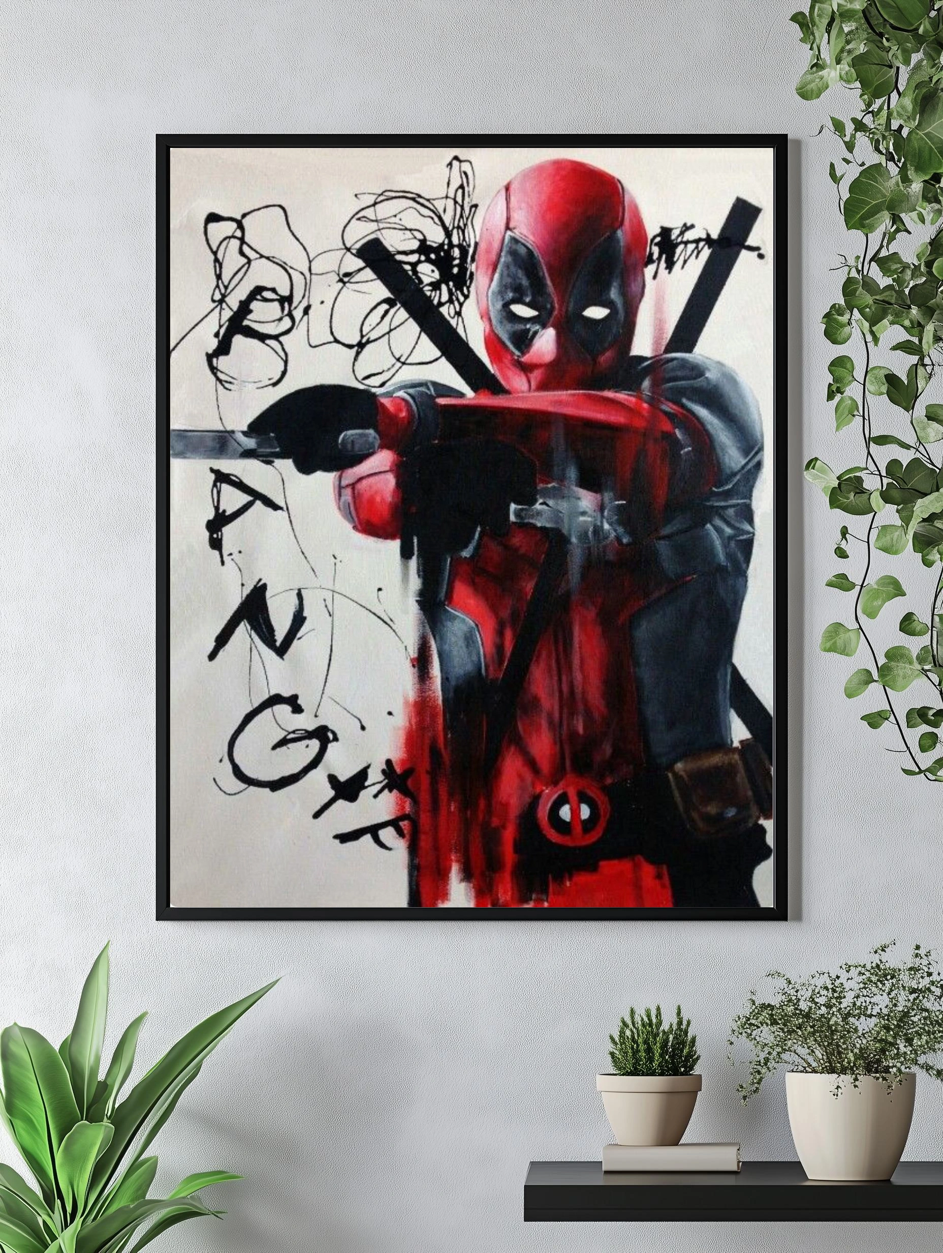 На изображении представлен известный персонаж Дэдпул в красно-черном костюме, выполненный в стиле динамичной живописи с акцентом на вооружение и силуэт героя. Фон светлый с черными граффити-надписями, создающими ощущение движения и энергии. Картина подойдет для современного интерьера, добавляя яркости и уникальности пространству.