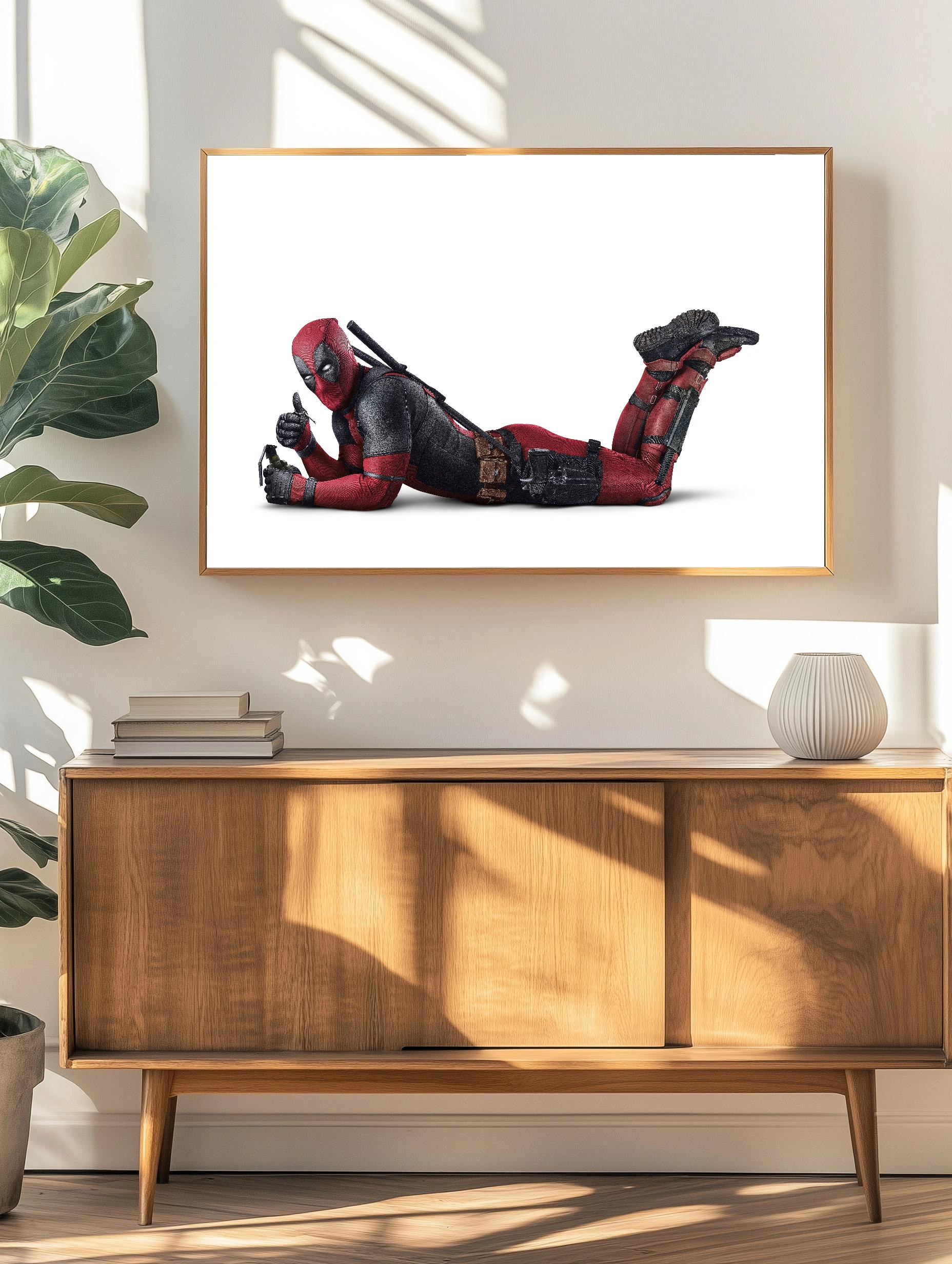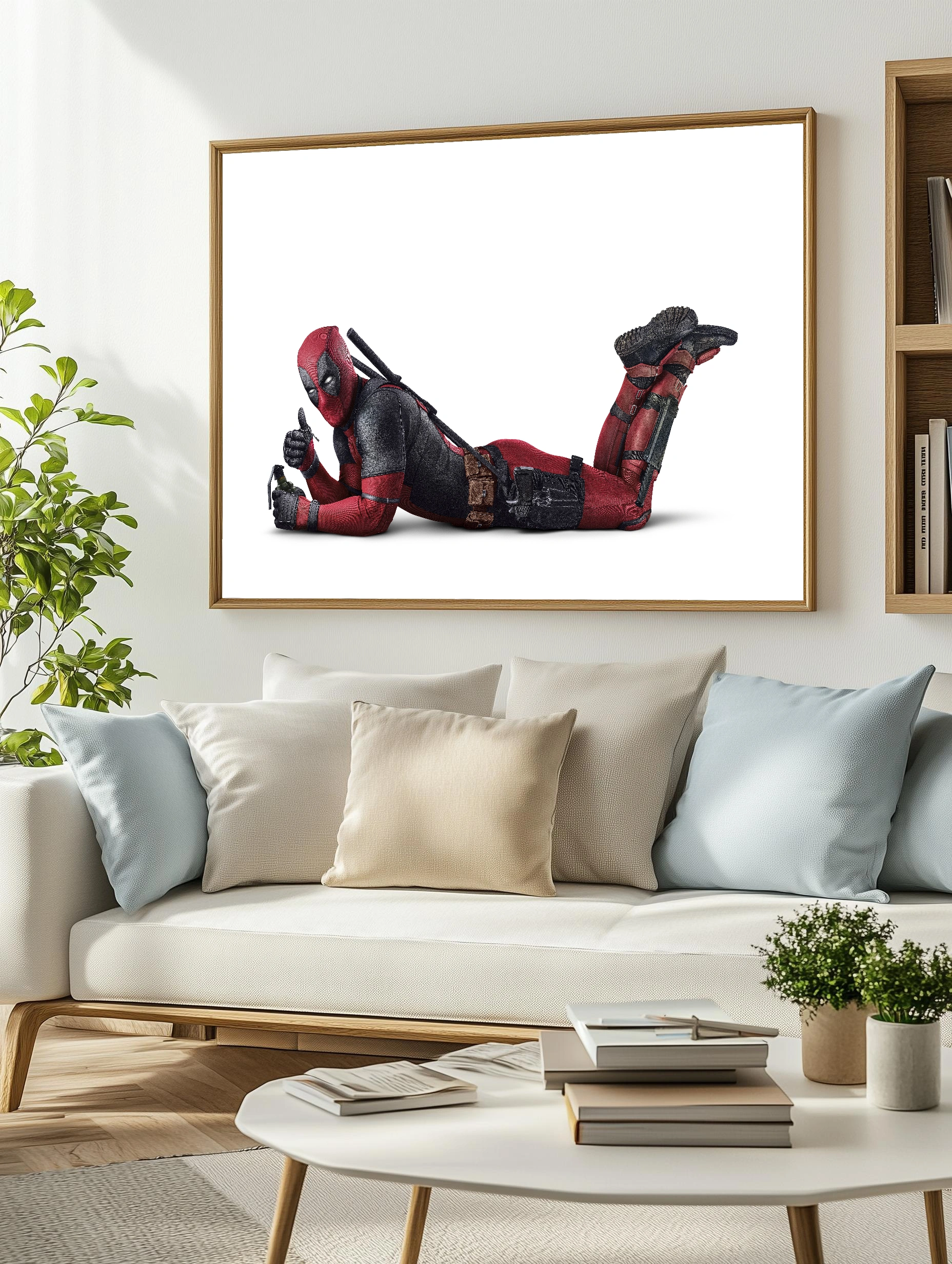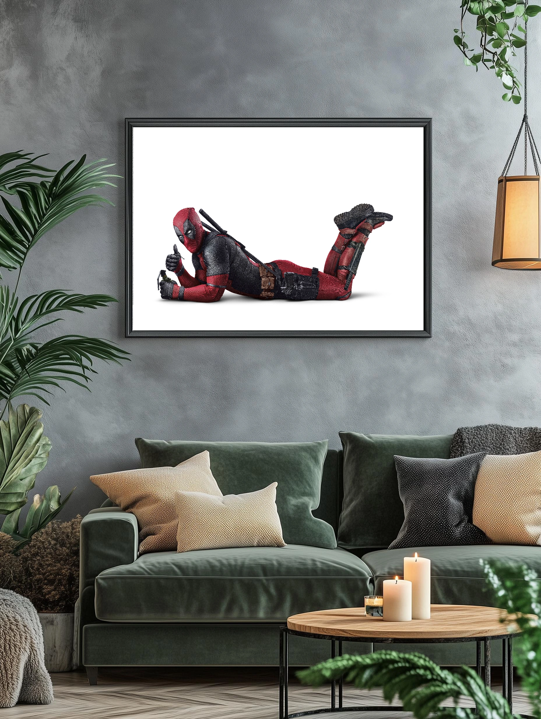 На изображении представлен известный персонаж комиксов и фильмов — Дэдпул в характерной красно-чёрной экипировке. Герой лежит в расслабленной позе, показывая большой палец и удерживая гранату. Белый фон подчёркивает яркость красных и чёрных тонов, делая изображение насыщенным и стильным. Этот художественный плакат станет уникальным элементом декора в гостиной, спальне или офисе, добавляя современное искусство для стен и оригинальный настенный декор.