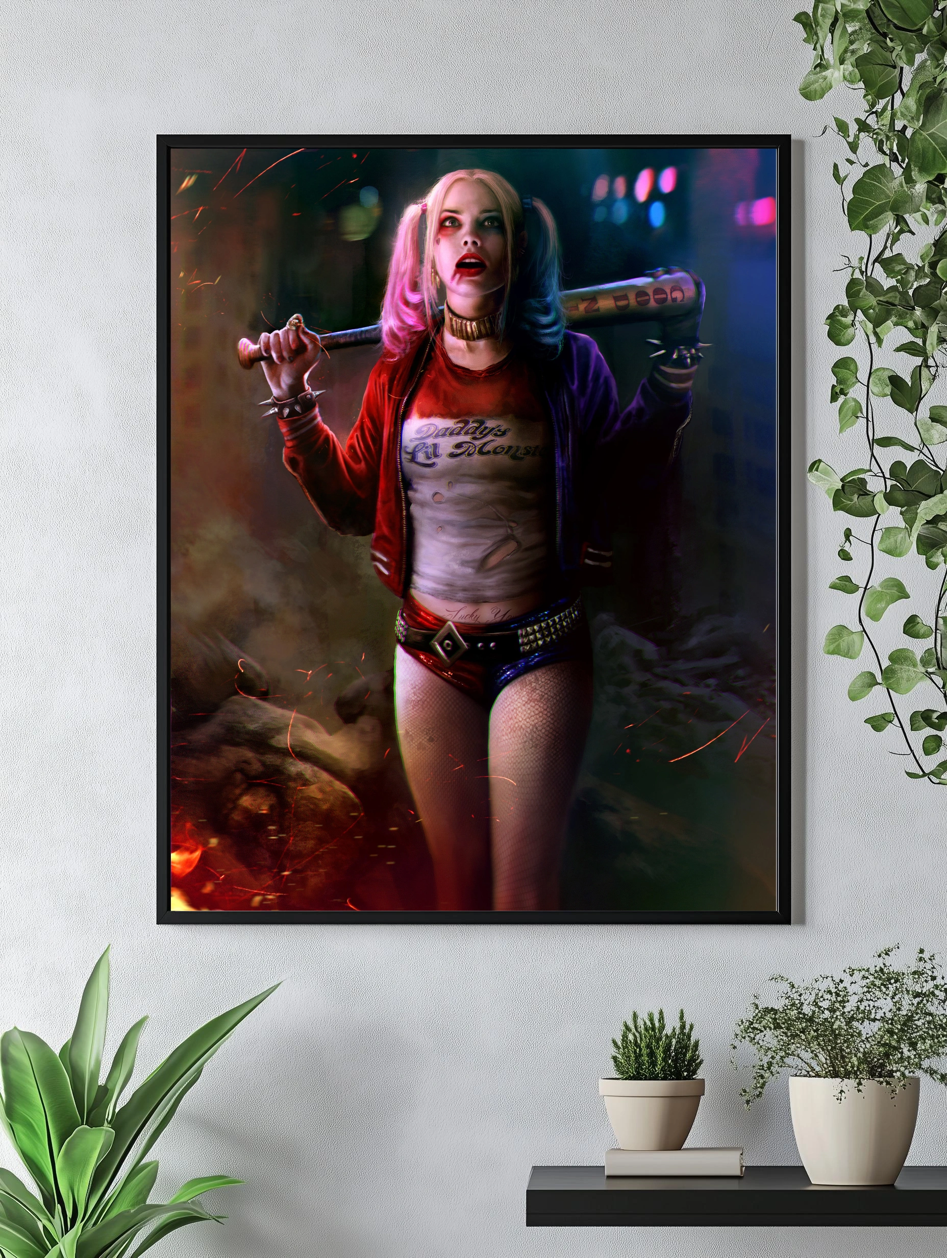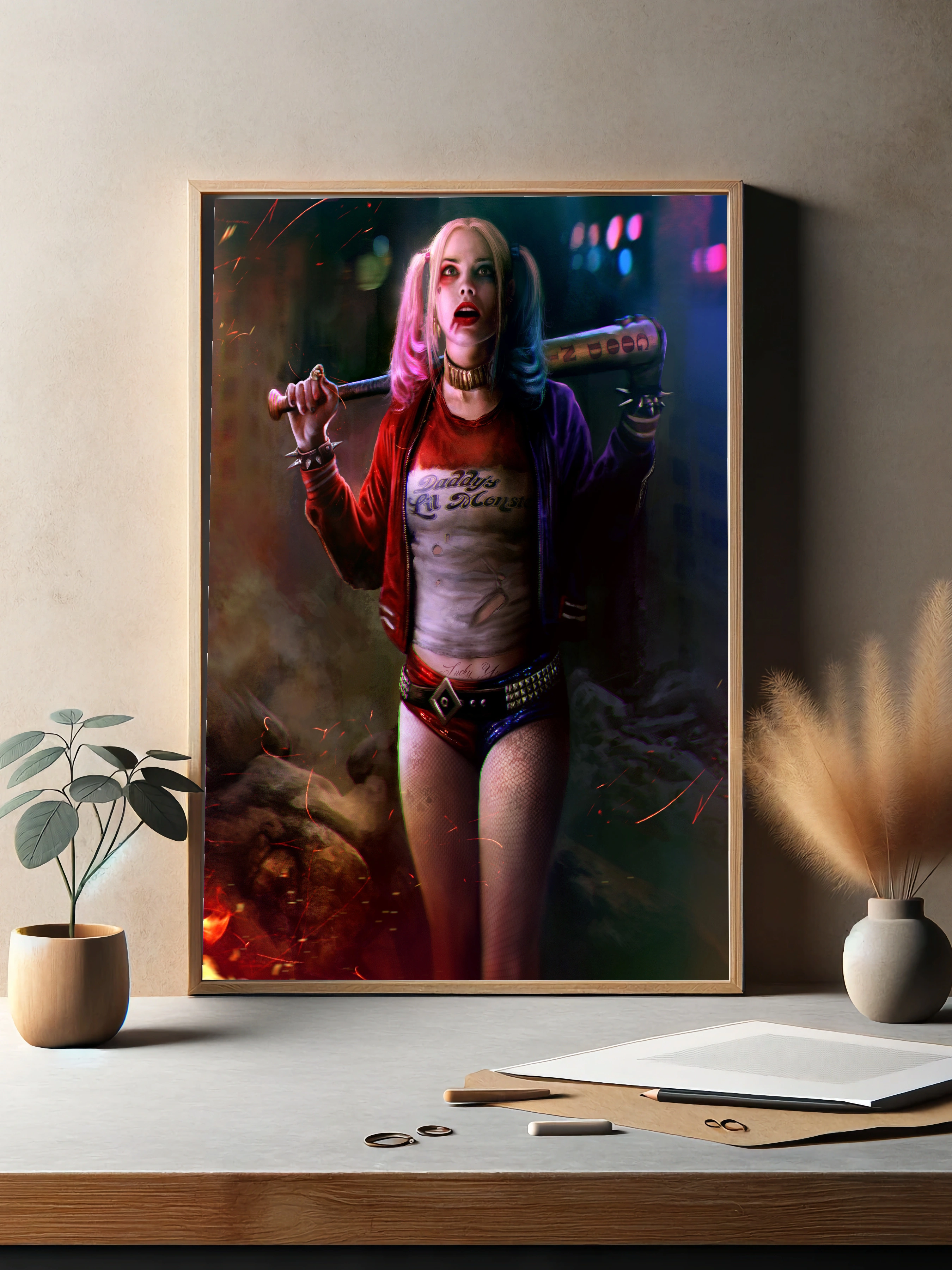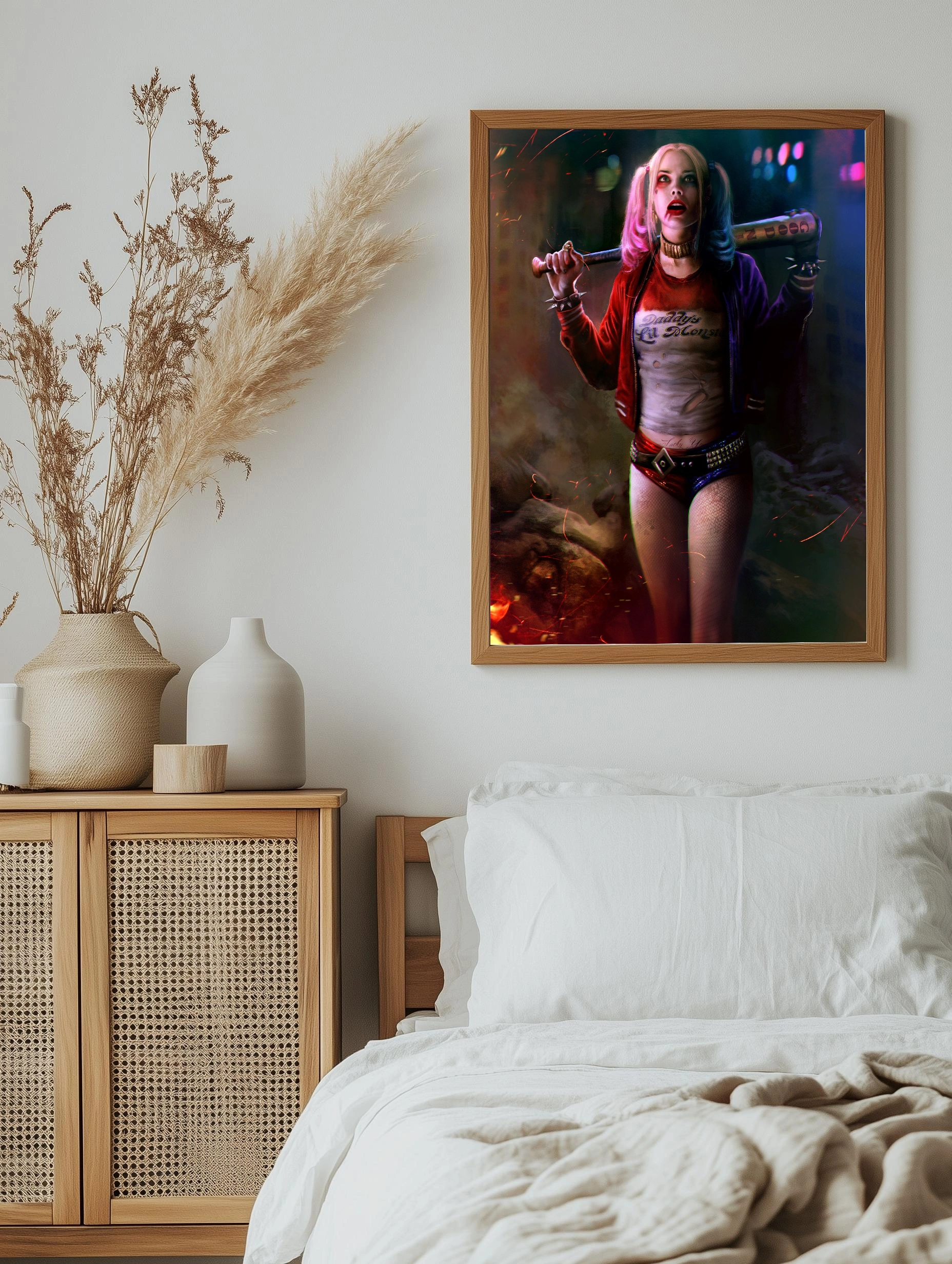 На изображении изображена известная персонаж Харли Квинн с бейсбольной битой за плечом в динамичном и мрачном городском окружении. Стиль работы сочетает реализм и цифровую живопись с яркими акцентами красного, фиолетового и белого цветов. Декоративный плакат создаст смелый акцент в интерьере гостиной или спальни, идеально подходит для фанатов комиксов и современного искусства для стен.