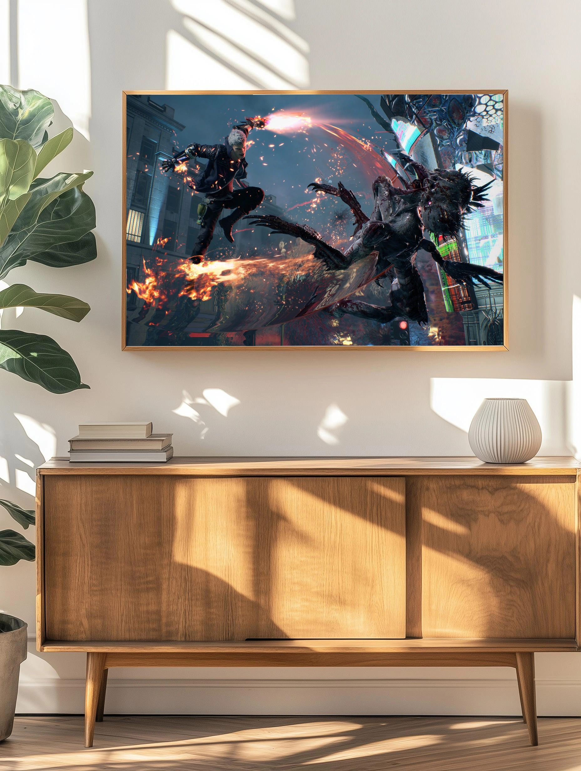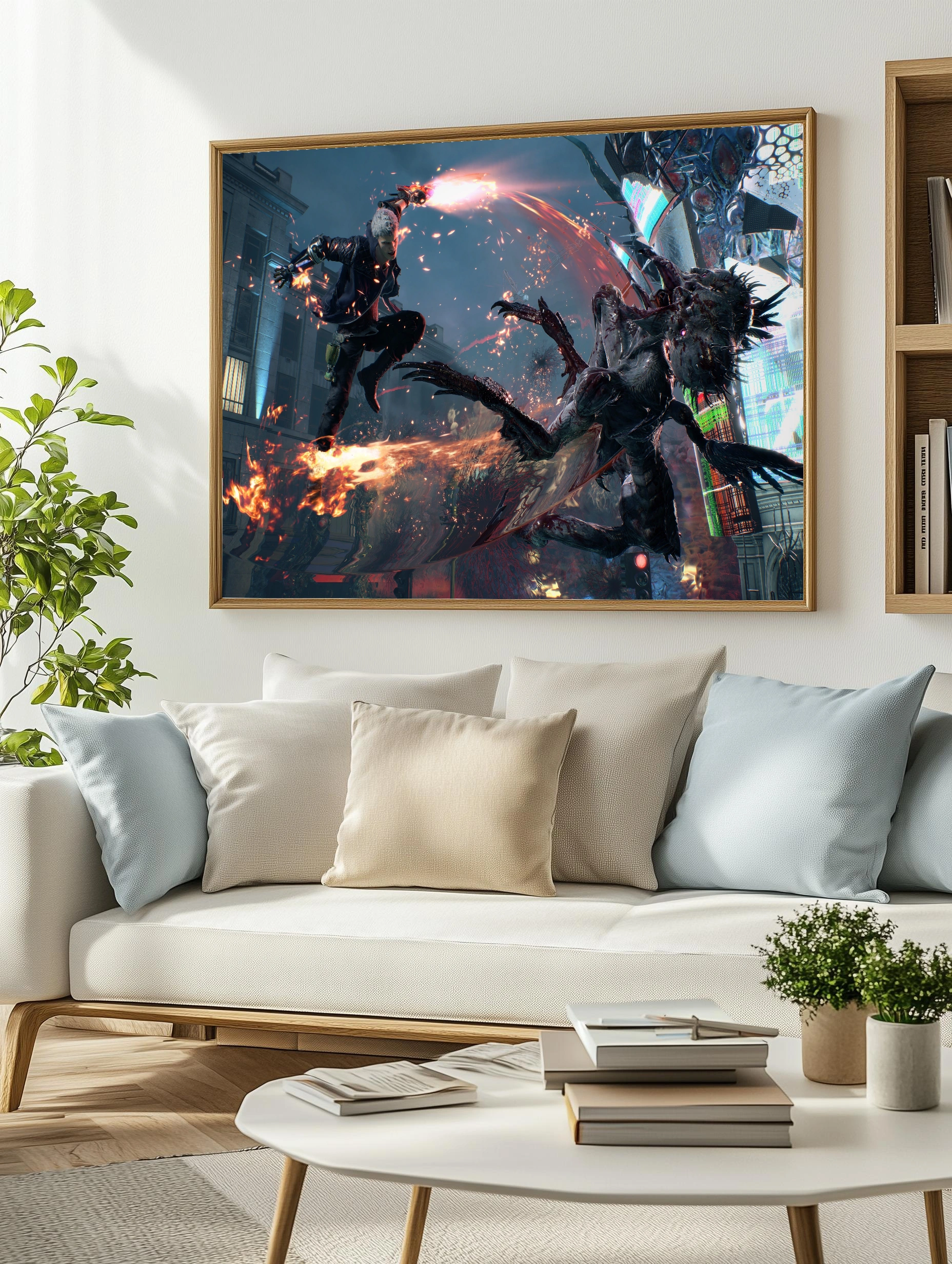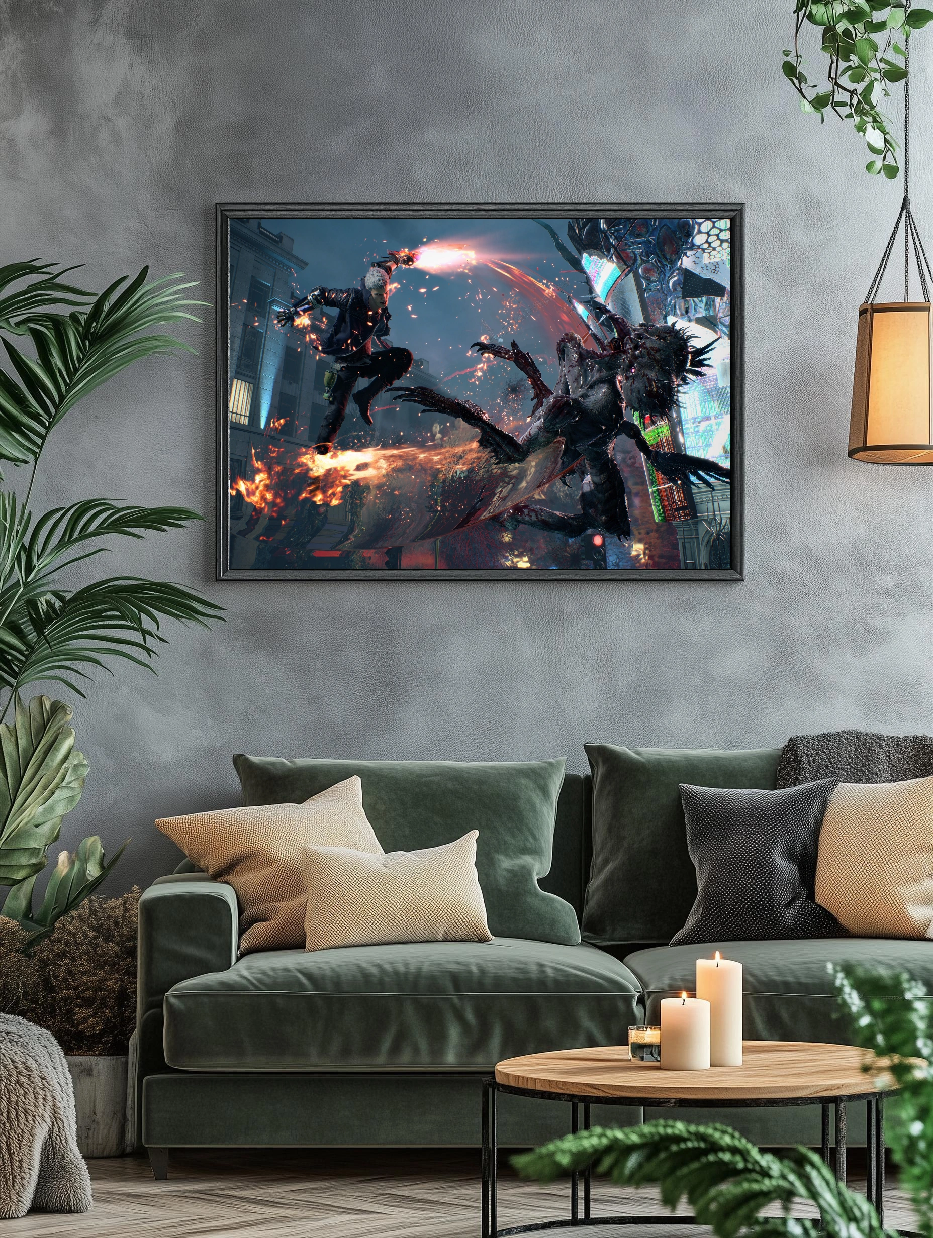 Изображение представляет героическую сцену из игры DMC Devil May Cry, где главный персонаж Данте в динамичном прыжке атакует большого демона в урбанистическом окружении с неоновыми огнями. Картина наполнена динамикой и опасной атмосферой, что делает её уникальным интерьерным искусством для стен, ориентированным на фанатов современных видеоигр и экшн-сюжетов.