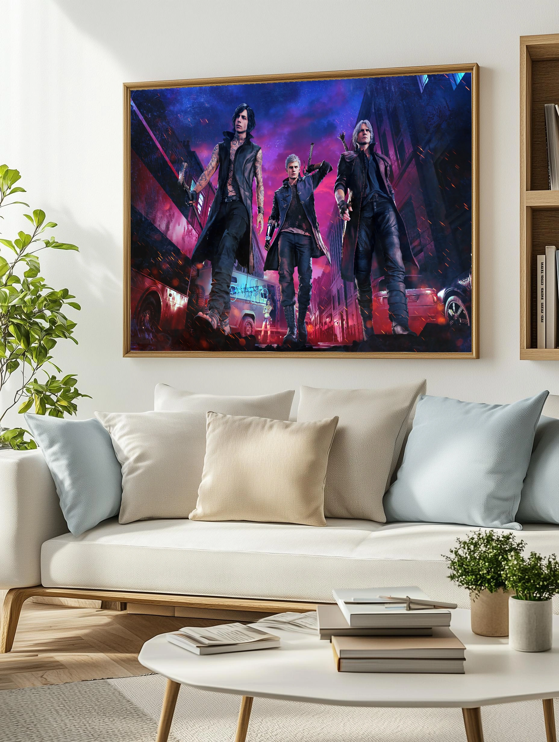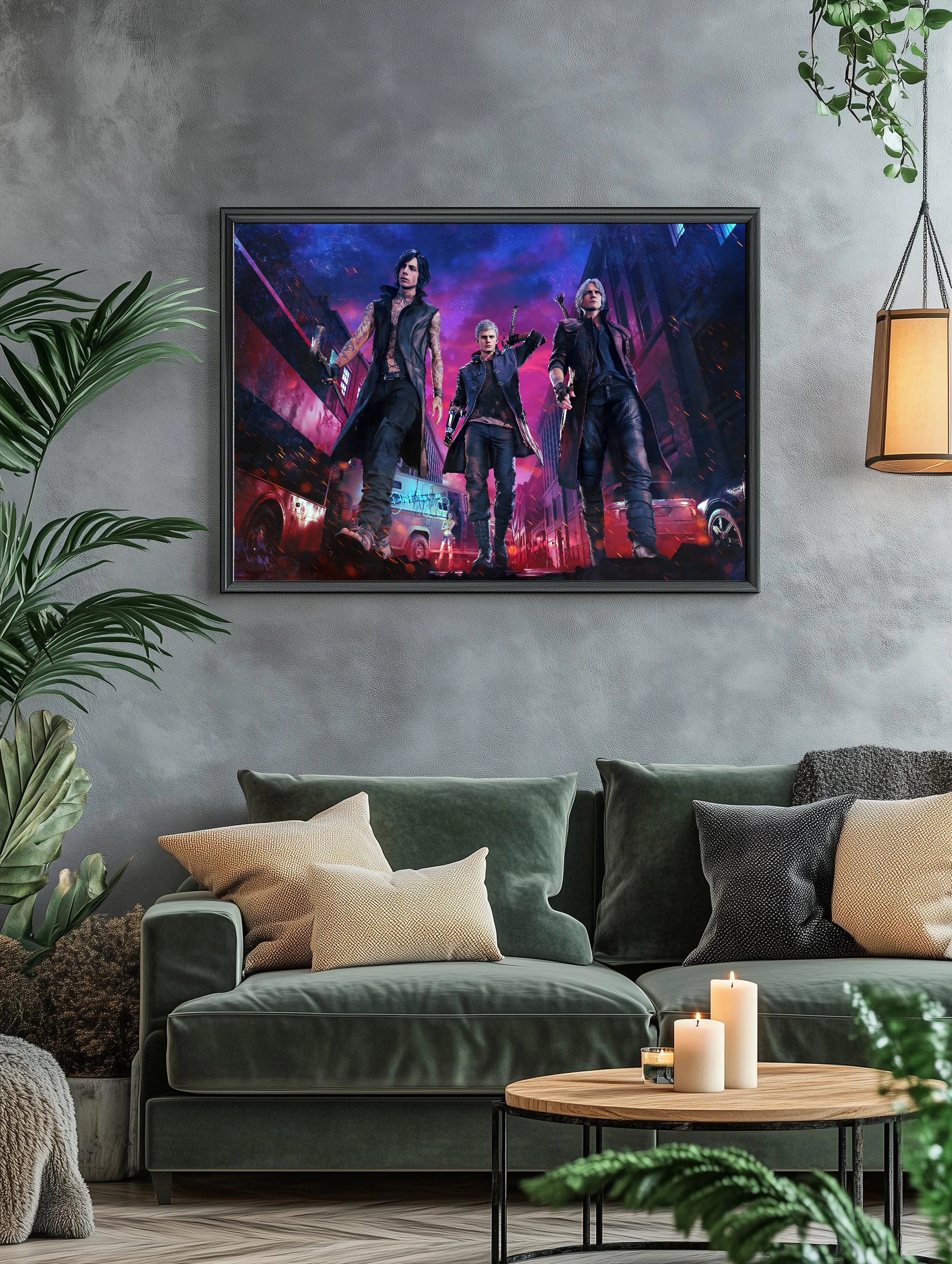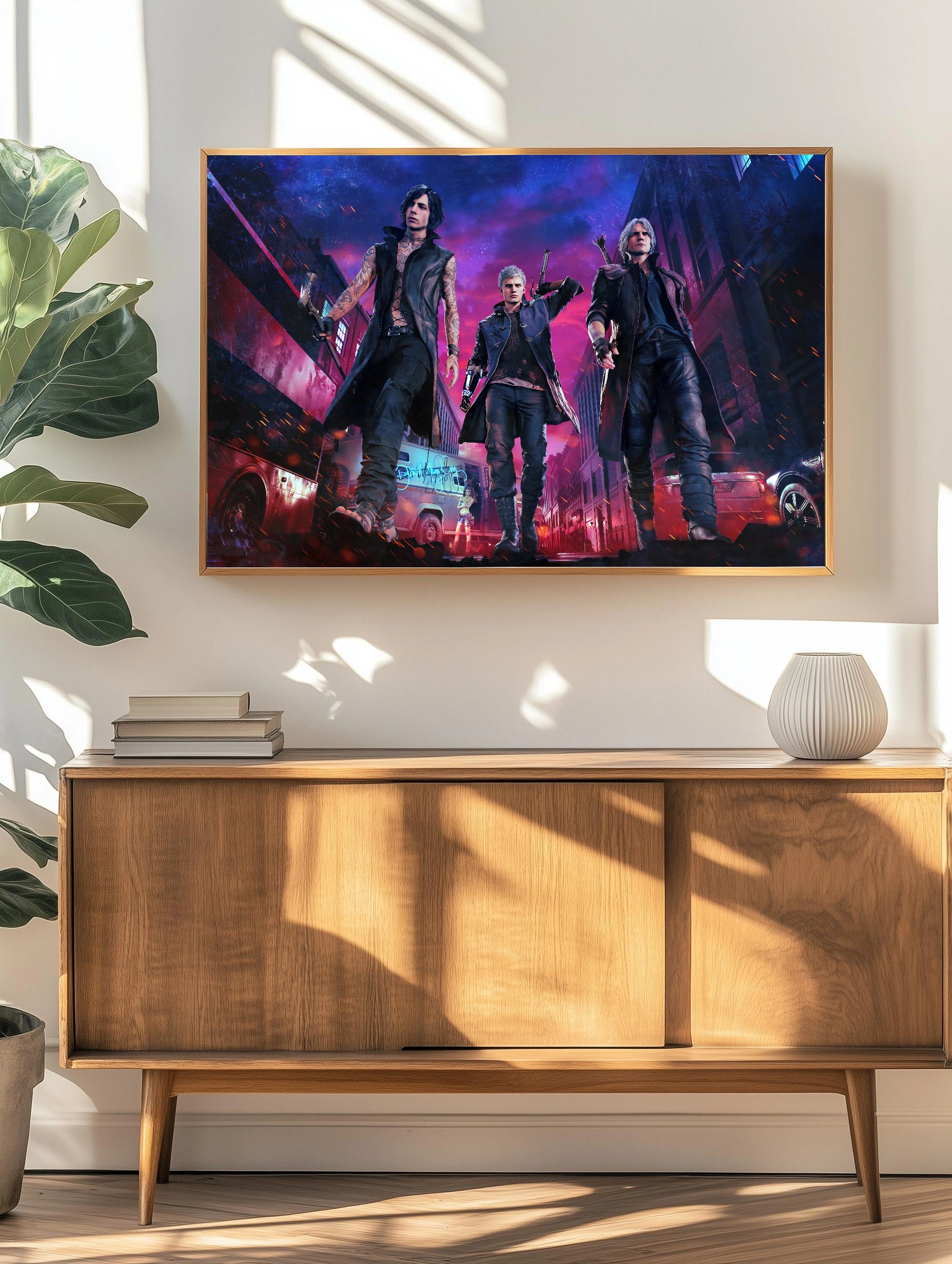 Изображение представляет собой динамичную сцену с тремя главными персонажами из игры Devil May Cry — Данте, Верджилом и Неро. Герои идут по городской улице, окружённой небоскребами, в темных кожаных куртках с оружием. На заднем фоне преобладают насыщенные фиолетовые и розовые цвета неба в сумерках, создавая мрачную и мистическую атмосферу боевика. Этот интерьерный постер идеально впишется в современный дом или офис поклонника игровой тематики и динамичного современного искусства.