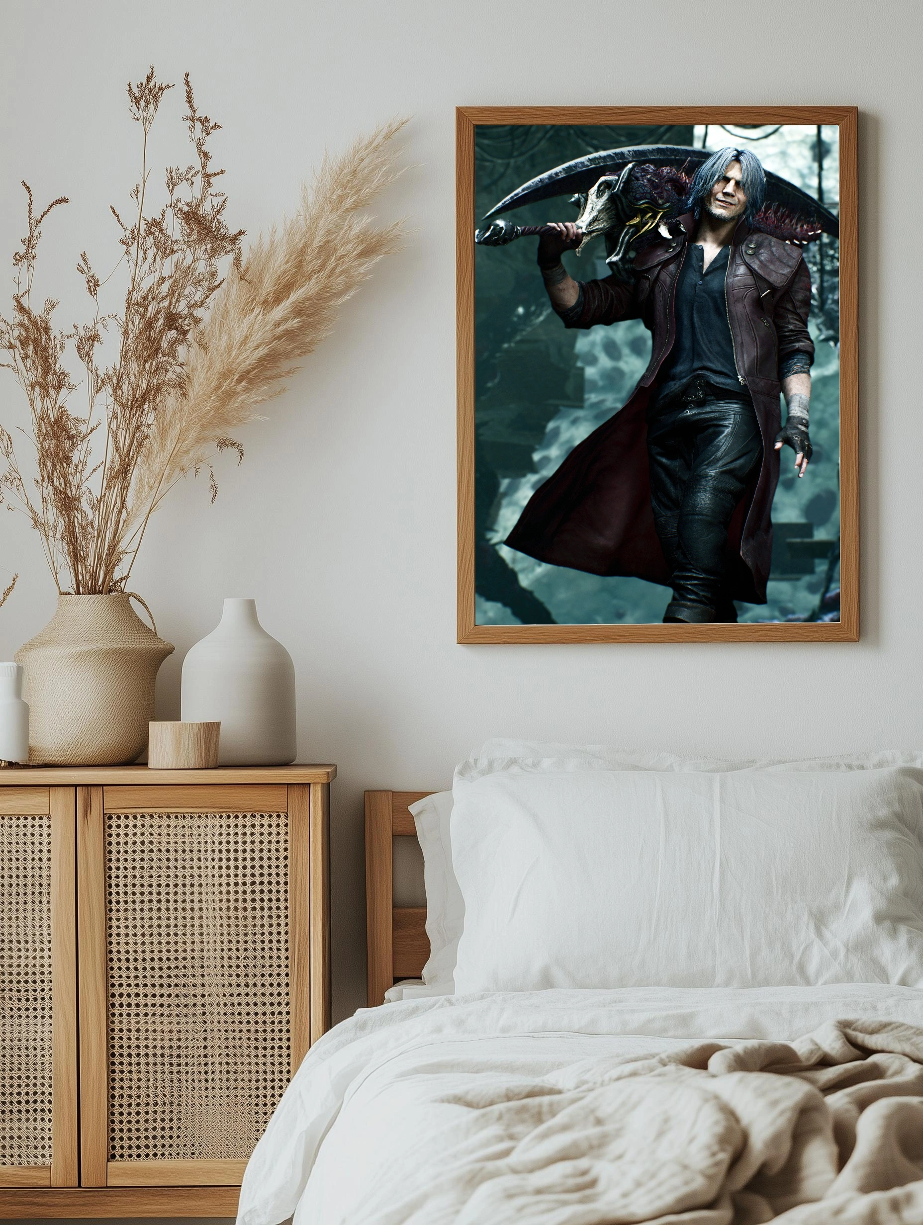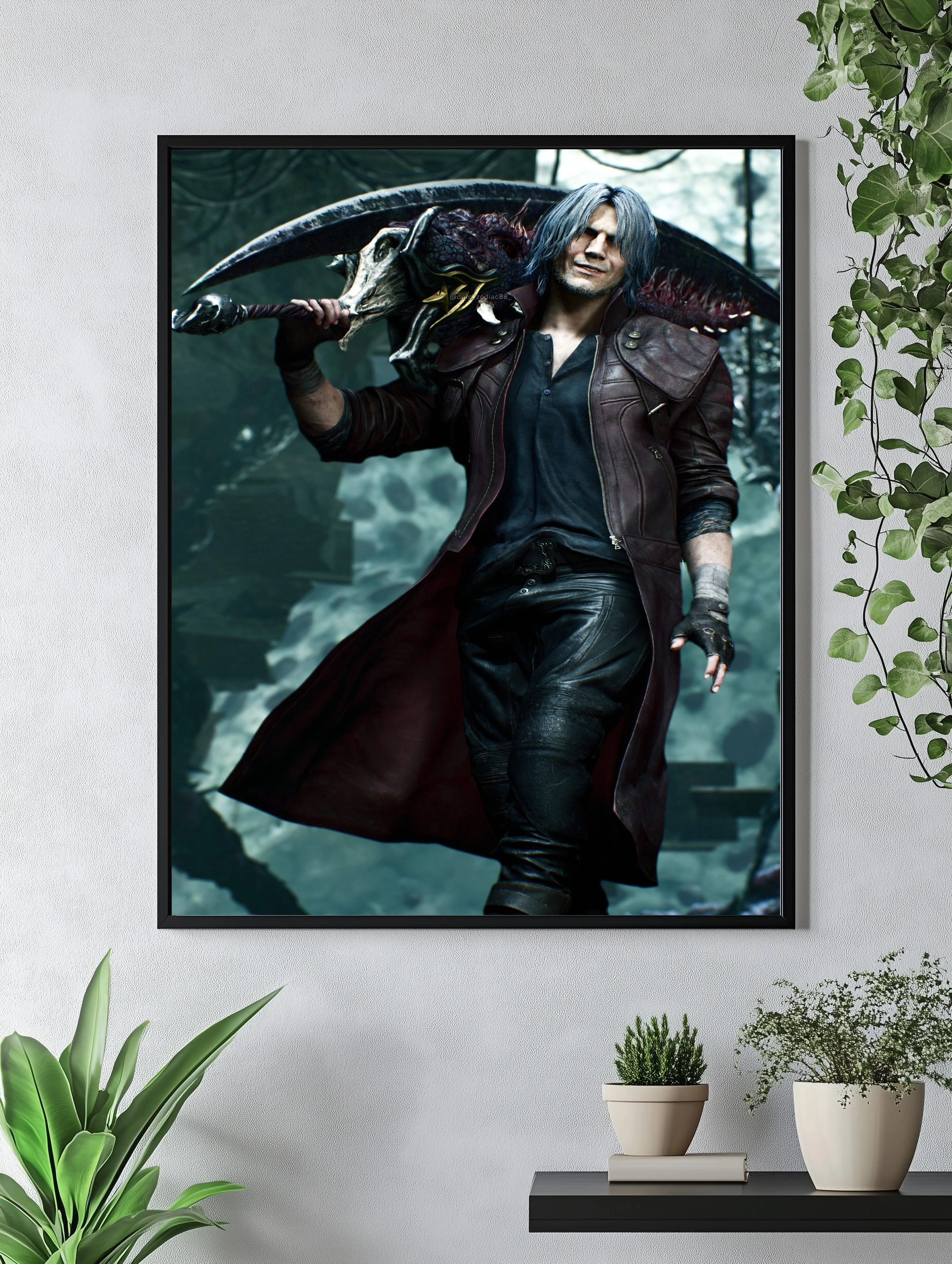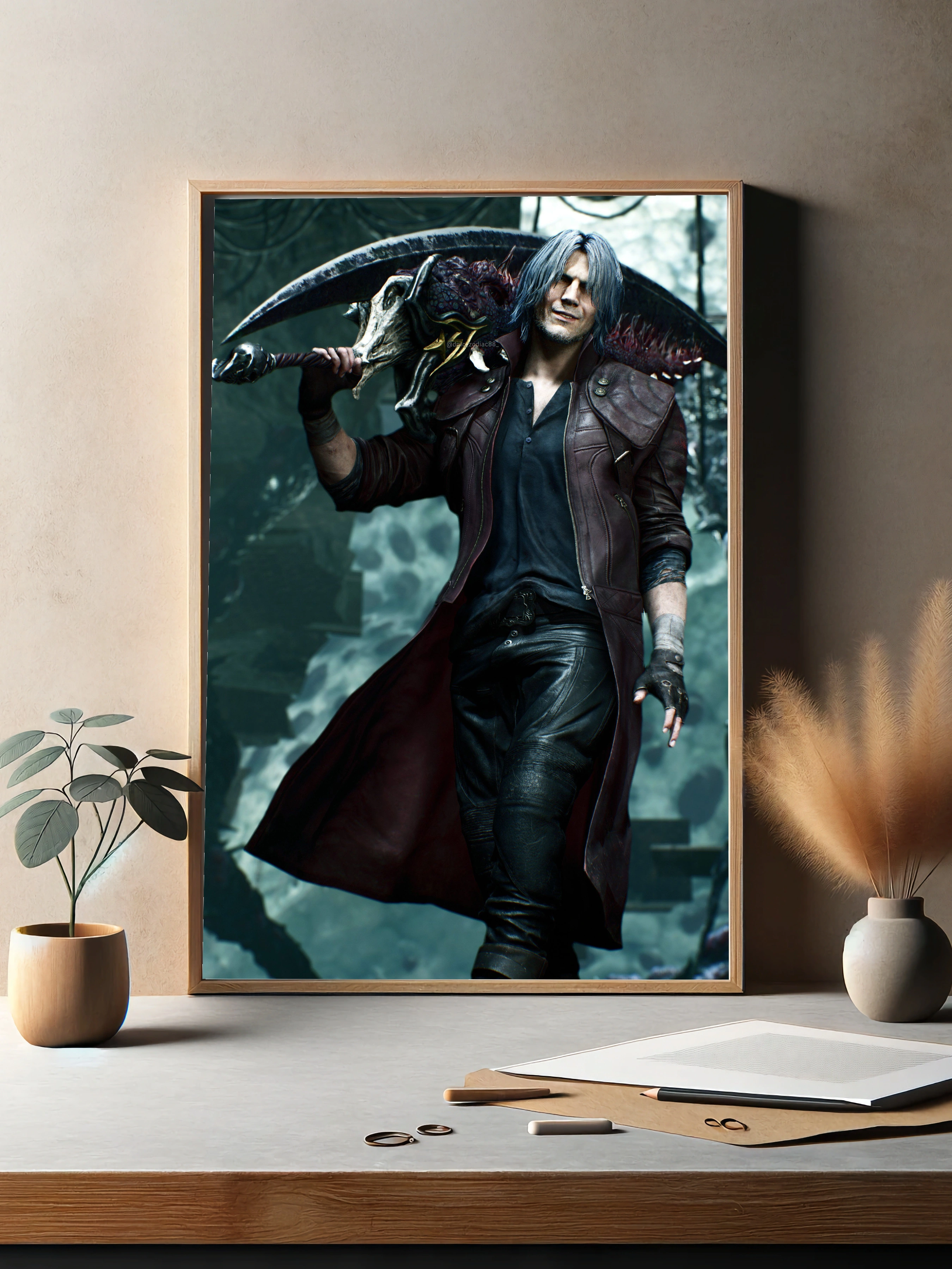 Изображение представляет собой детализированное цифровое искусство с персонажем Данте из видеоигры Devil May Cry. Герой одет в характерный бордовый кожаный плащ, черные штаны и перчатки. В руках он держит огромный меч с черепообразной рукоятью. Фон мрачный, с оттенками темно-зеленого и синего, создаёт атмосферу напряженности и мистики. Картина подходит для интерьера в стиле геймерской тематики, идеально для гостиной или офиса, как стильный декоративный плакат.