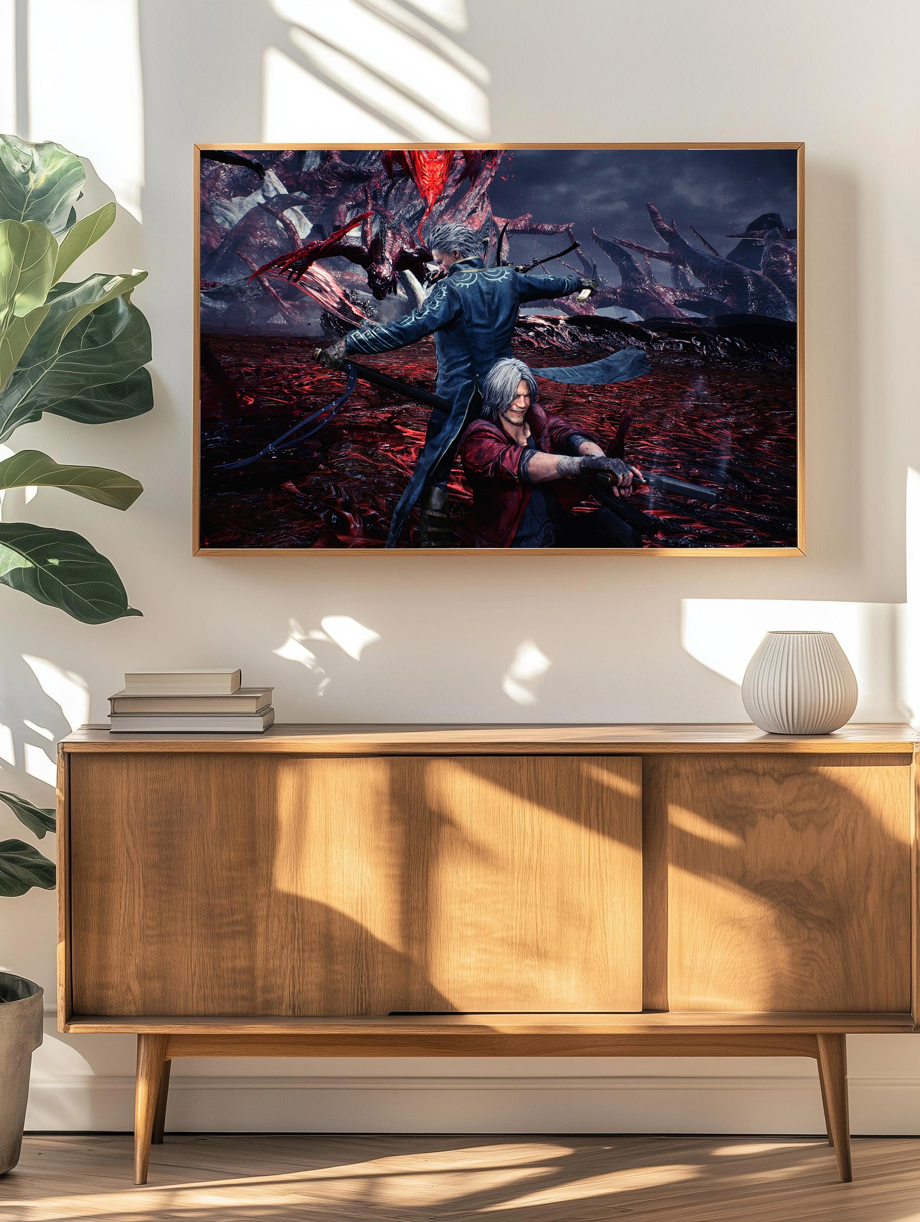 На фото сам постер уже под защитной пленкой рамки, потому чуть замыливает прекрасное качество печати . И в рамке есть небольшая "волна" холста. Исправлю позже))