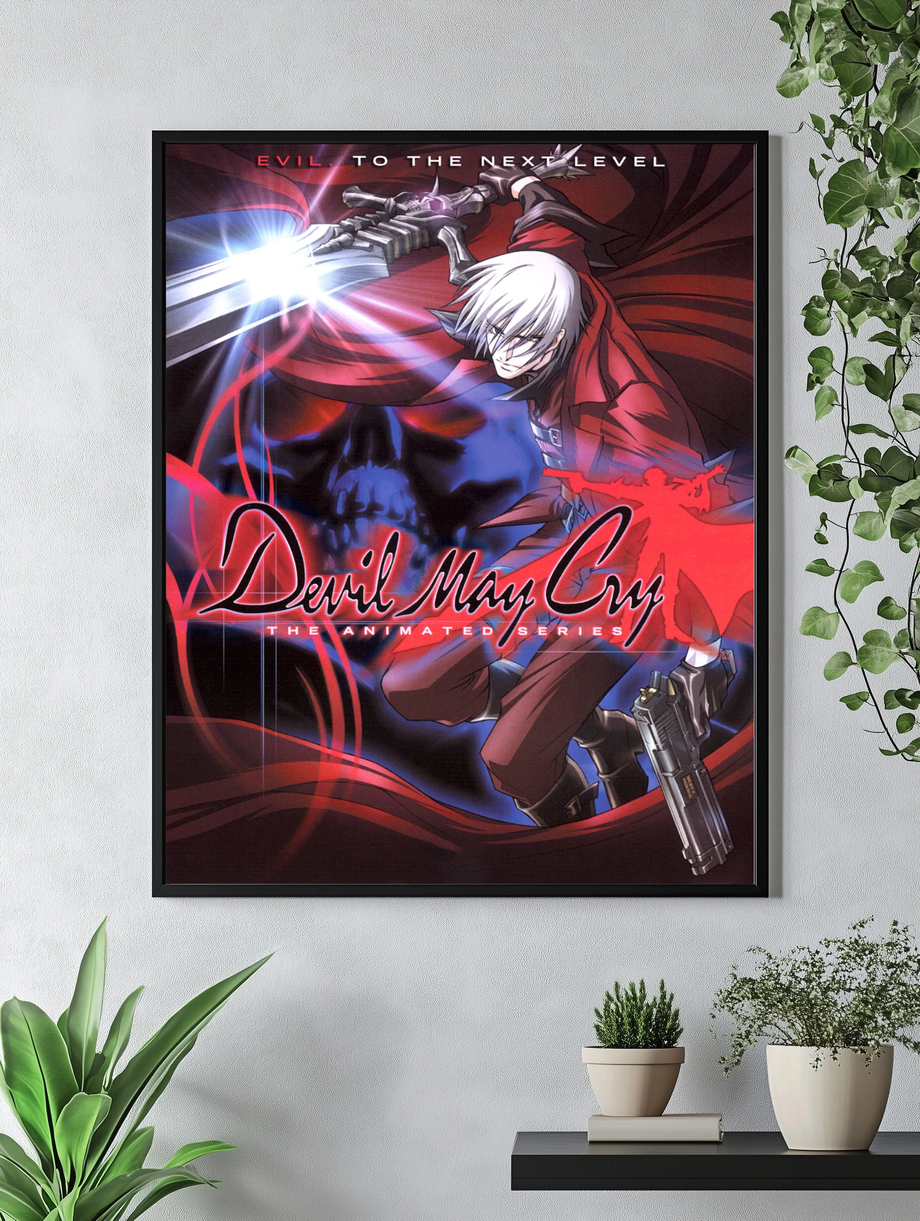 Изображение показывает персонажа Данте из аниме-сериала Devil May Cry в динамичной боевой позе с огнестрельным оружием и мечом. Фон темный с красными и синими вспышками, создающими атмосферу напряженности и мистики. Стиль аниме с ярким, контрастным цветовым решением, идеально подходит для современного интерьерного искусства, стильного декора стен или художественного постера на холсте.
